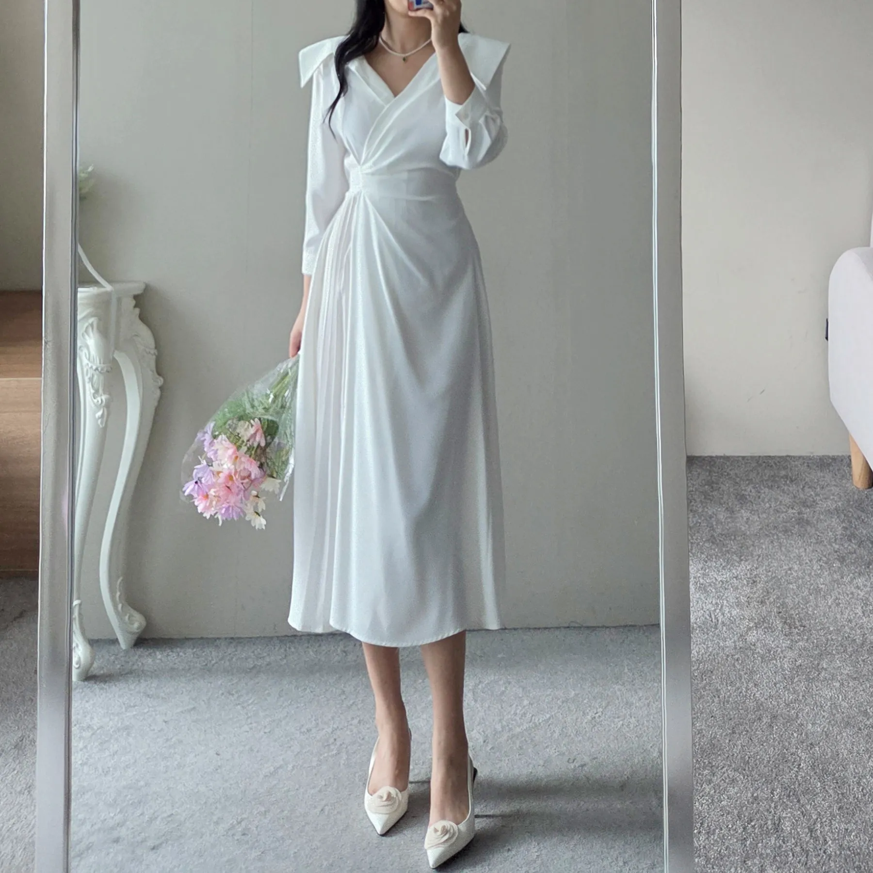 Uネック長袖フレアワンピース