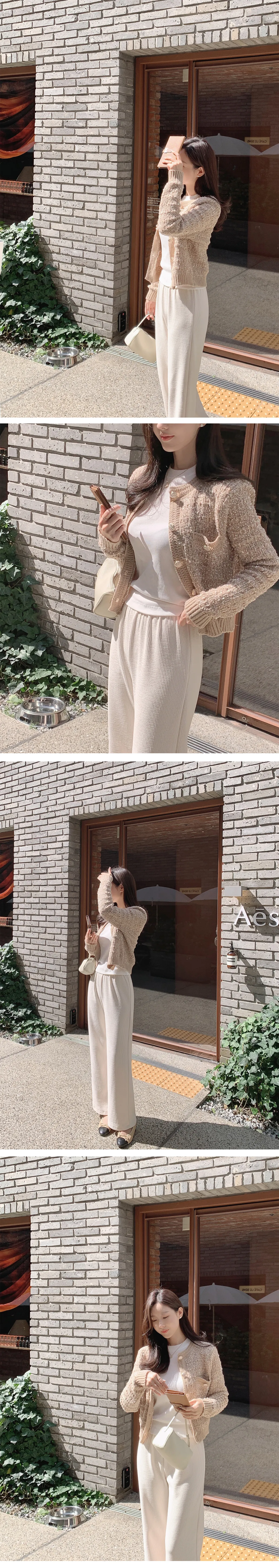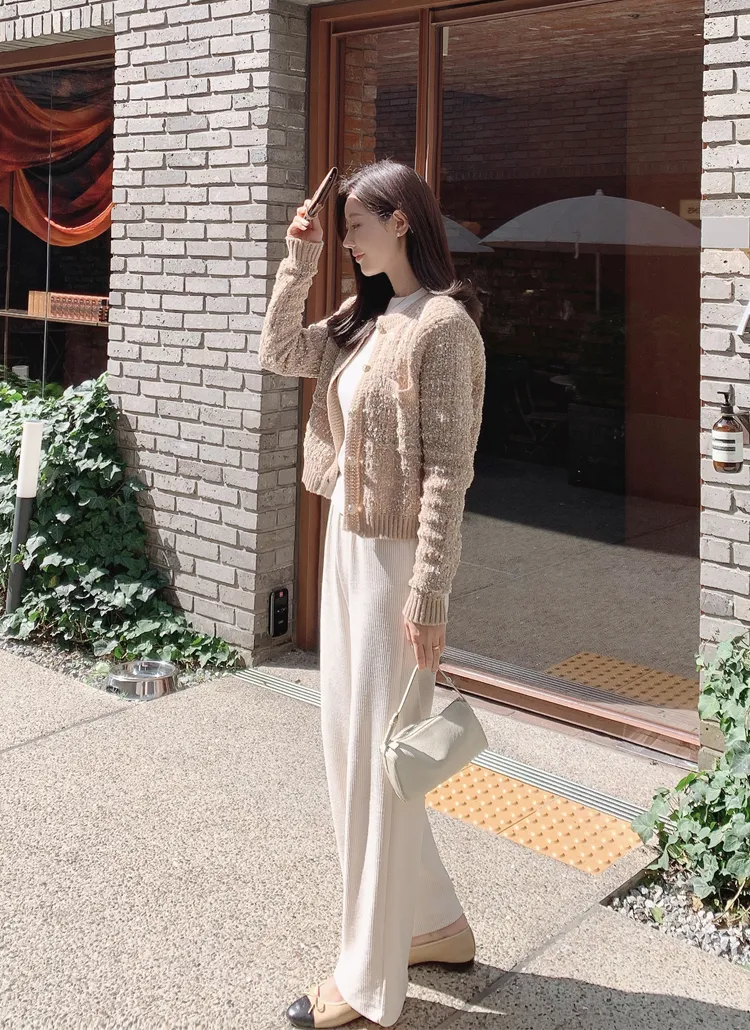 ツイード長袖ラウンドネックビジューボタンカーディガン