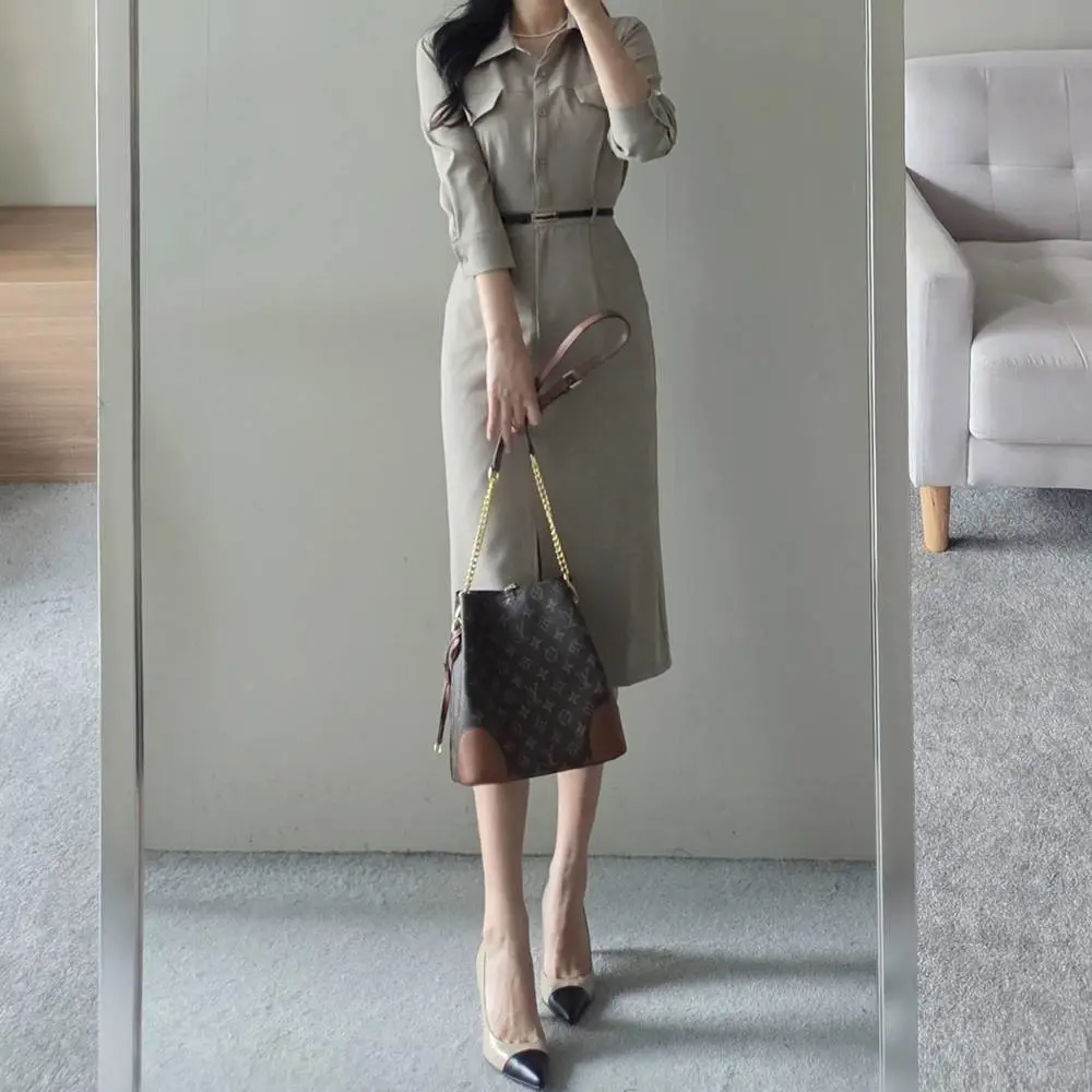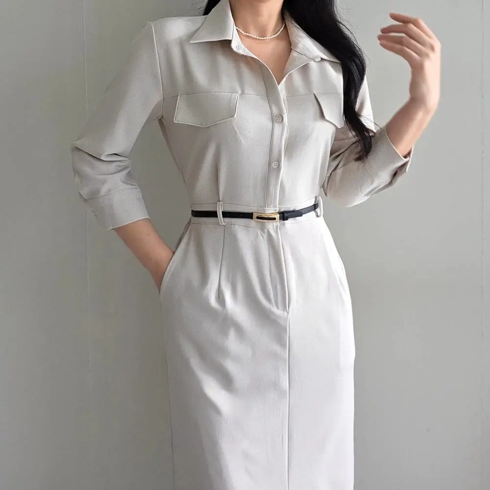 ベルト付ボタンカラーロング長袖フレアワンピース