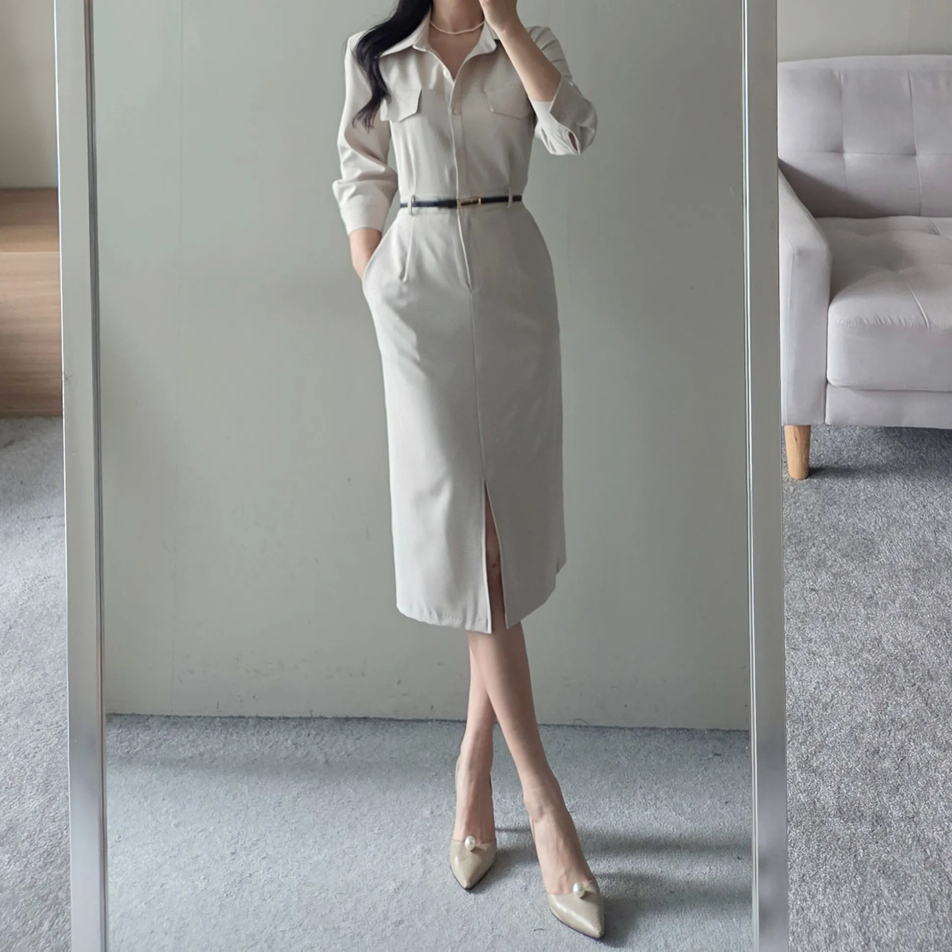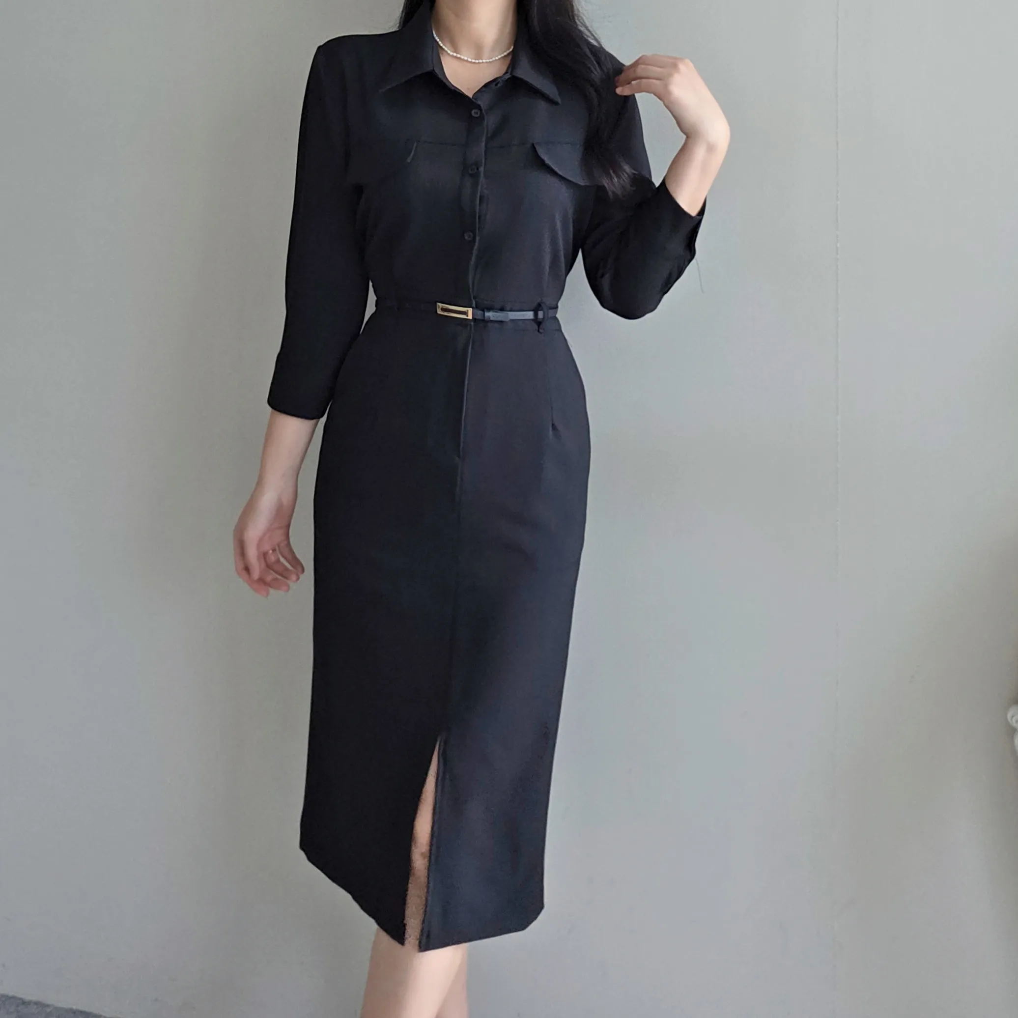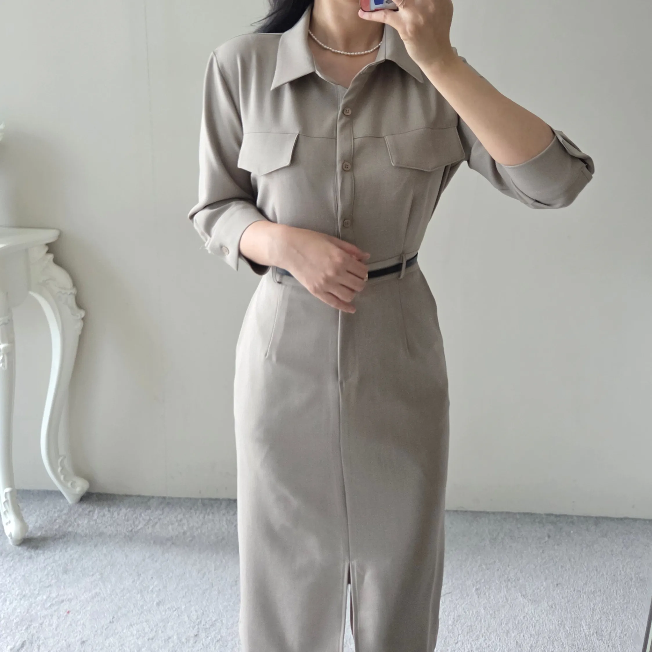 ベルト付スリットフェイクポケットバックゴムシャツワンピース・S1939806