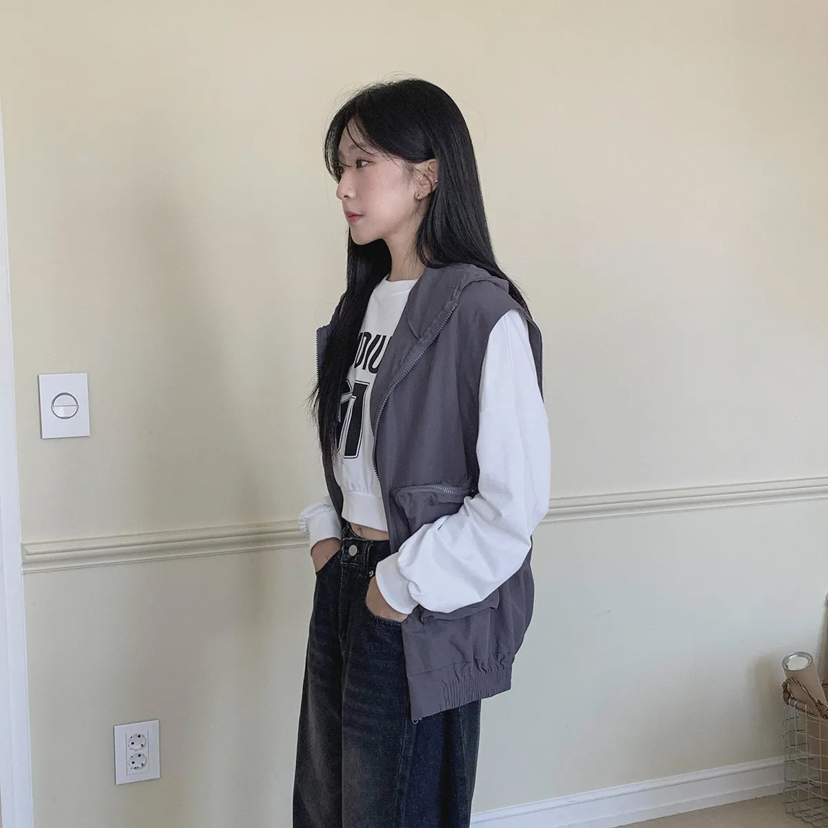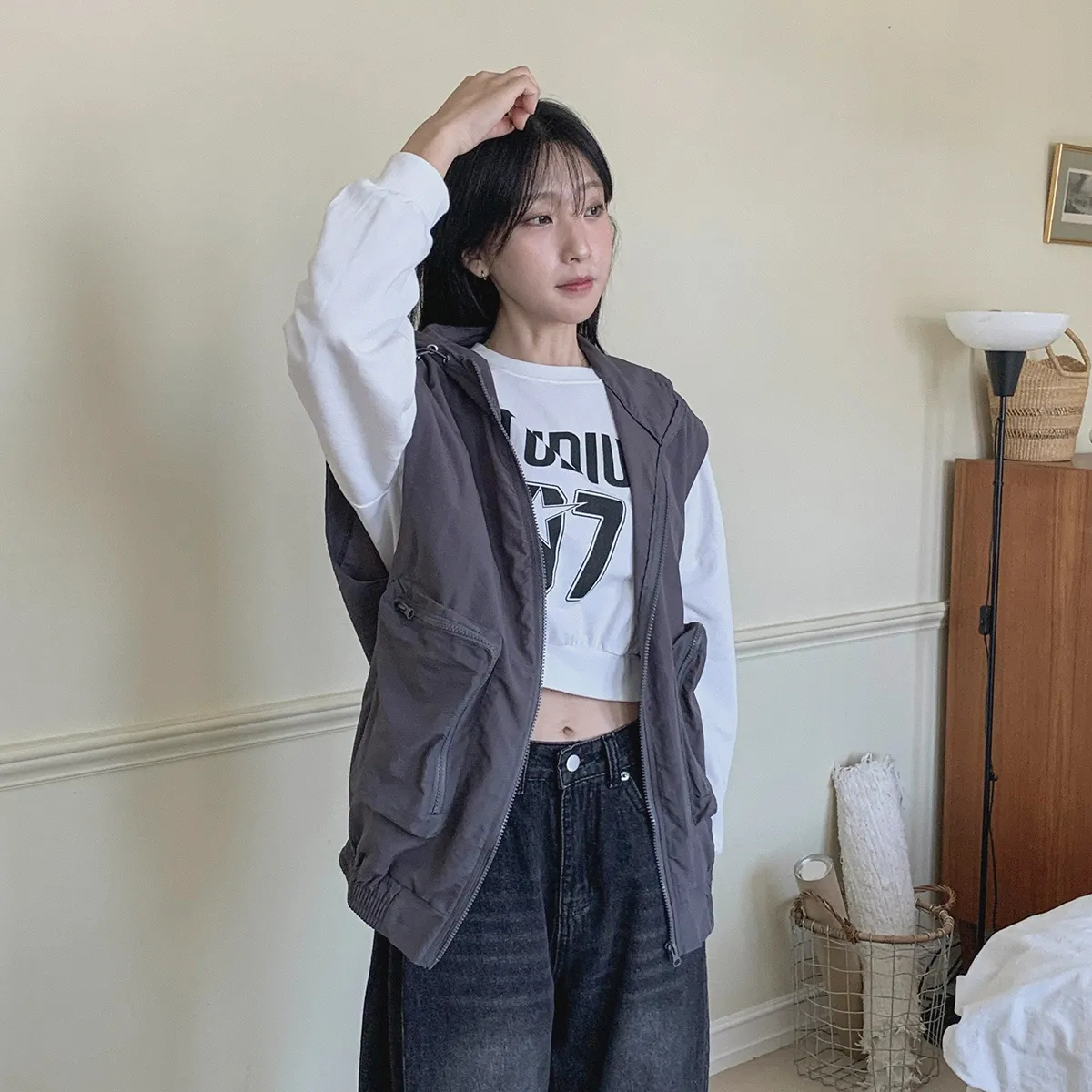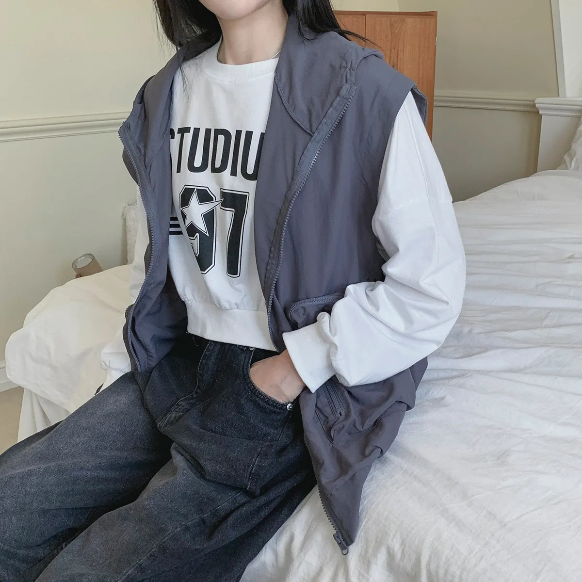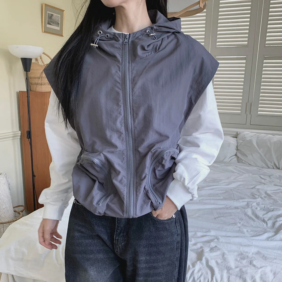 ジップアップフードドローストリングポケットボクシールーズベスト・S1939994