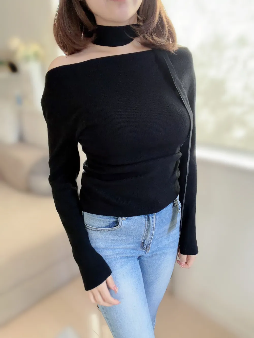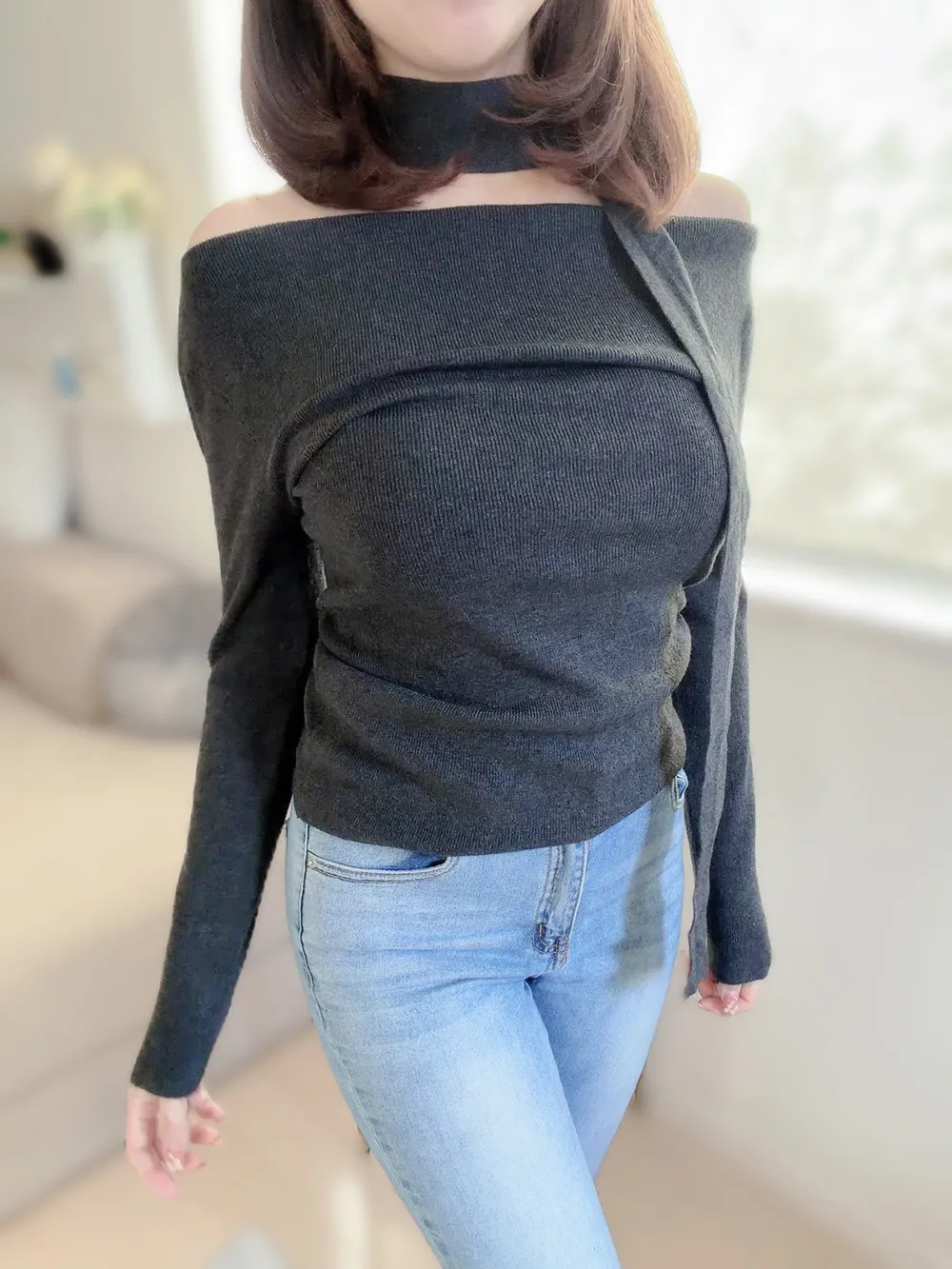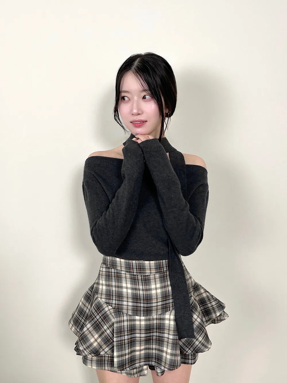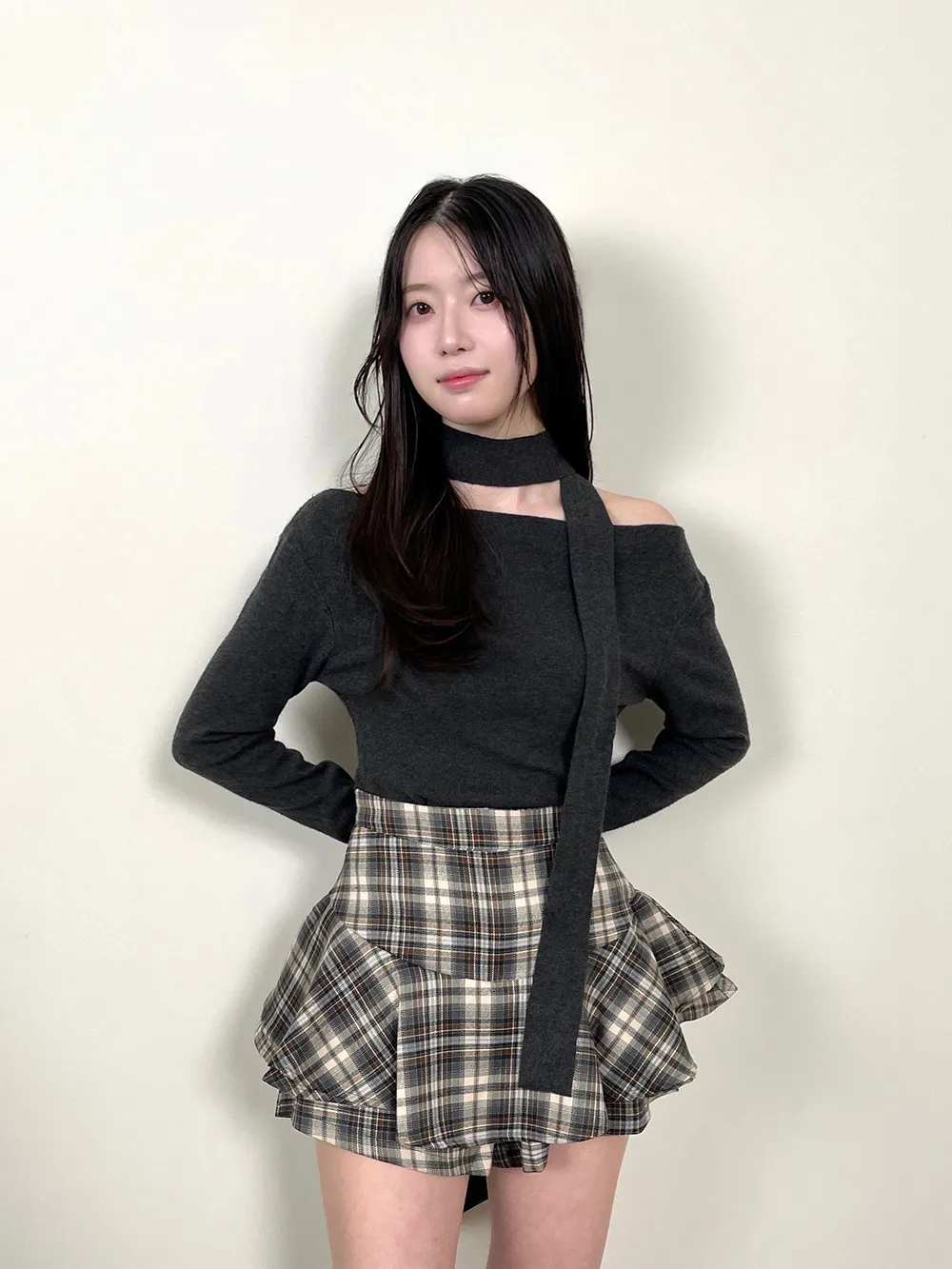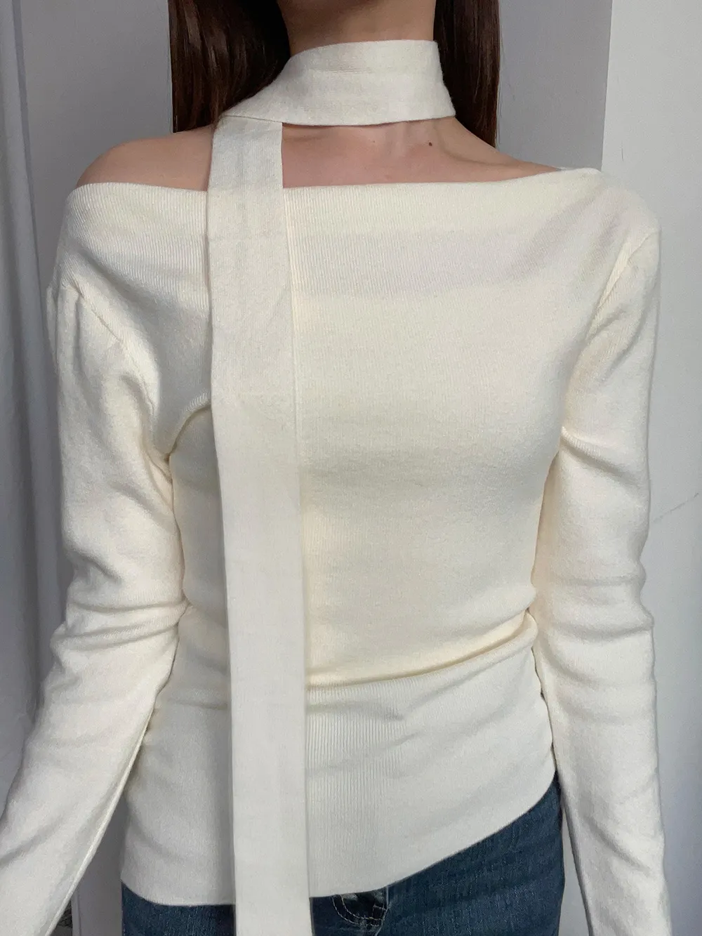 肩見せデザインで女性らしさを引き立てつつ、首元にはスカーフ風のデザインをプラス。