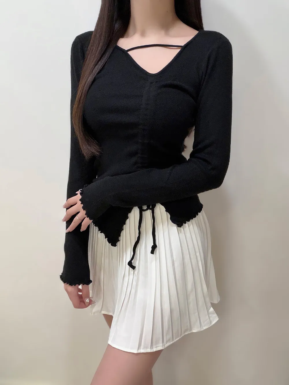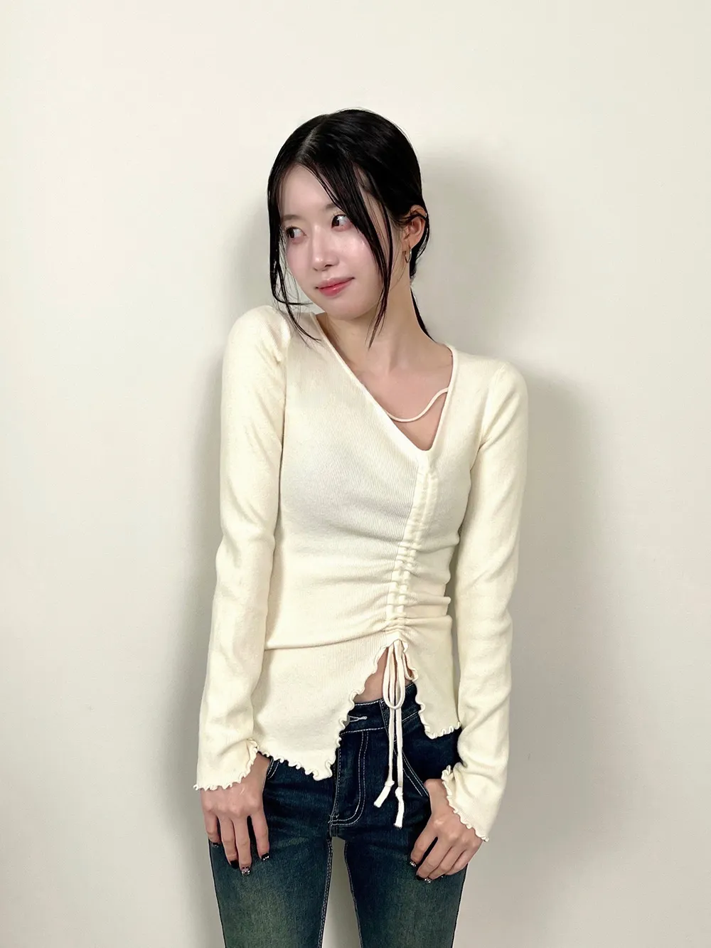深めのVネックでデコルテをすっきり見せ、インナー次第でカジュアルにもフェミニンにも着回し可能。