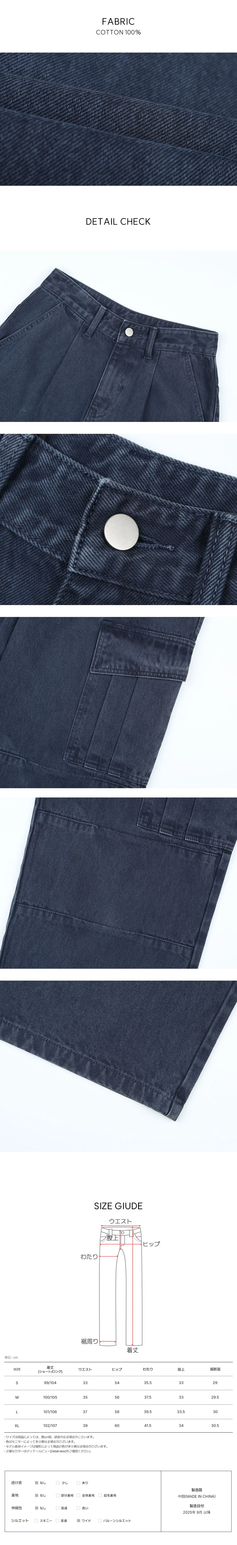 Size | ウエスト | ヒップ | 裾幅 | わたり | 股上 | 着丈 |