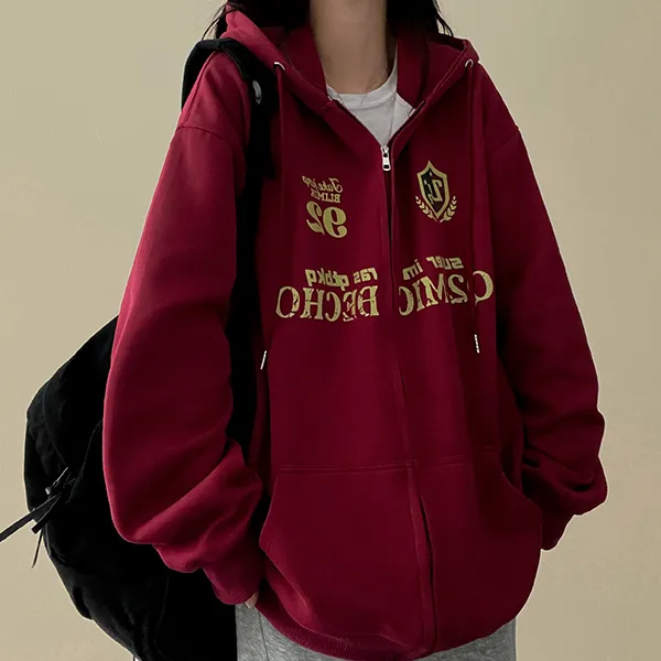 フードダブルジップボクシールーズ長袖刺繍ジップパーカー