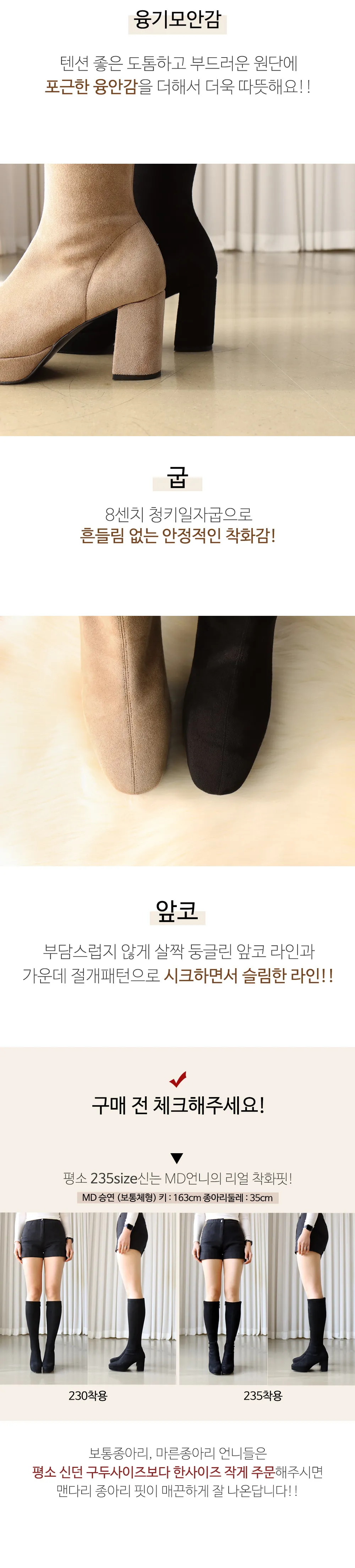 Size | 足幅 | 高さ | ヒール | 前底厚さ | ふくらはぎ幅 | 履き口幅 |