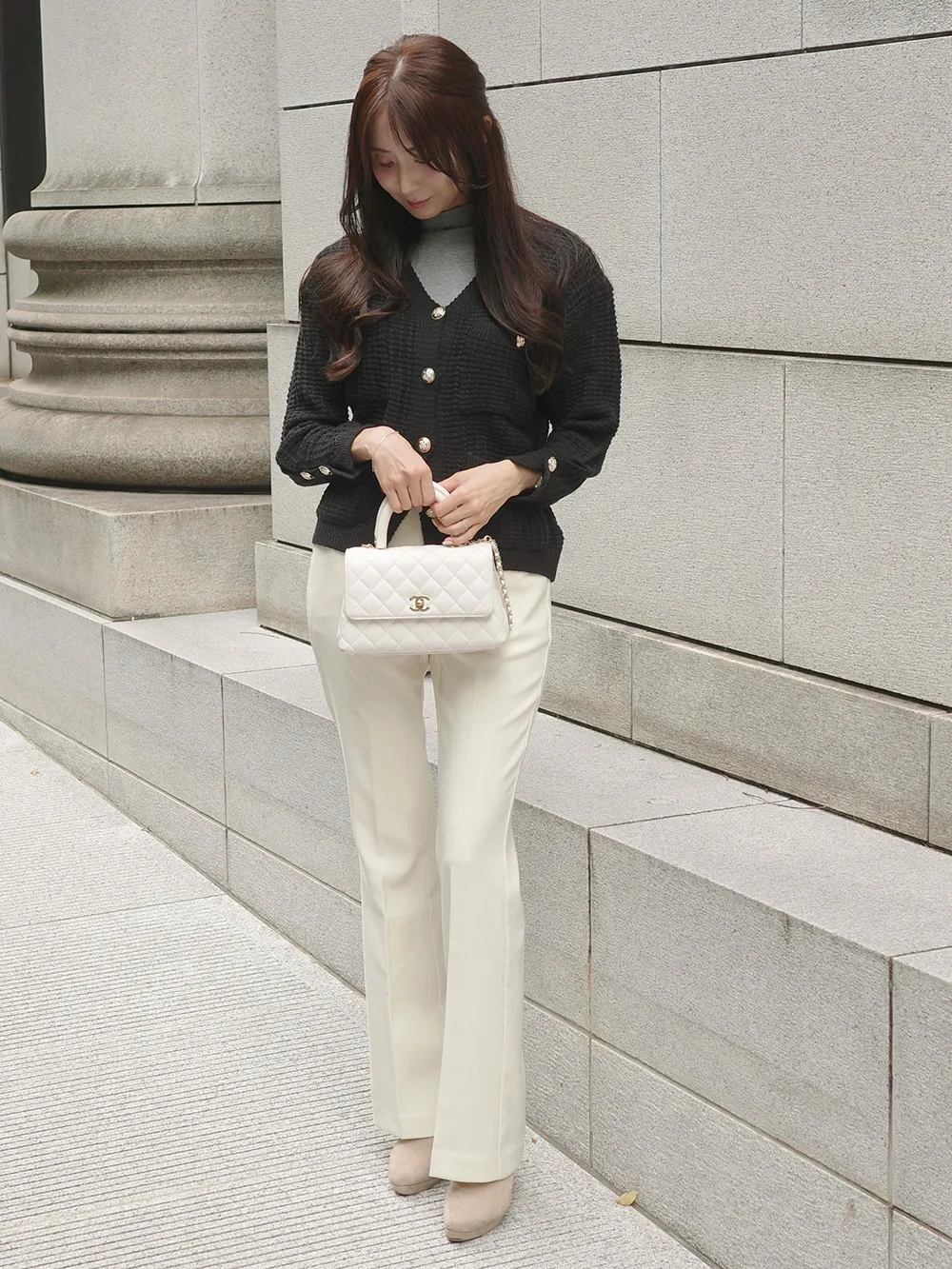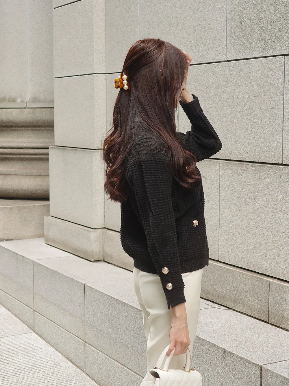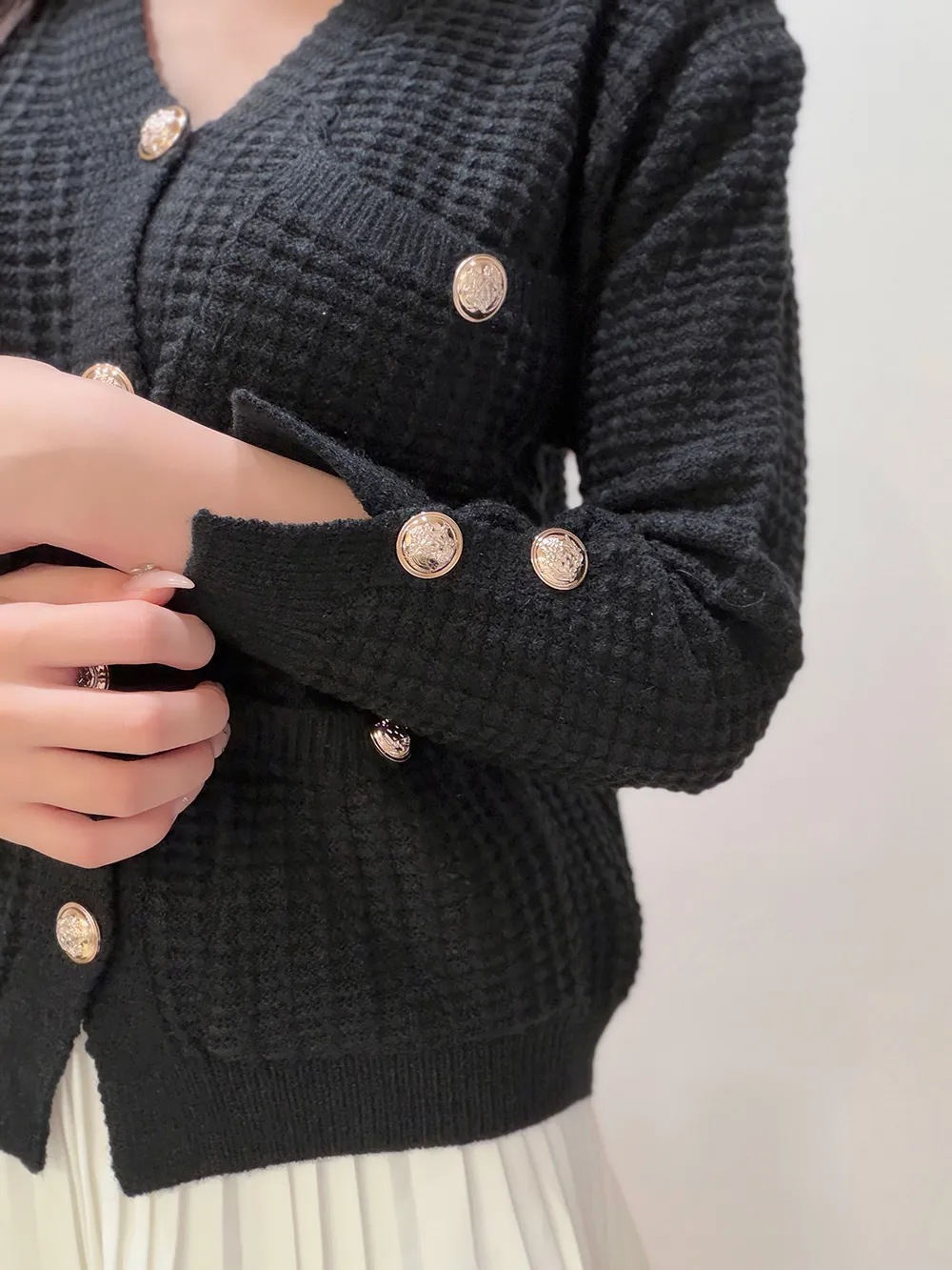 上品なパールボタンがポイントのワッフル編みカーディガン。