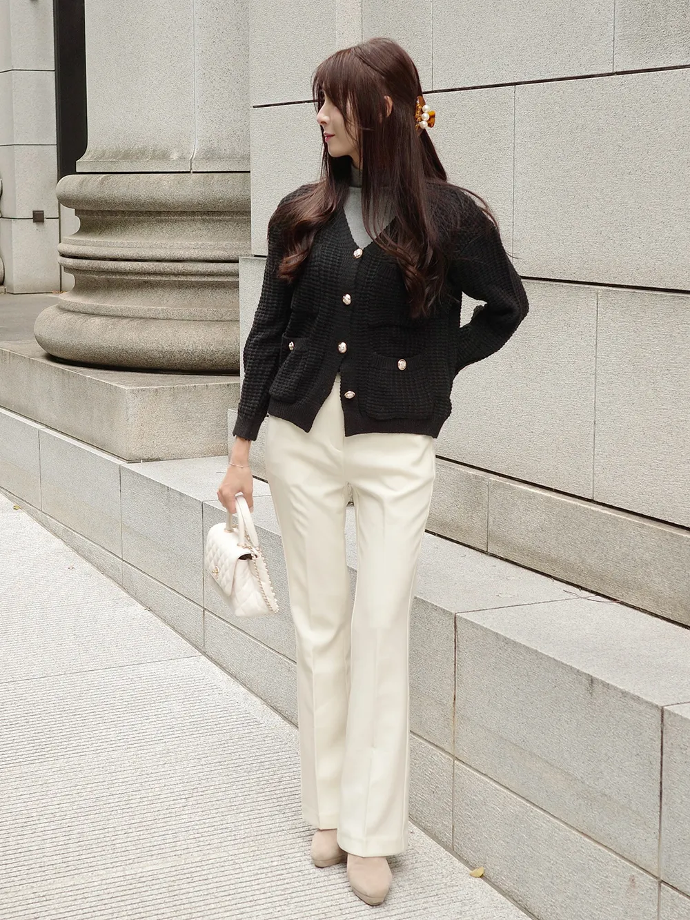 ラウンドネックエコパールカーディガン