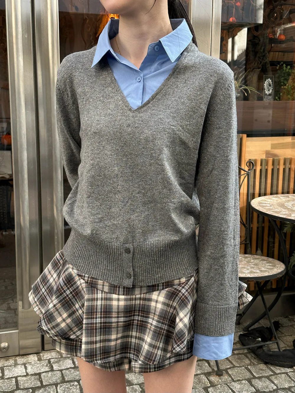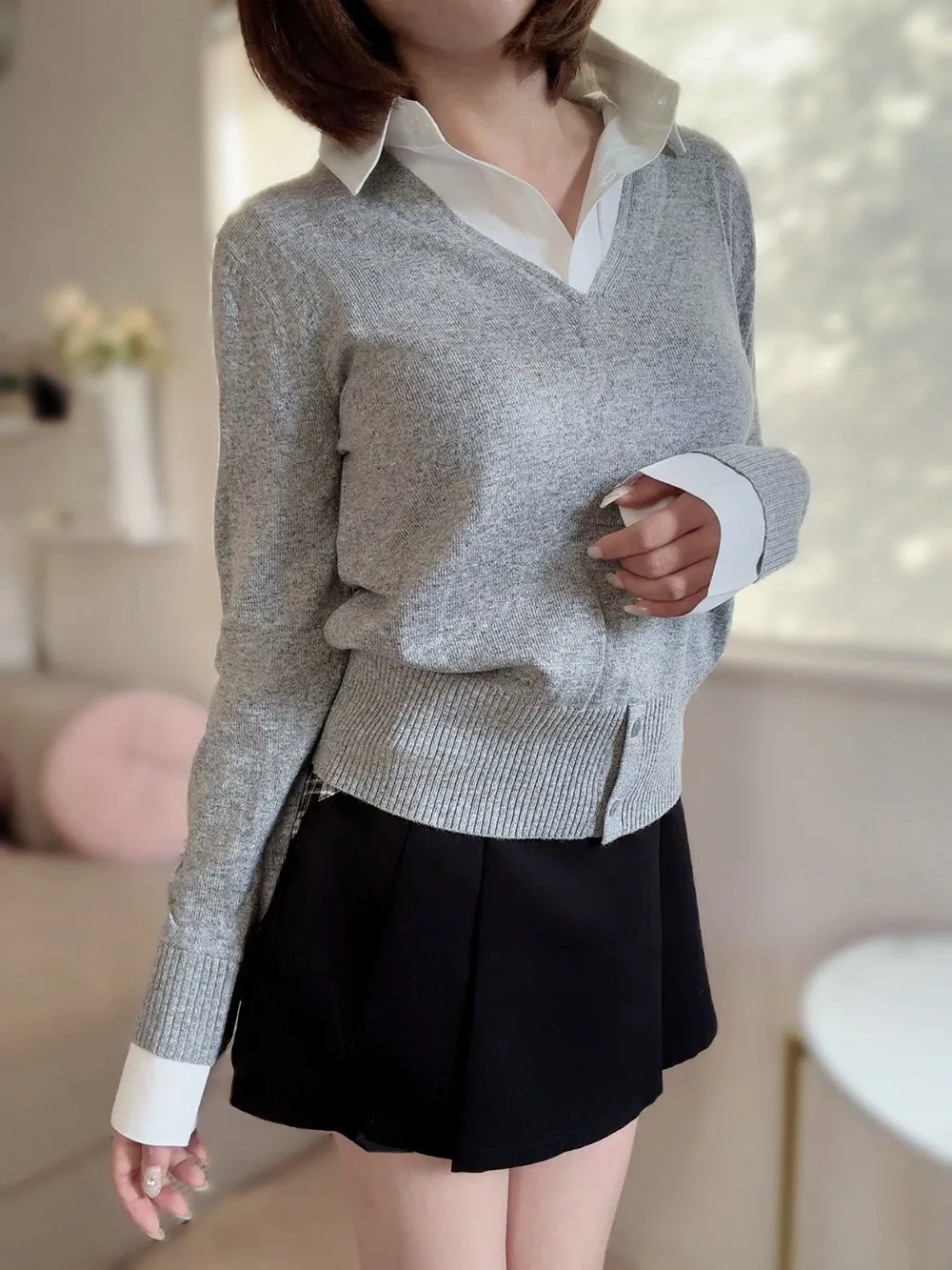 シャツとニットがドッキングされたレイヤード風デザイン。