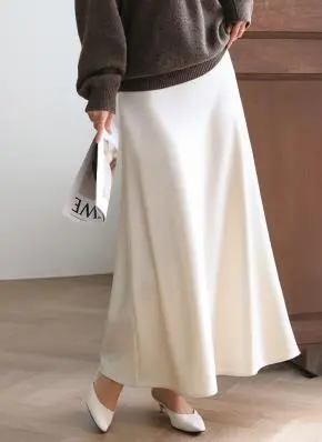シルク混ロングウエストゴム無地スカート