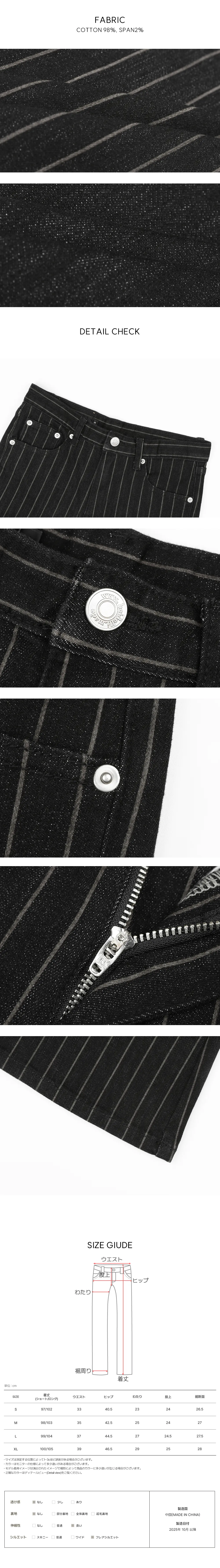 | XL | 39 | 46.5 | 28 | 28 | 25 | 100/105(ショート/ロング) |
