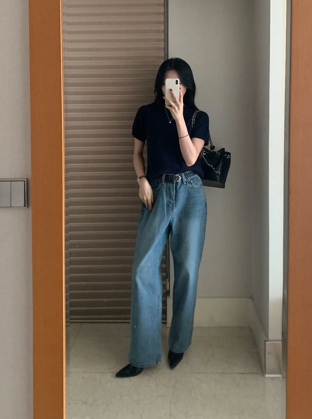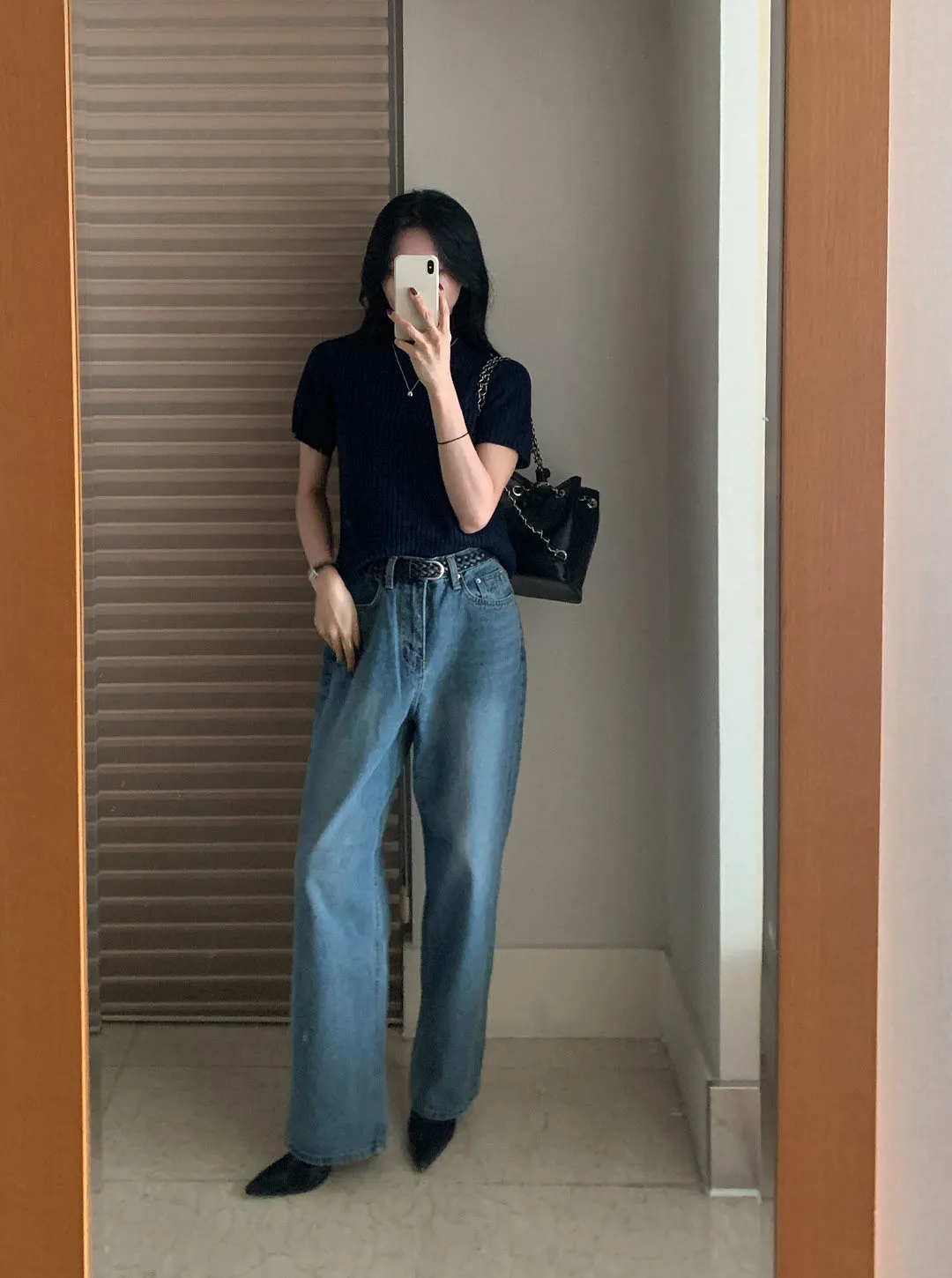 コットンハイウエストストレートディープブルーデニムパンツ