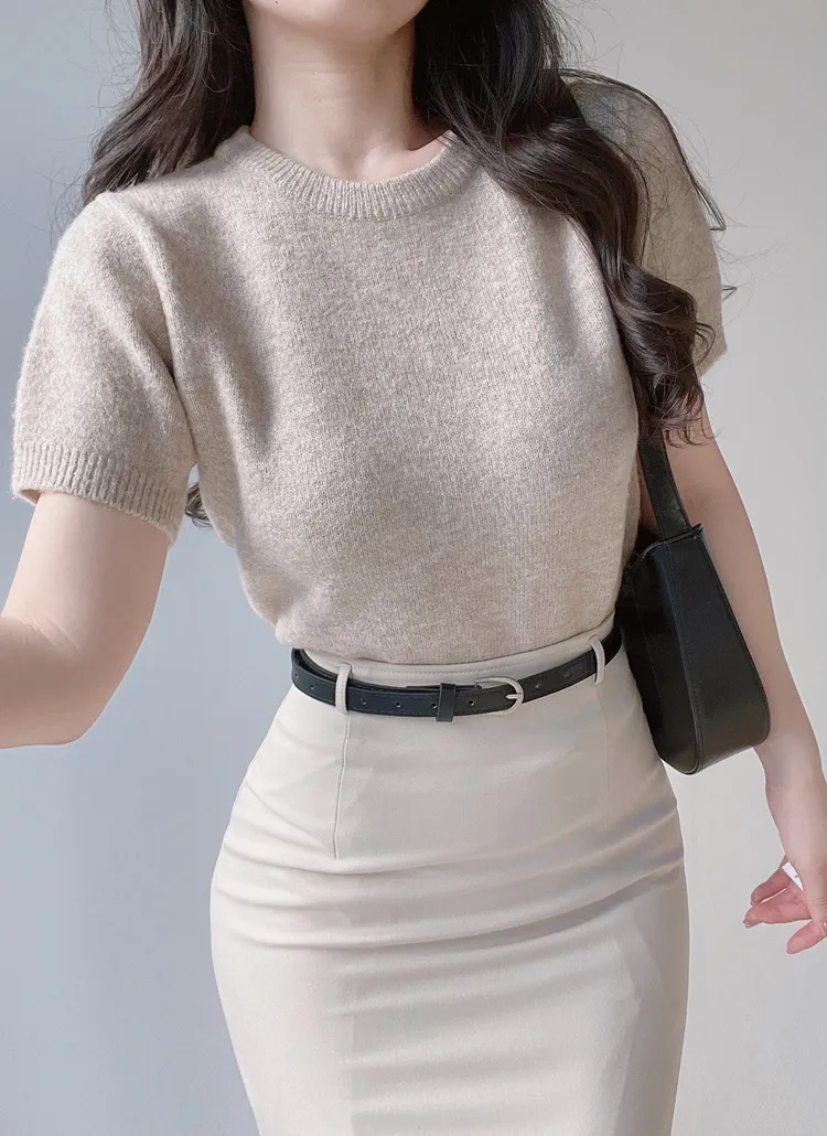 メルトンタッチラウンドネックシンプルベーシック半袖無地ニット・S1944905