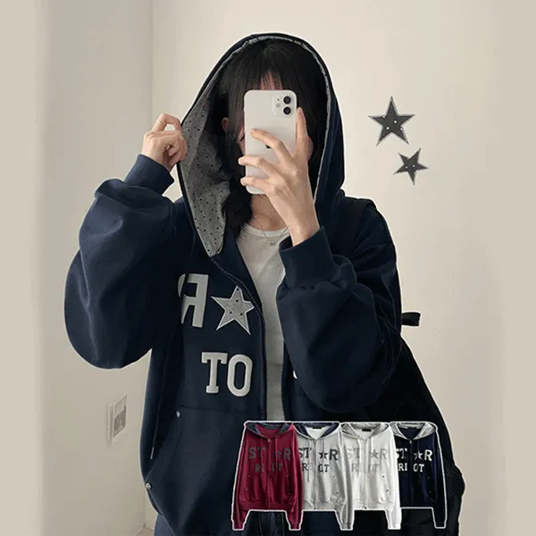 コットンフードポケットドロップショルダーダブルジップ長袖ルーズドローストリングプリント配色ドット星柄ジップパーカー
