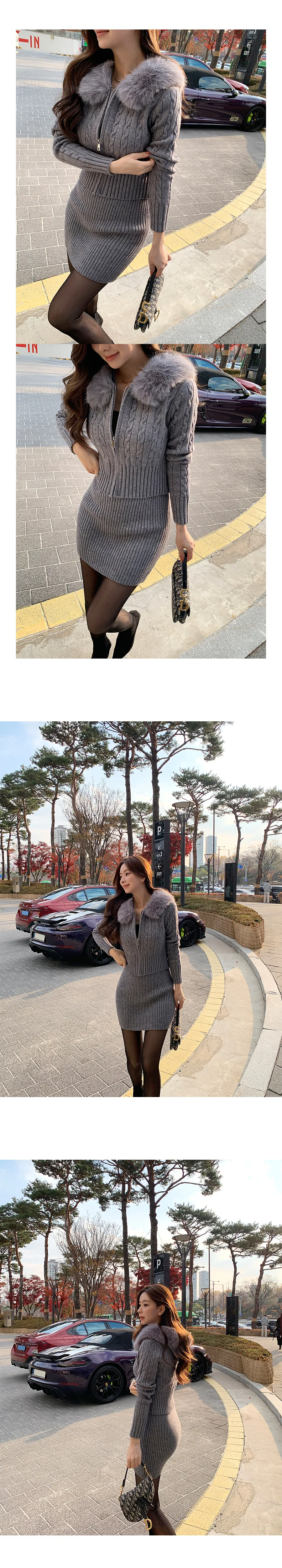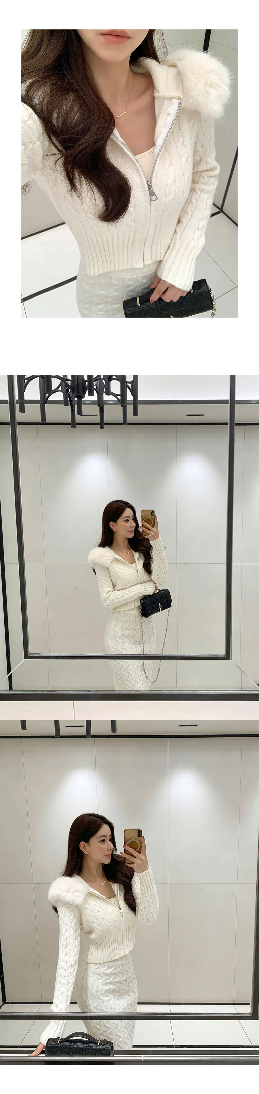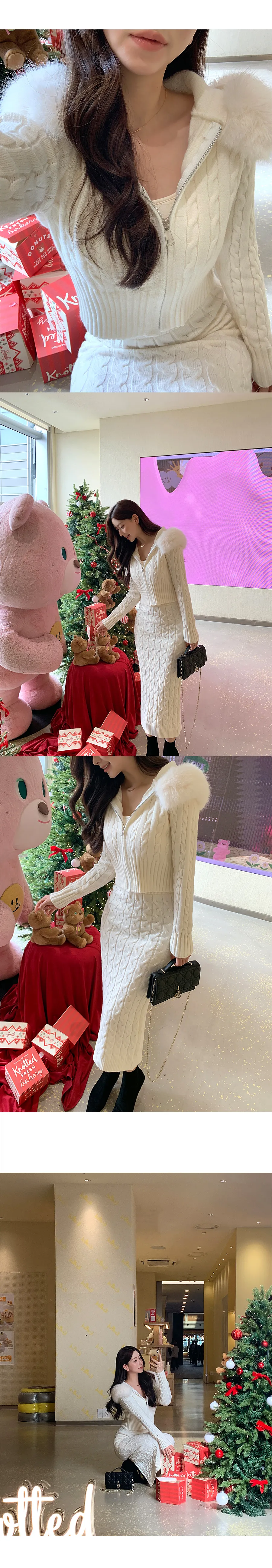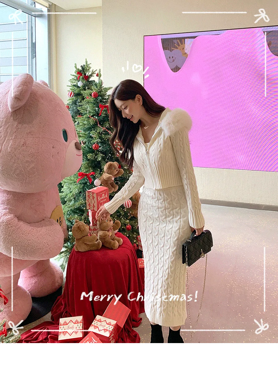 ツイードラウンドネックプリーツハイウエスト肩パッドクロップド長袖ミディツーポケットAラインホックヒドゥンジッパー配色ツーピース(トップス、ボトムス)スカートジャケット