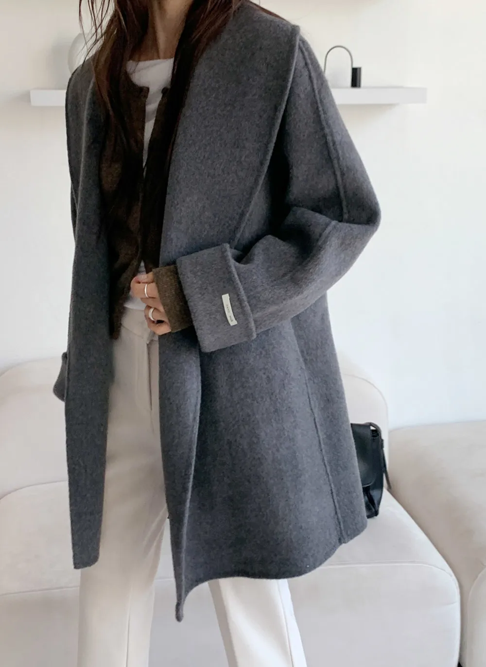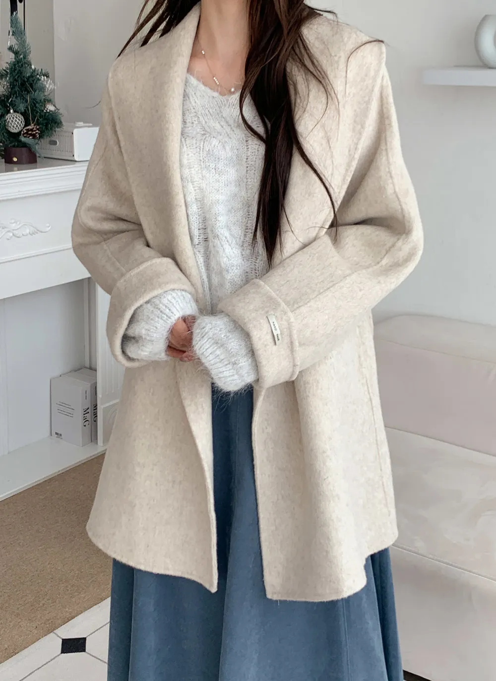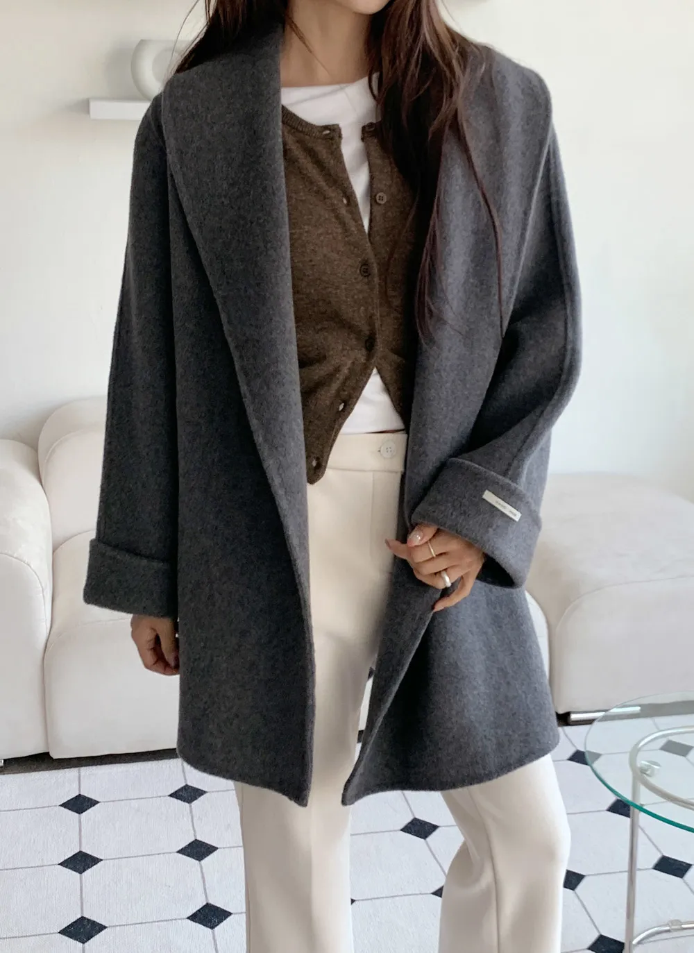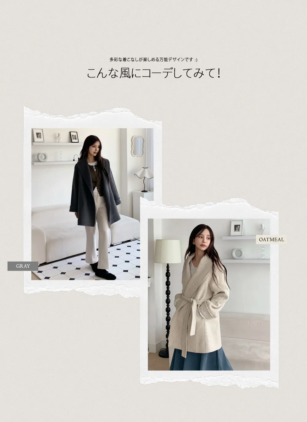 - 広いショールカラーデザインで顔が小さく見える効果