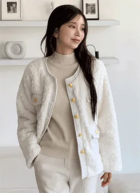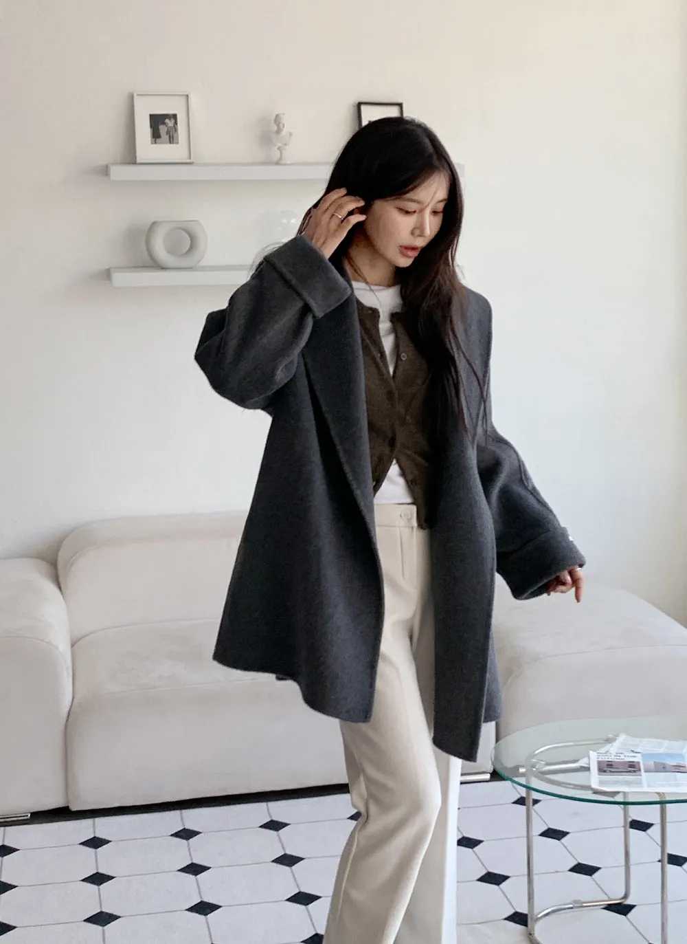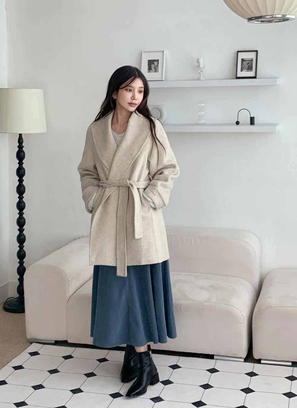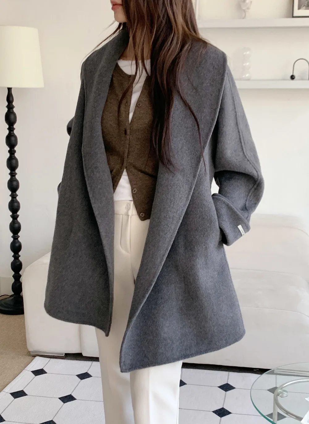 - 広いショールカラーデザインで顔が小さく見える効果
