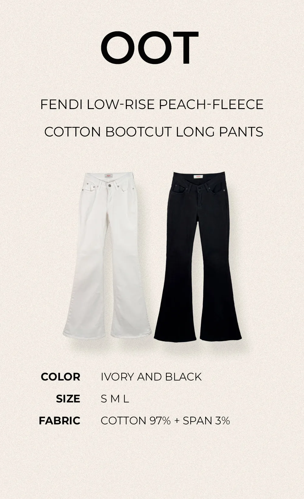 | Size | ウエスト | ヒップ | 裾幅 | わたり | 股上 | 着丈 |