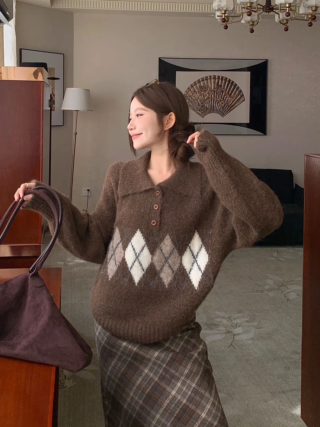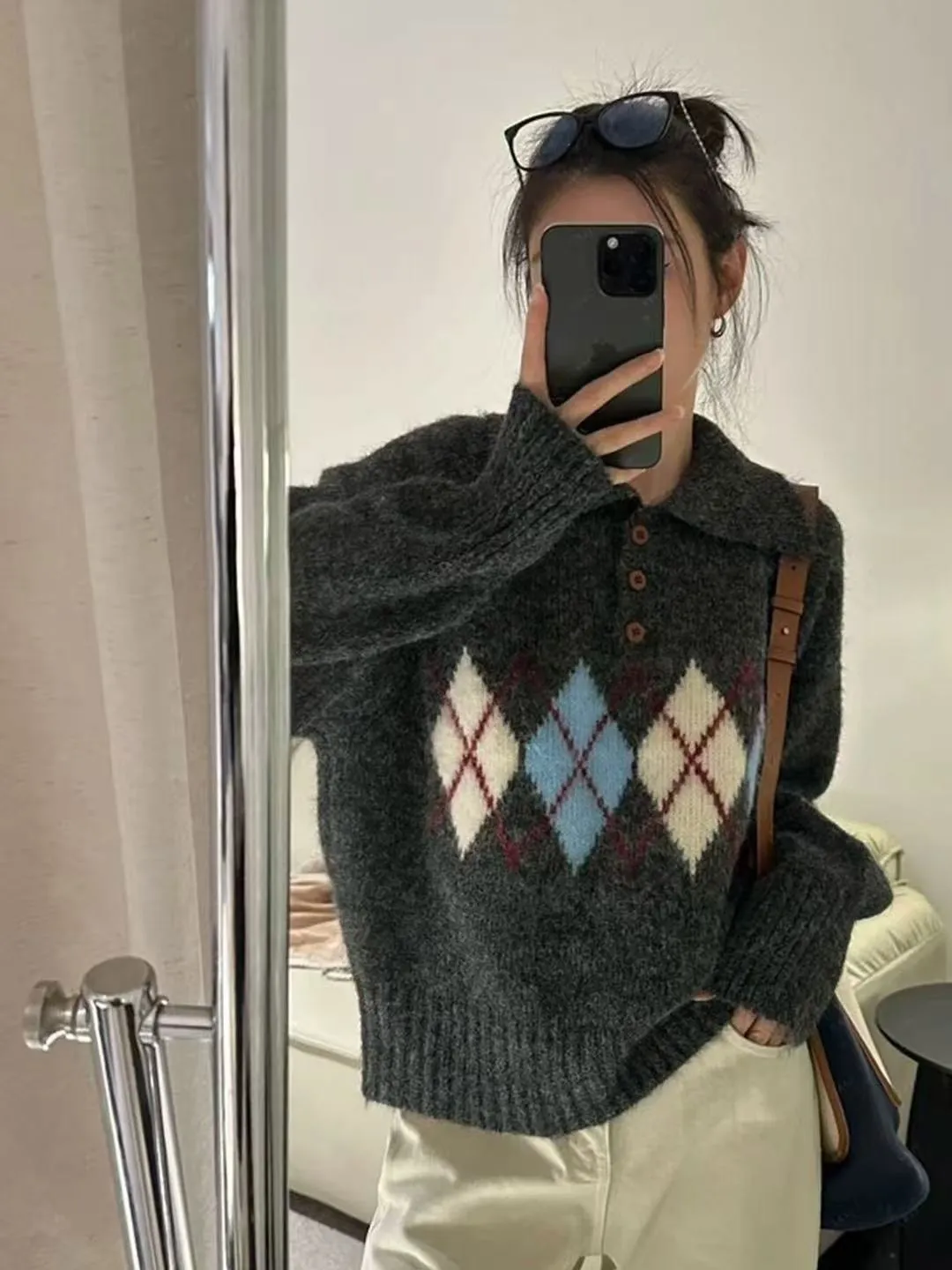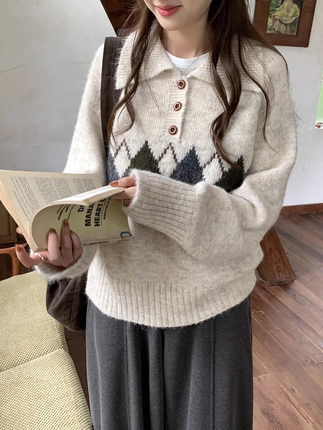 ウール混ボタンカラー長袖アーガイルニット・B1950238