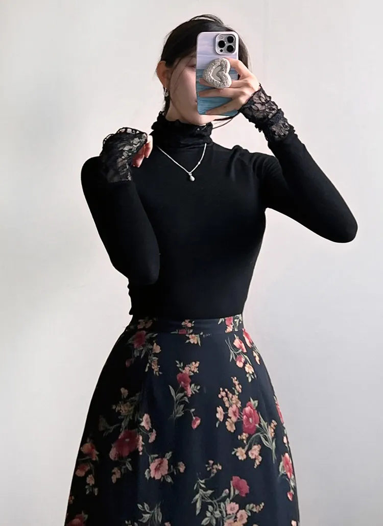 ストレッチコンビスリム長袖タートルネックレースニット