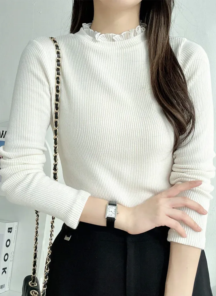 裏起毛ビーズレースハーフネックスリムニット