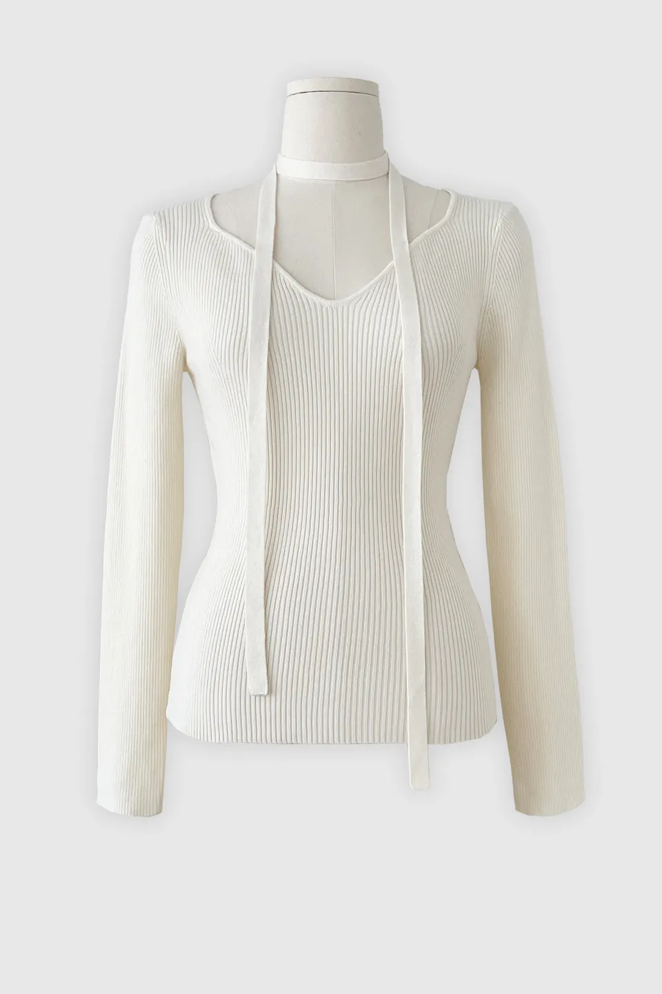 ユニークでフェミニンなネックラインとおしゃれなディテールが引き立つスリムフィットニットです。