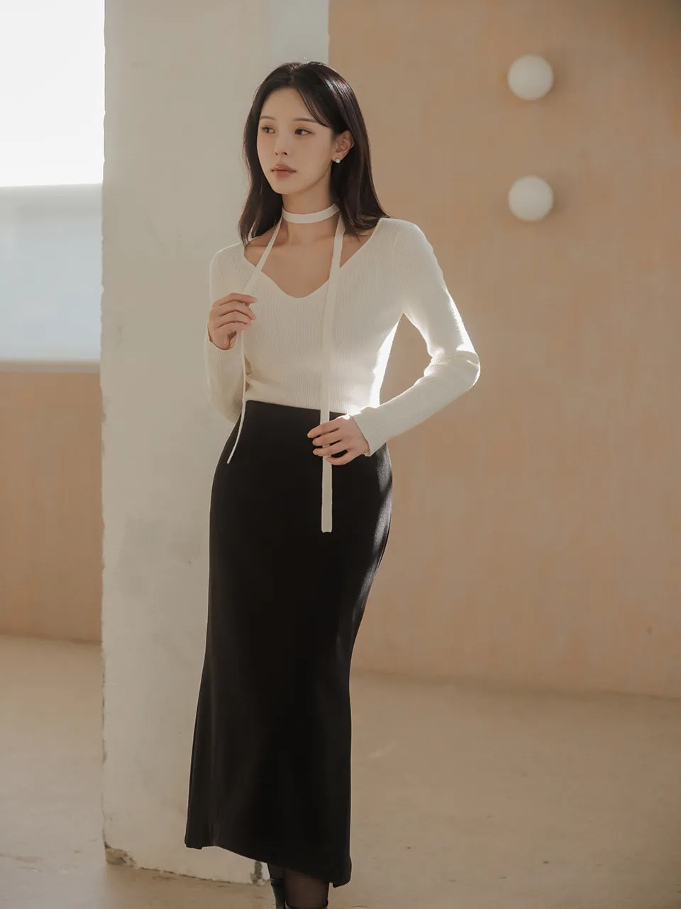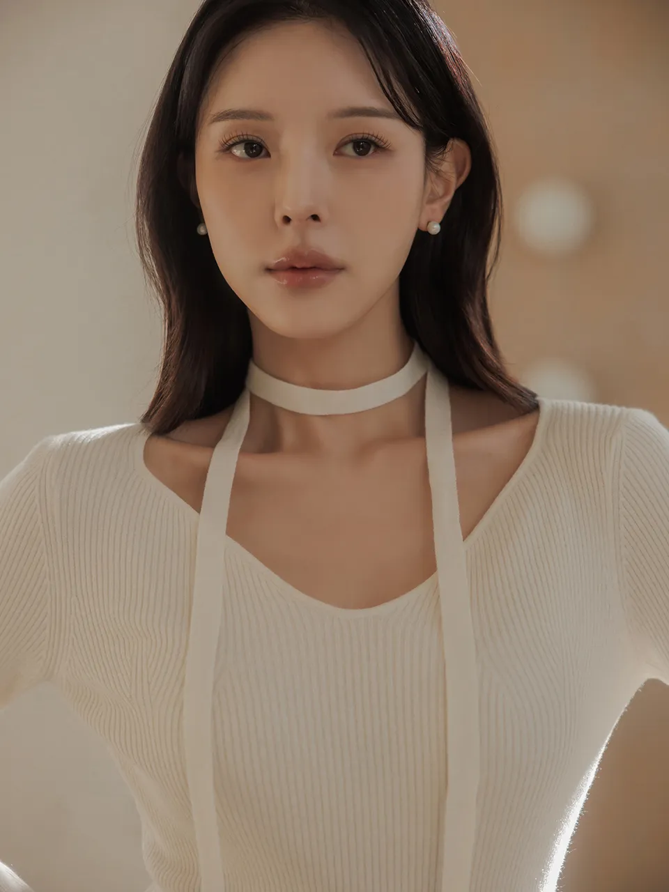 フェミニンなネックラインで優雅なネックラインと鎖骨ラインを演出