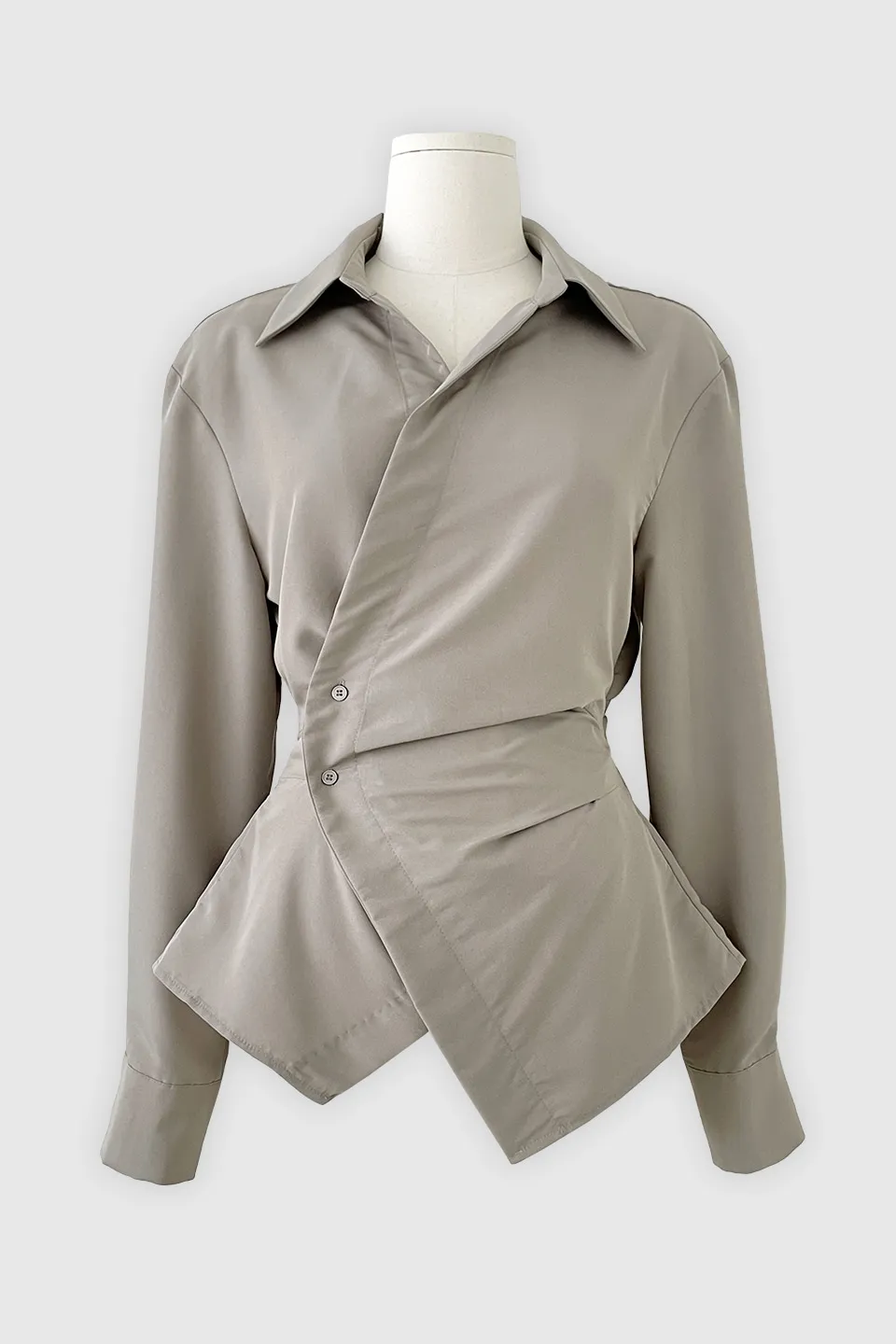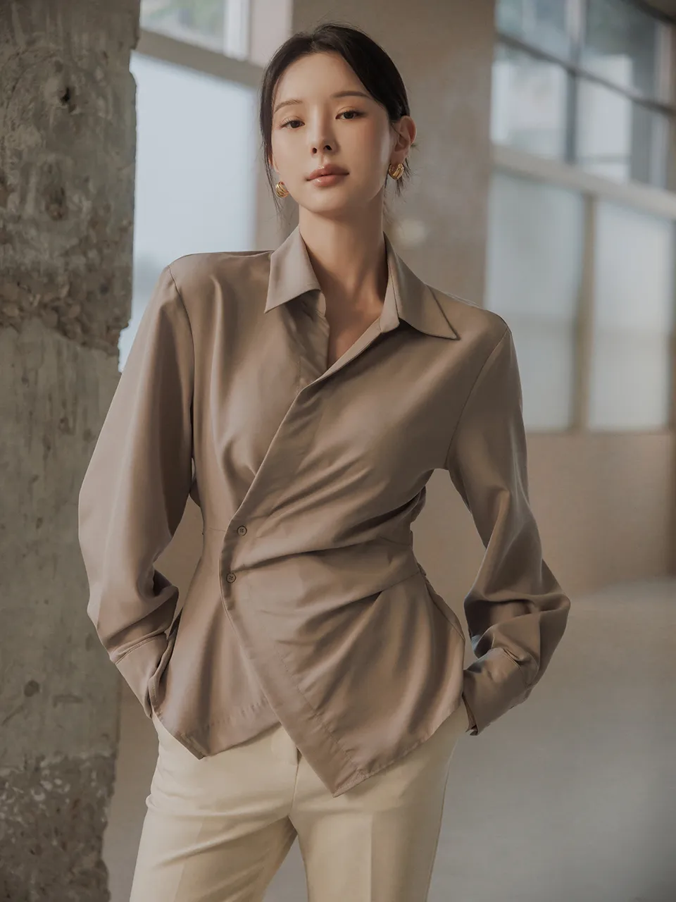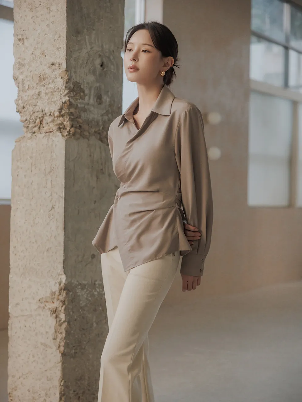 柔らかなタッチ感とフェミニンなラインが引き立つラップブラウスです。