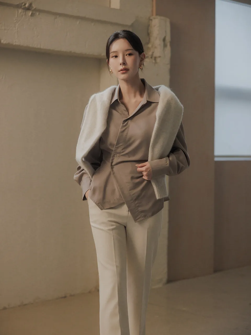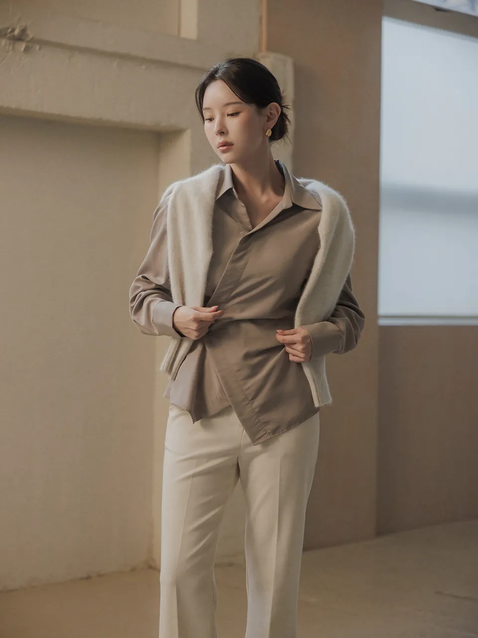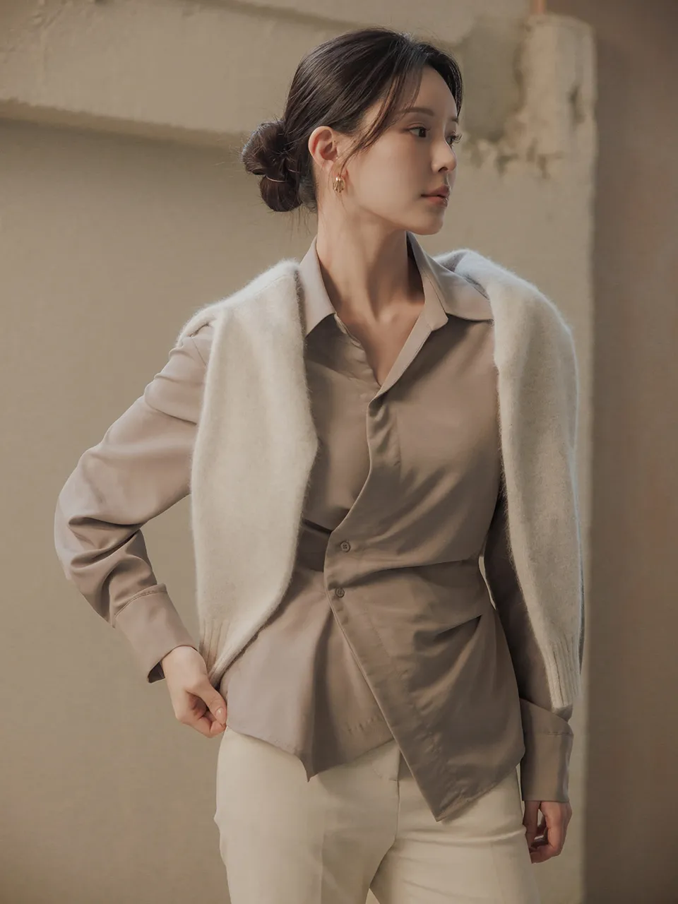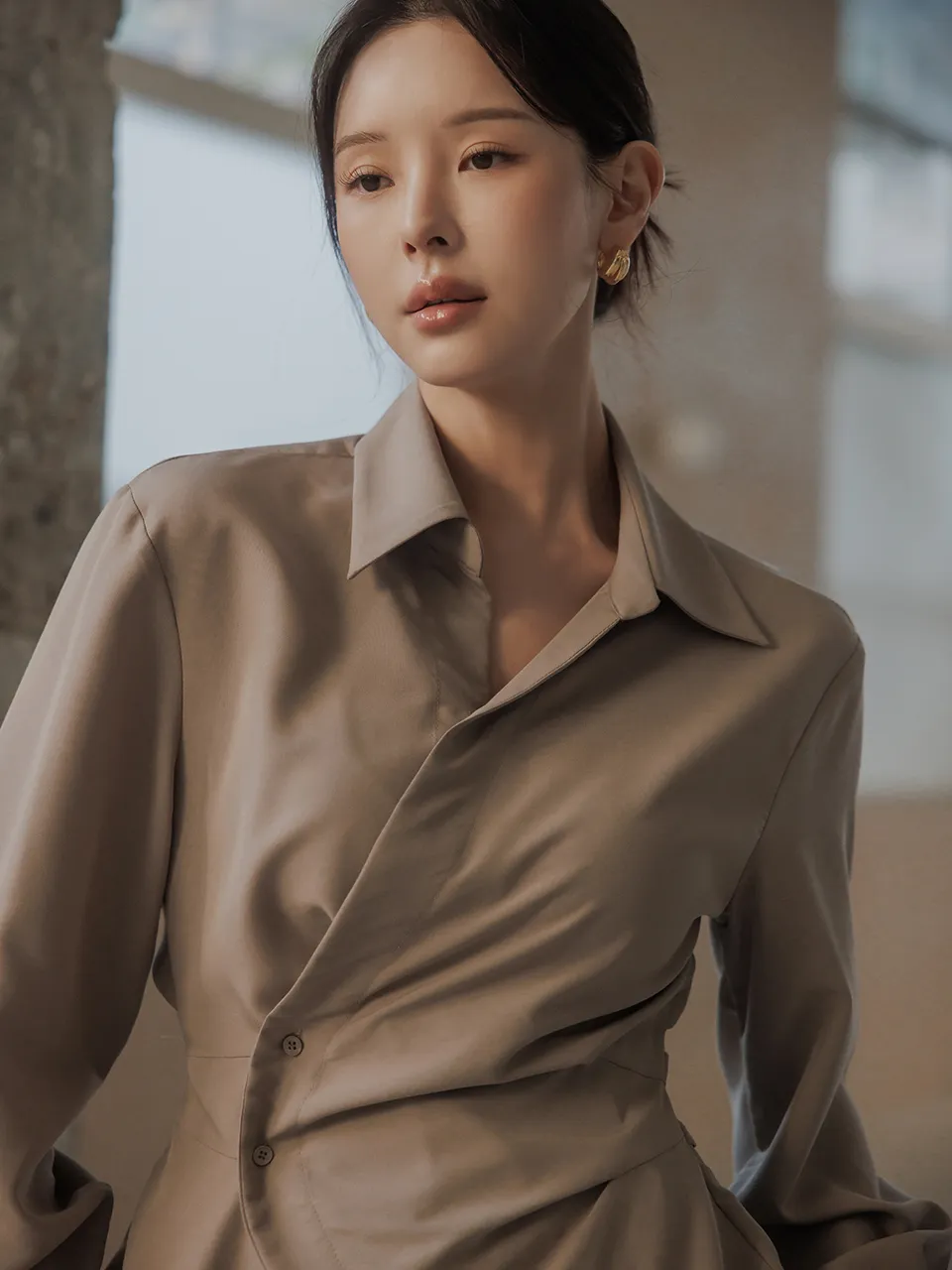 柔らかなタッチ感とフェミニンなラインが引き立つラップブラウスです。
