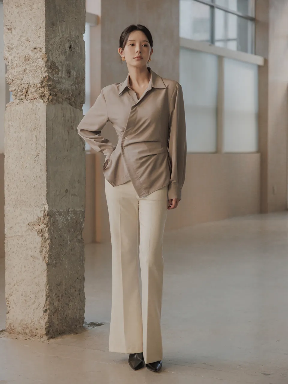 腰のラインだけに見えるボタンデザインでミニマルなディテールを完成