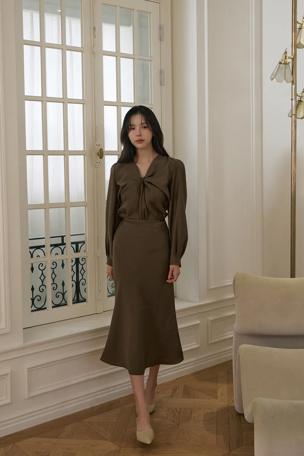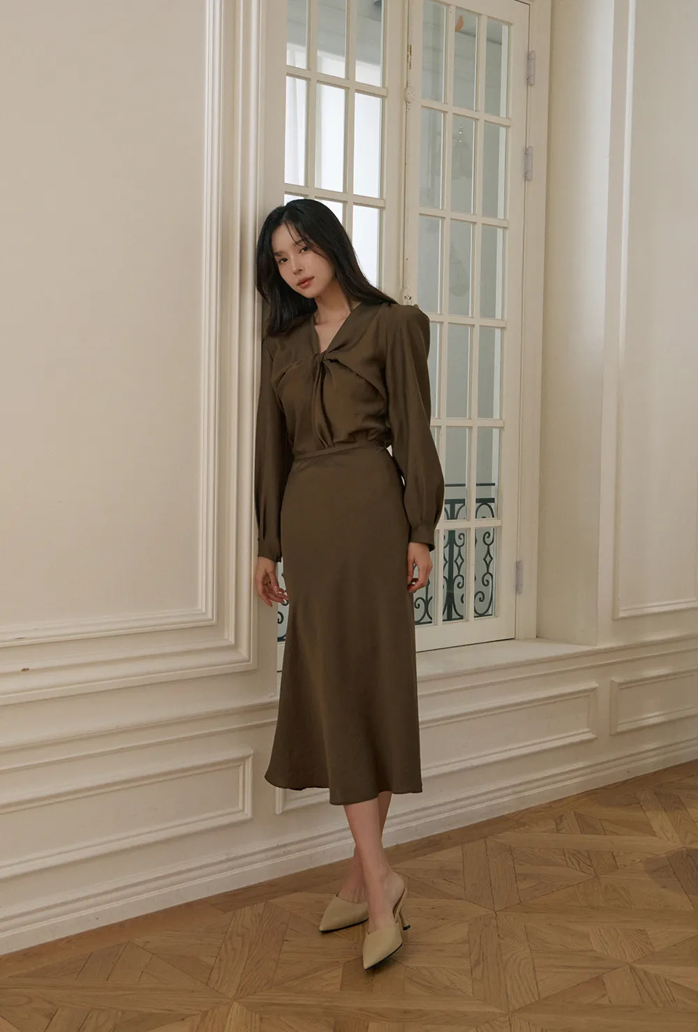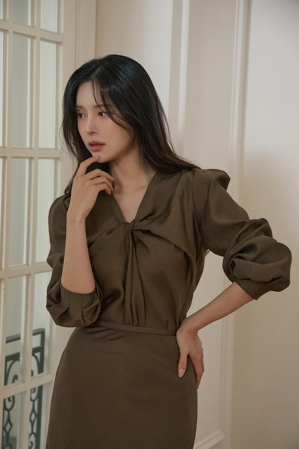 肩の穏やかなシャーリングと軽いパフディテールで感覚的でロマンチックなシルエット