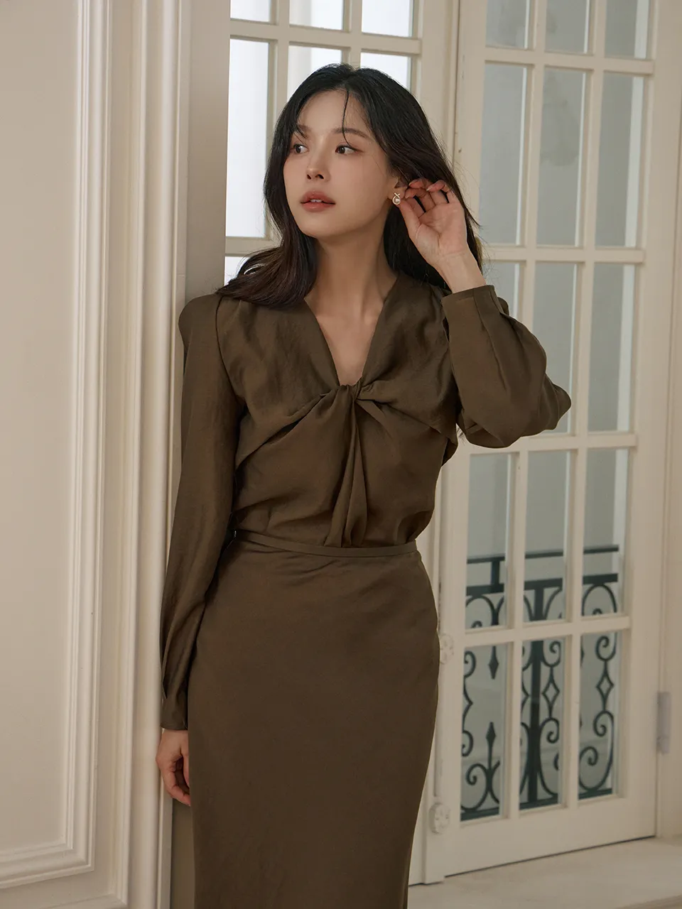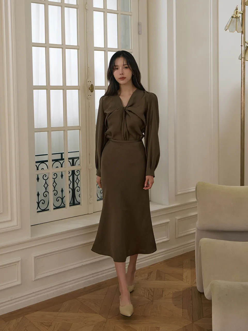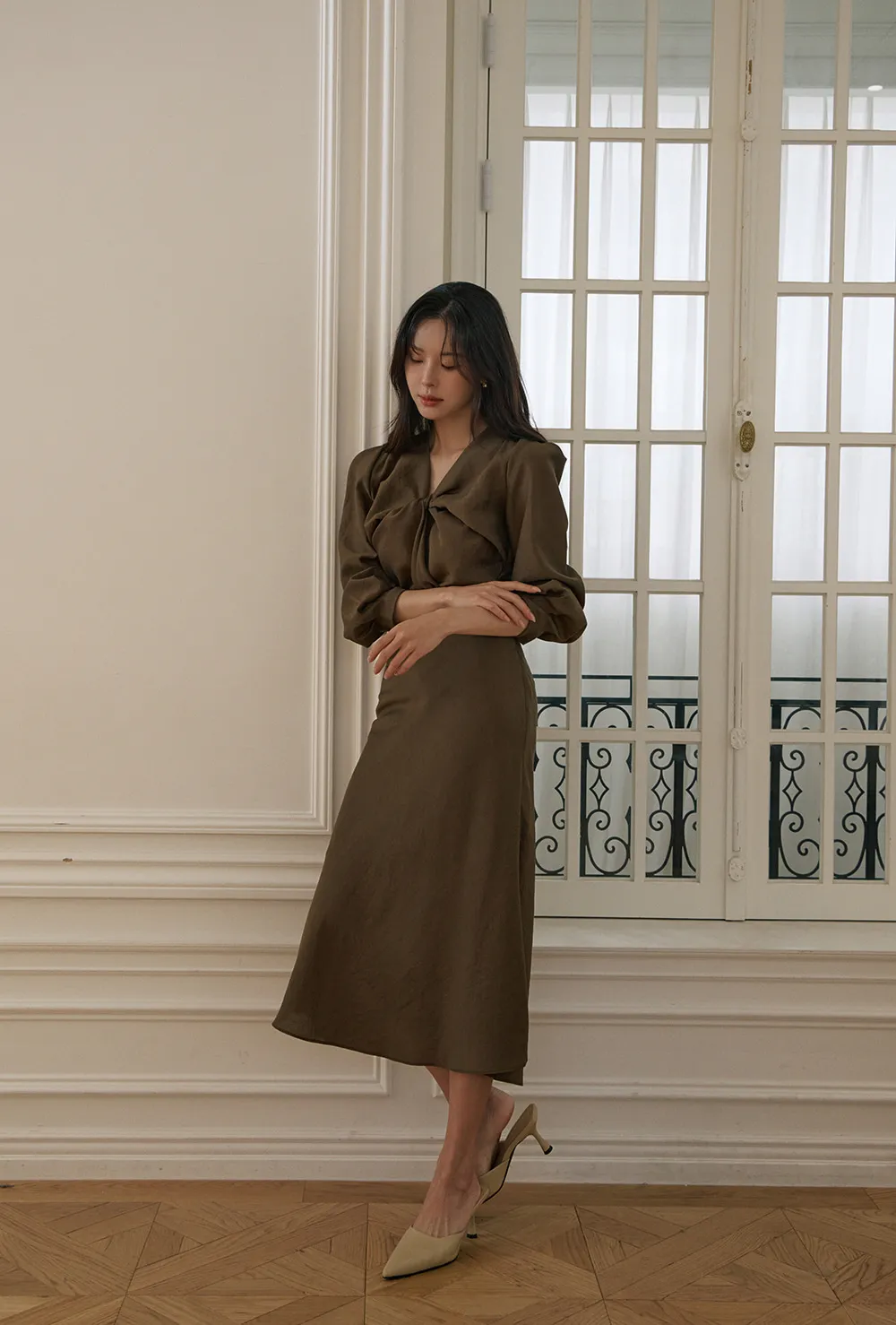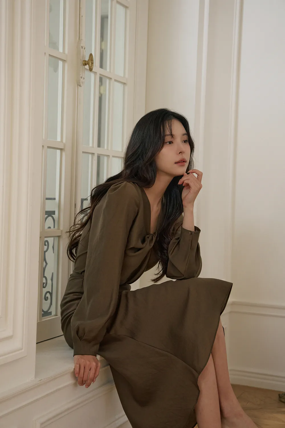 肩の穏やかなシャーリングと軽いパフディテールで感覚的でロマンチックなシルエット