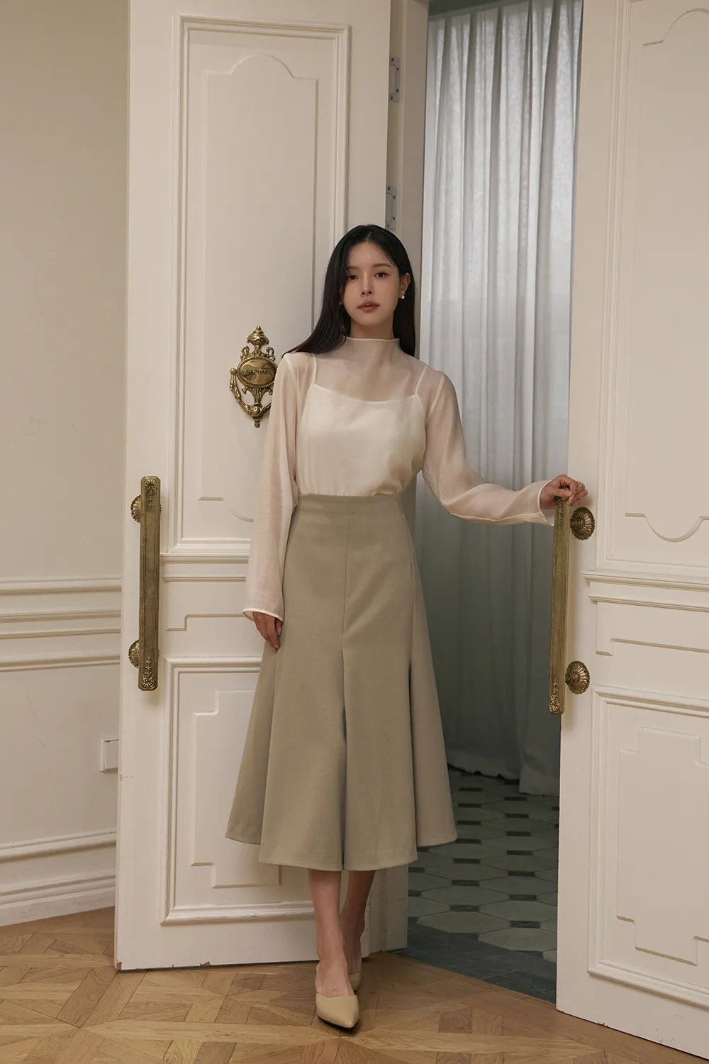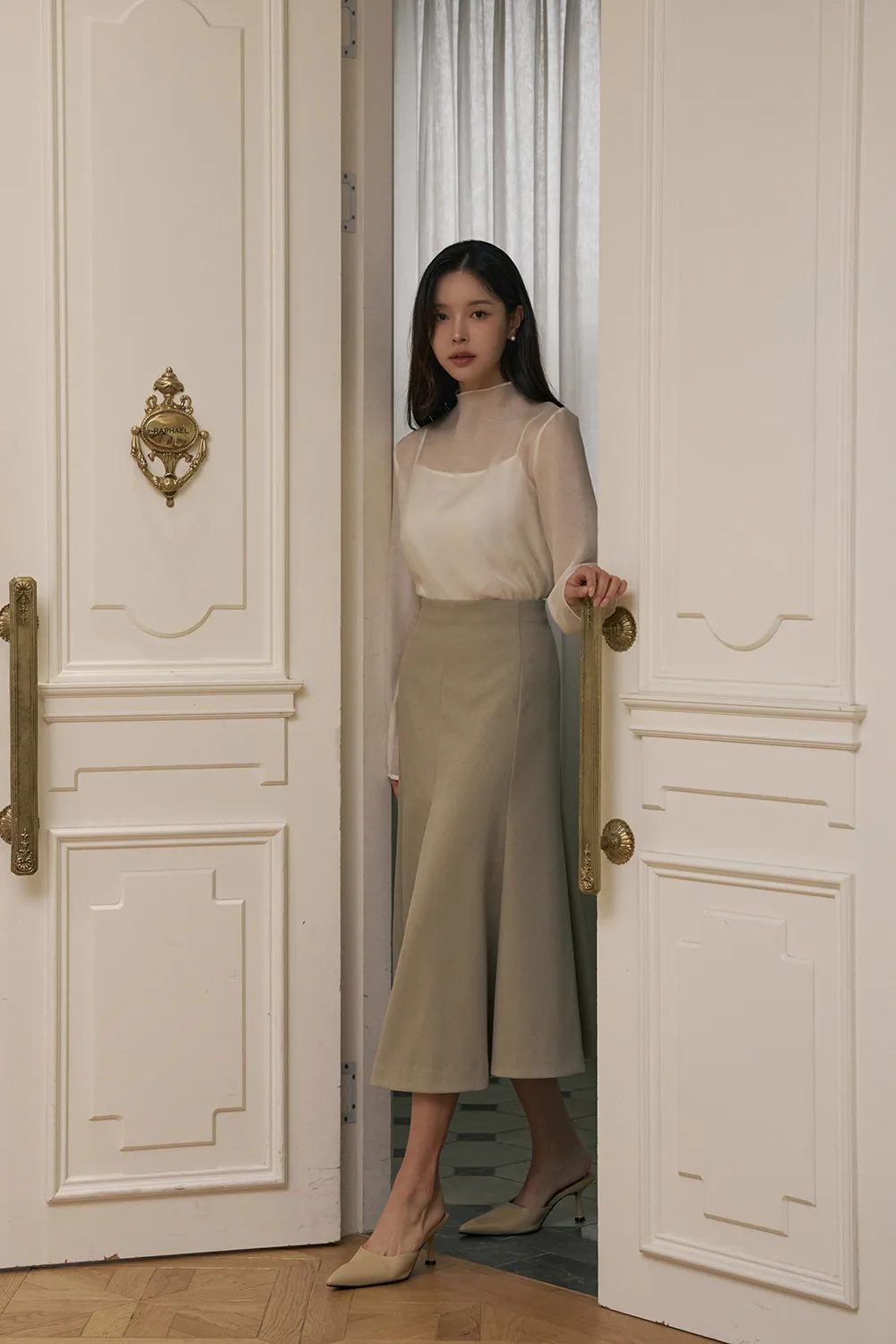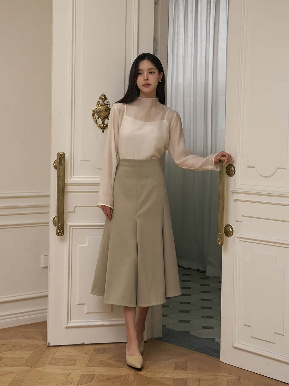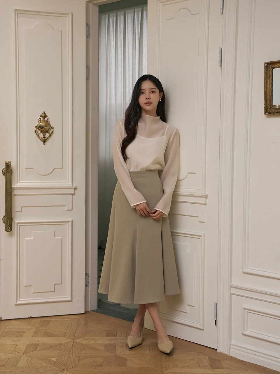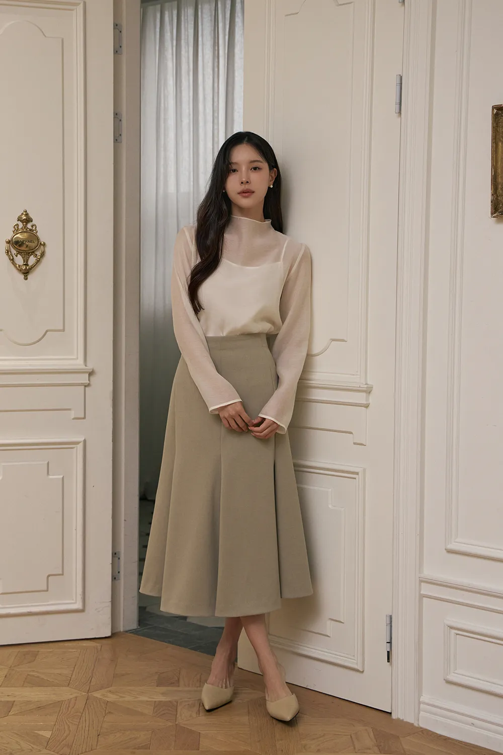 エレガントなフレアラインとおしゃれなディテールが魅力的なロングスカートです。