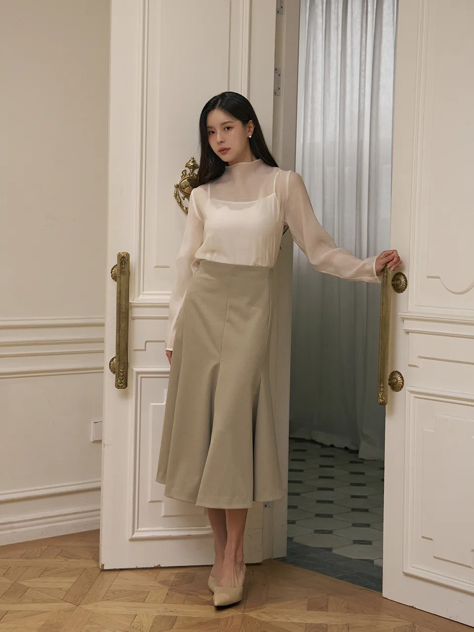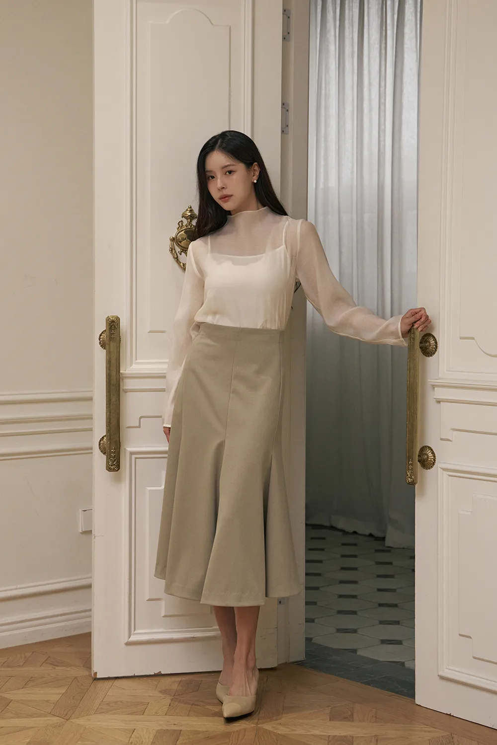 豊かなフレアラインで優雅で女性らしいシルエットを演出
