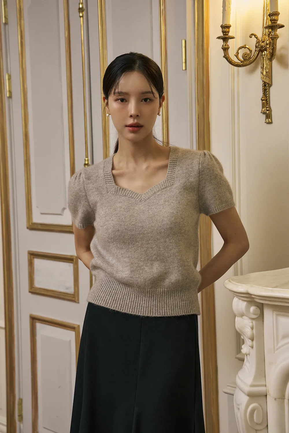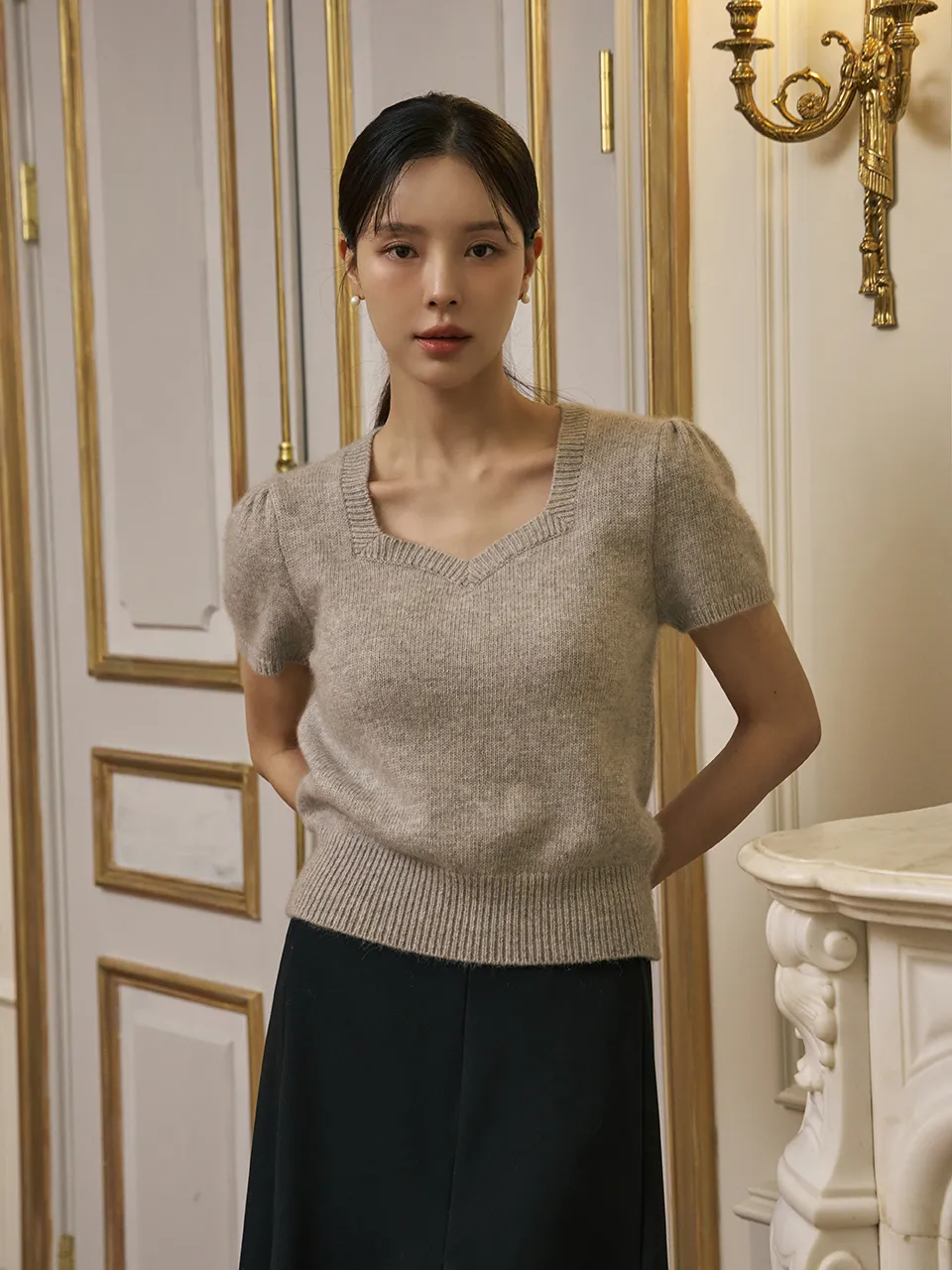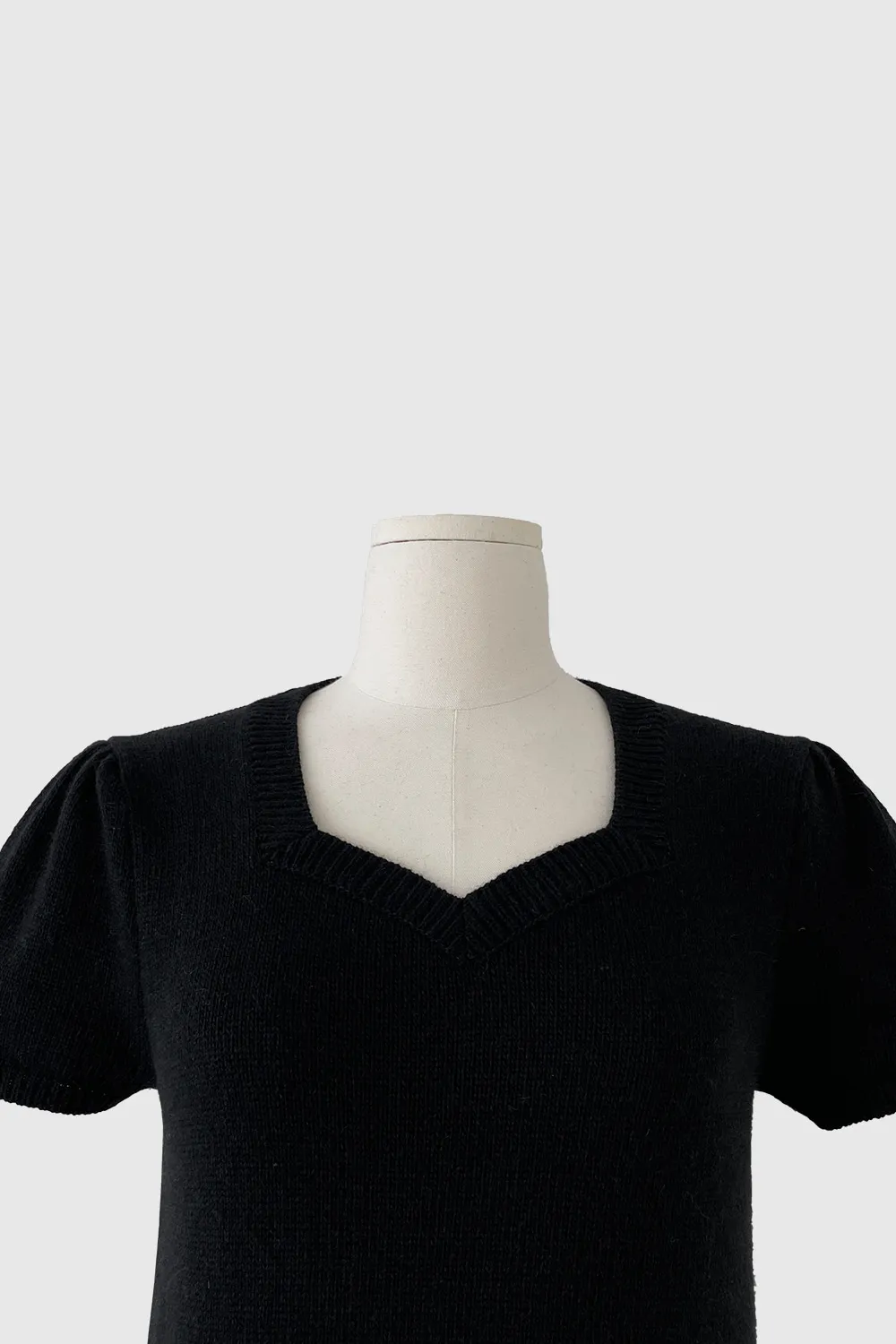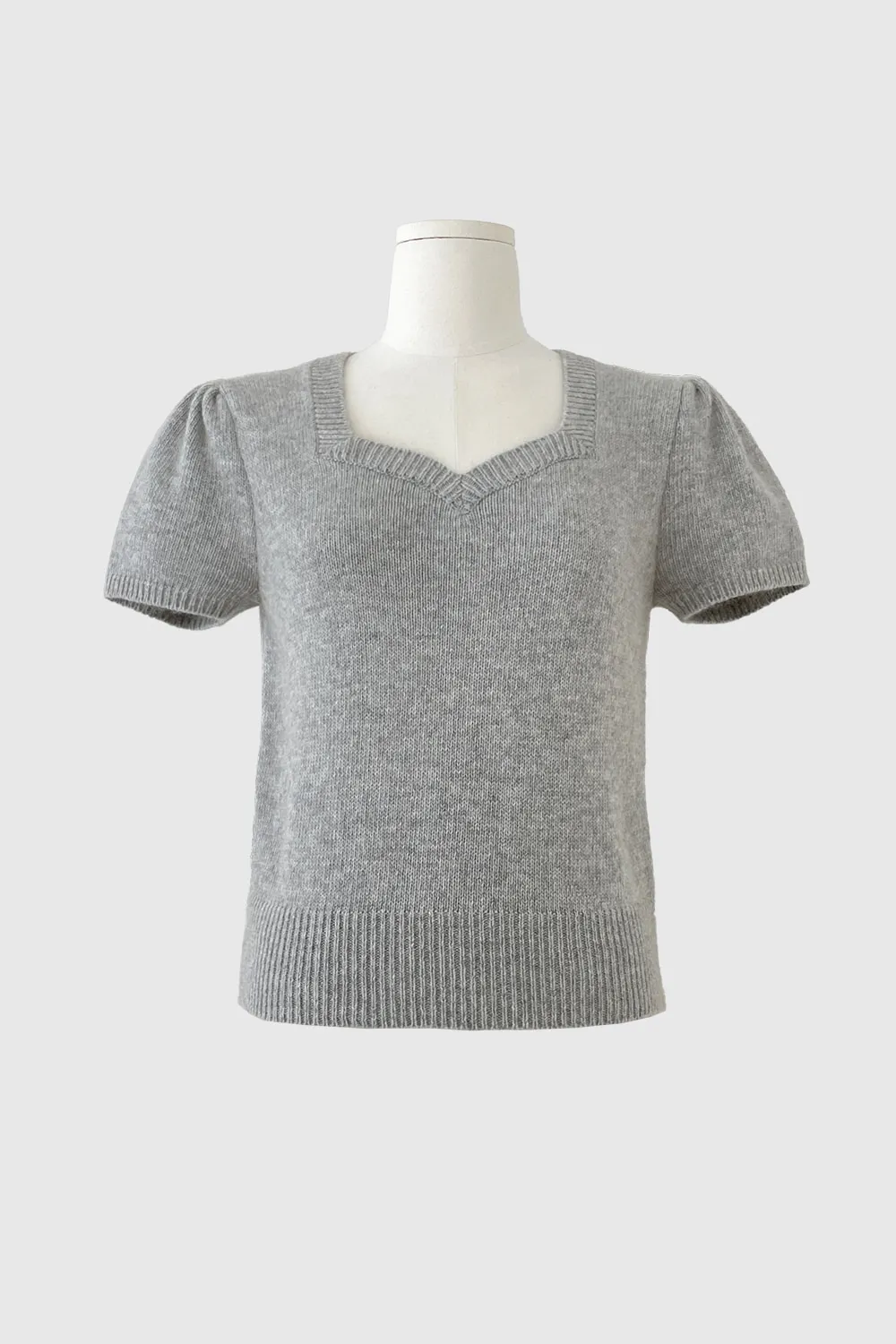 柔らかいタッチ感とフェミニンなムードが感じられるハートネックの半そでニットです。