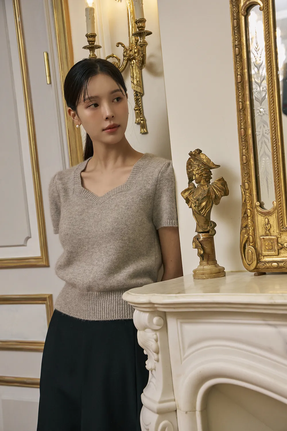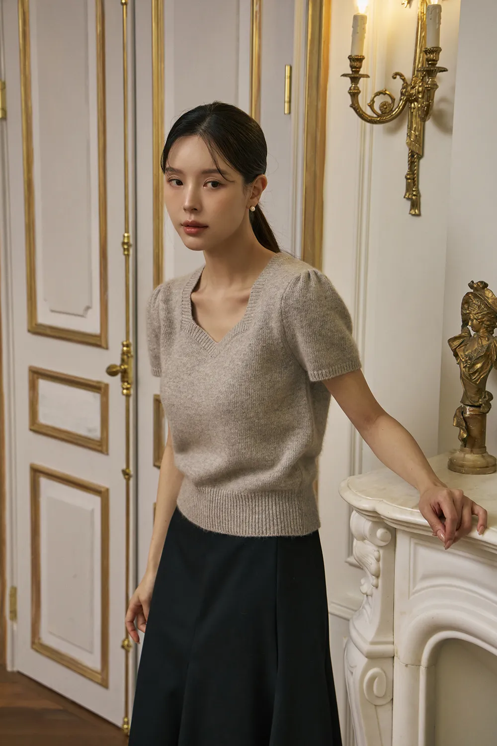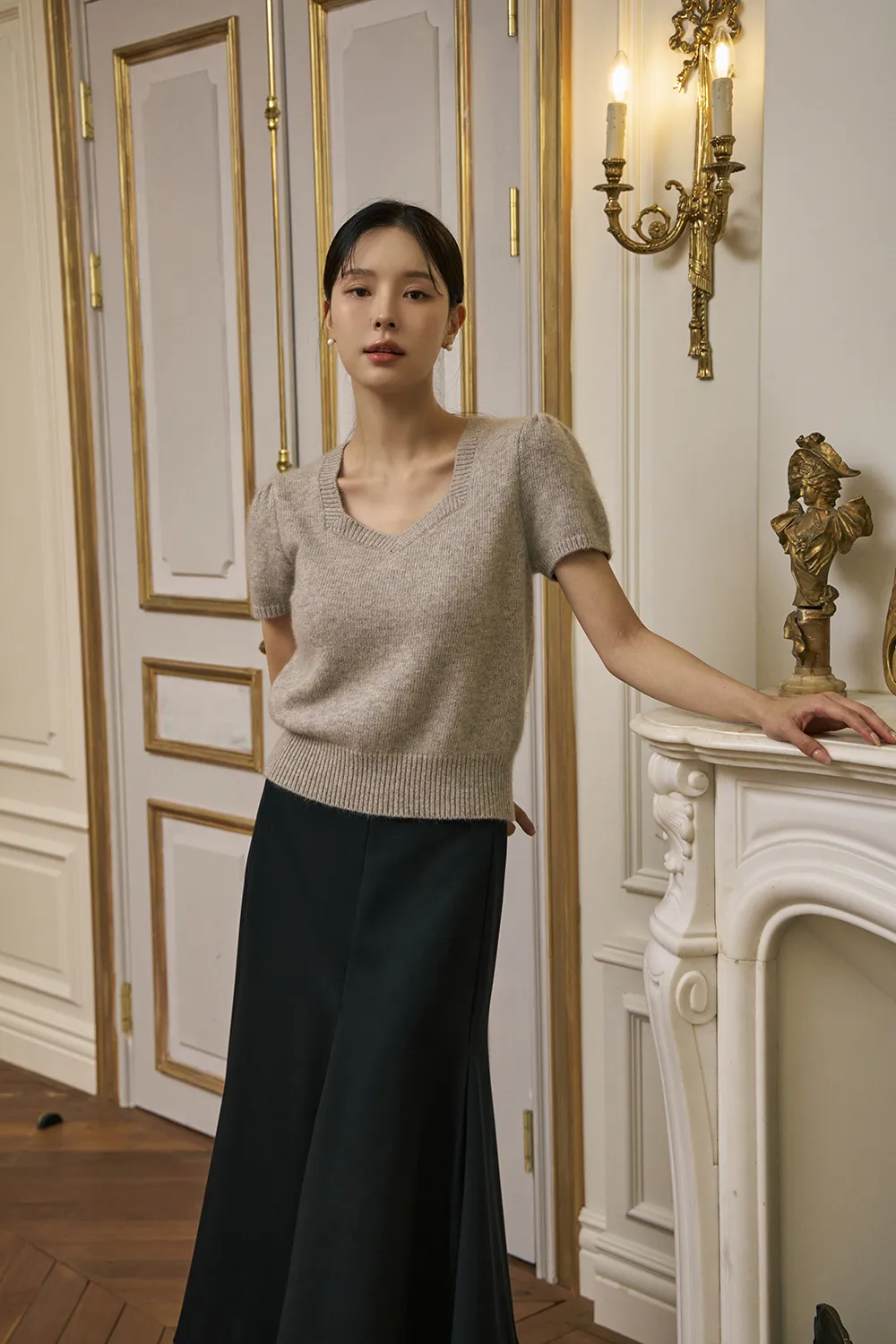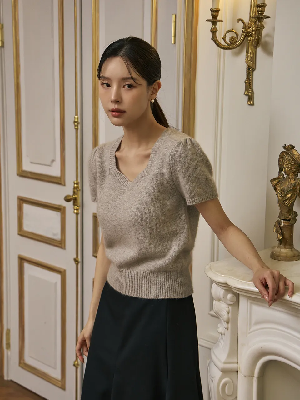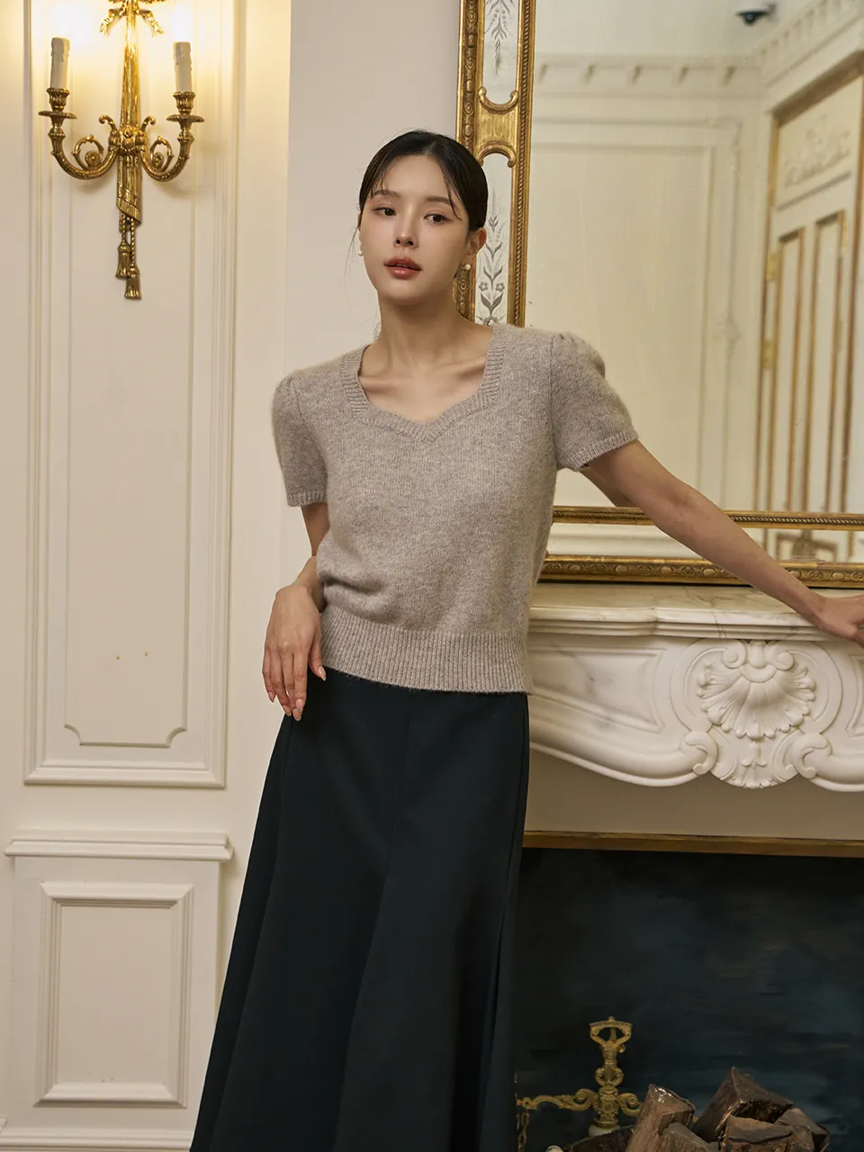柔らかいタッチ感とフェミニンなムードが感じられるハートネックの半そでニットです。
