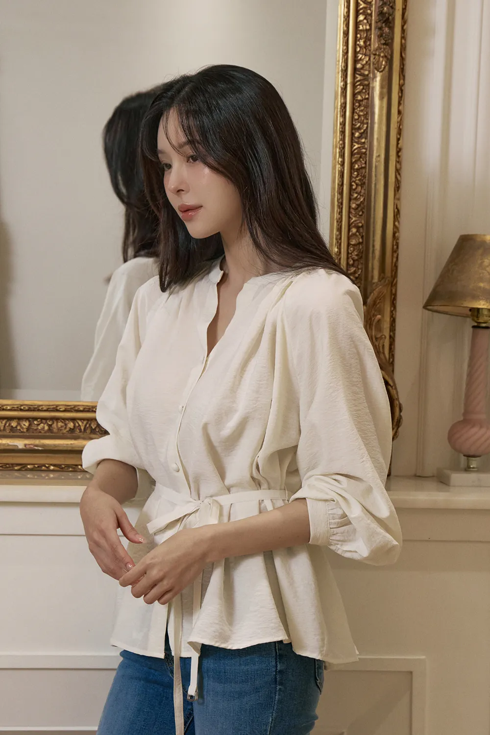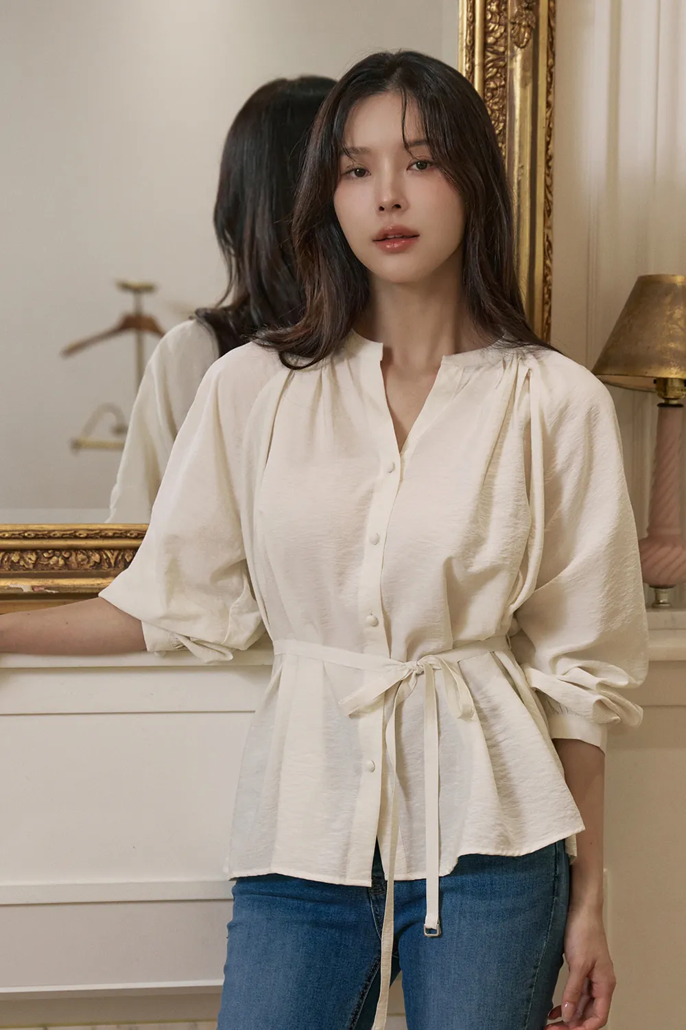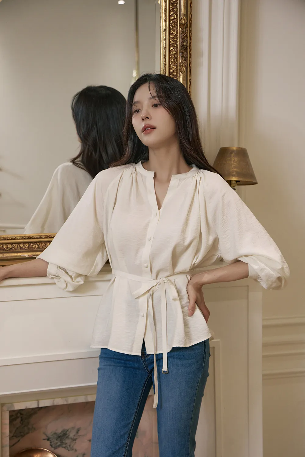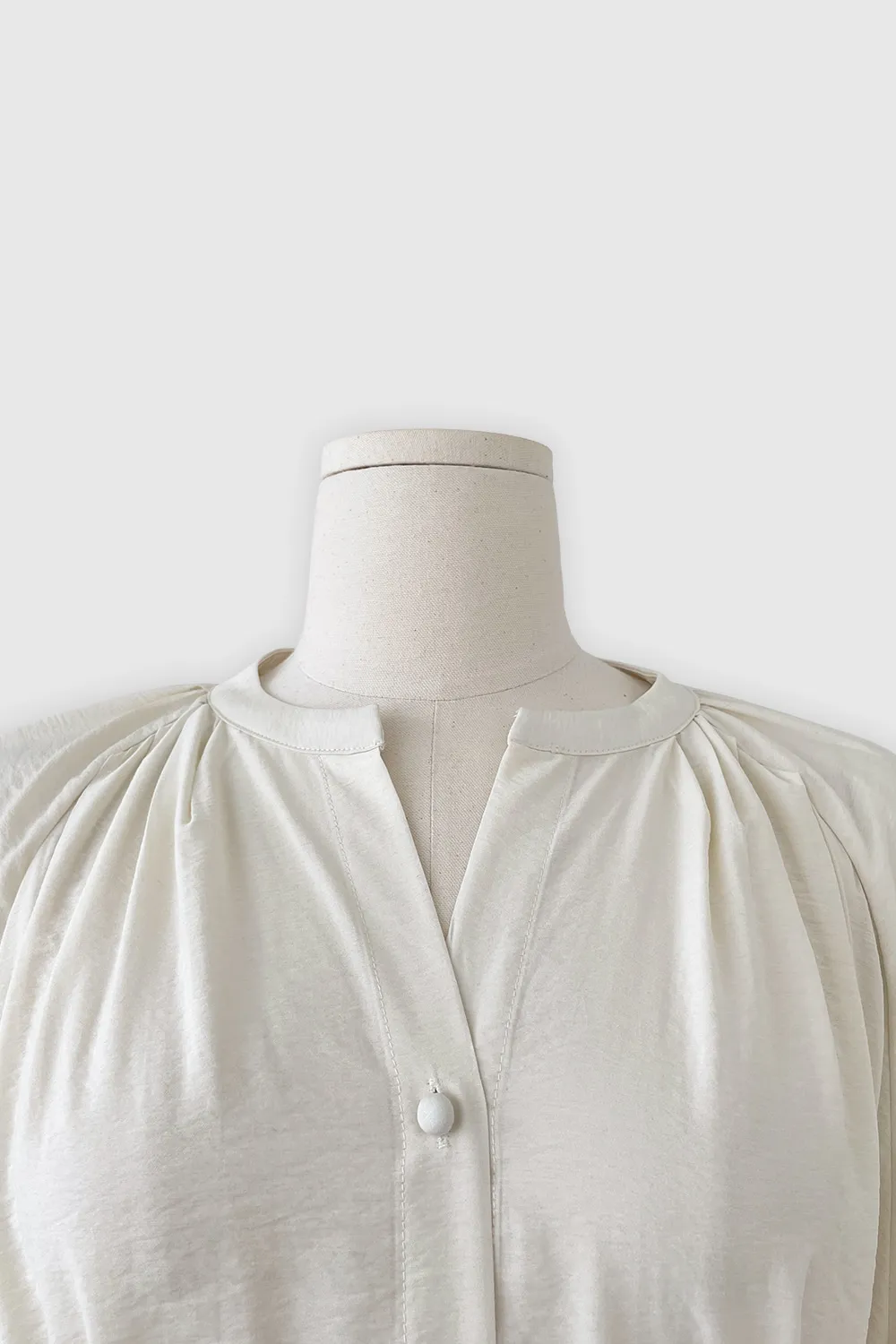 - すっきりとしたネックラインに落ち着いたシャーリングで優雅でフェミニンな上半身ラインを演出