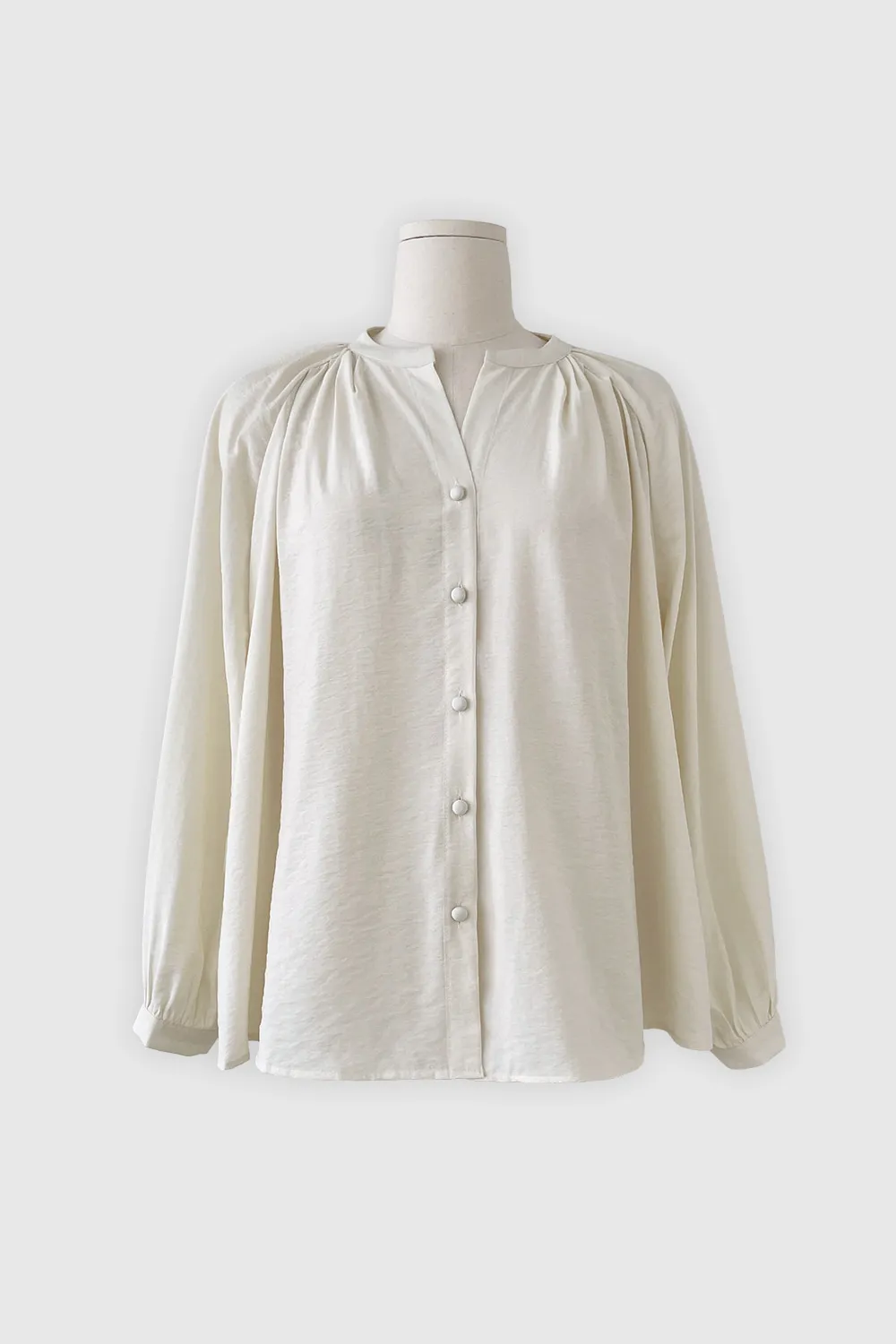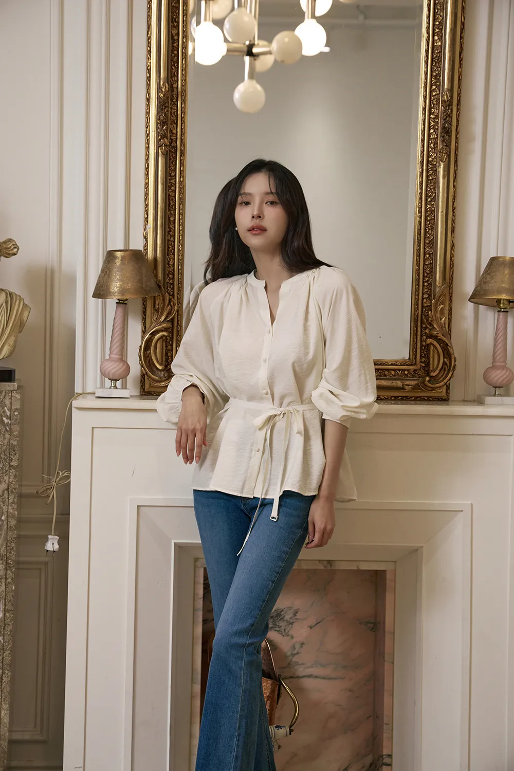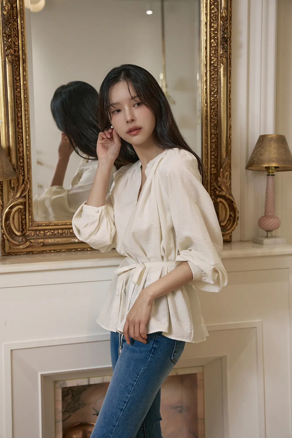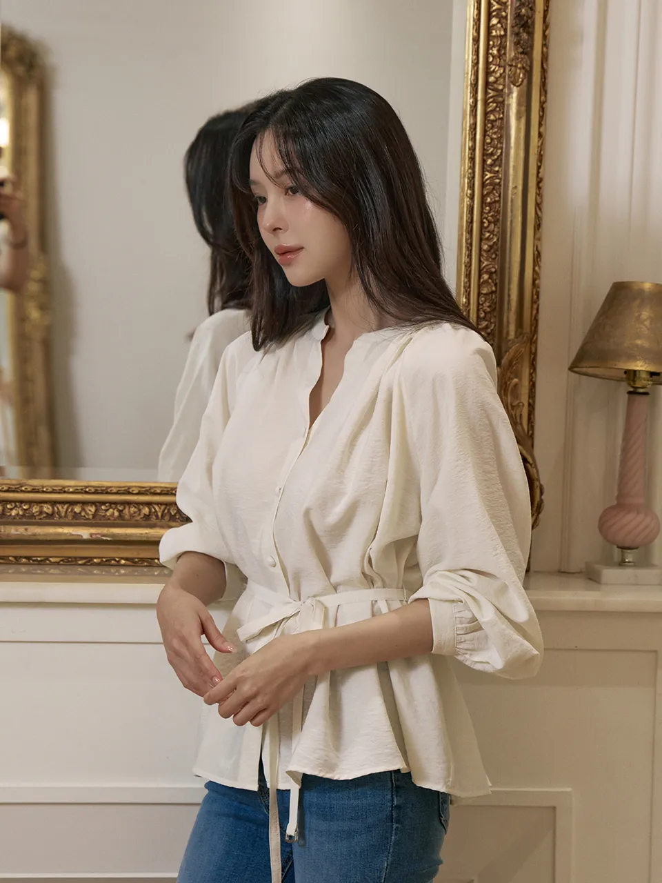 - すっきりとしたネックラインに落ち着いたシャーリングで優雅でフェミニンな上半身ラインを演出