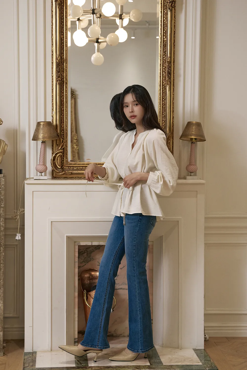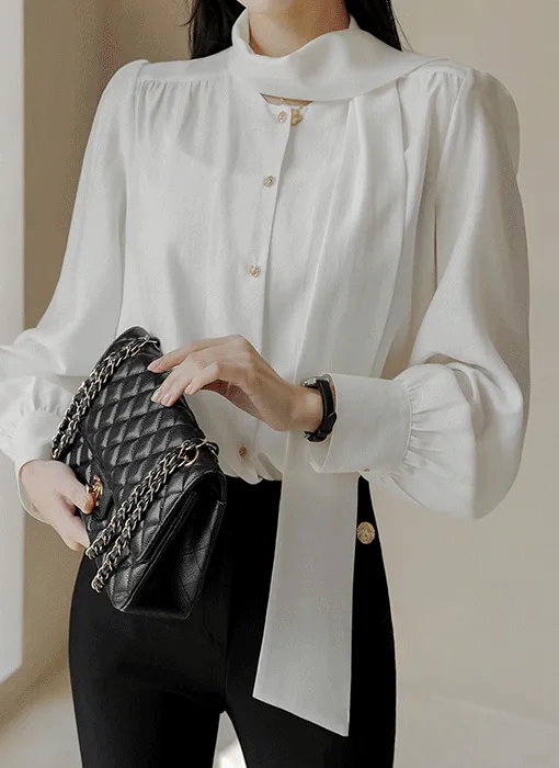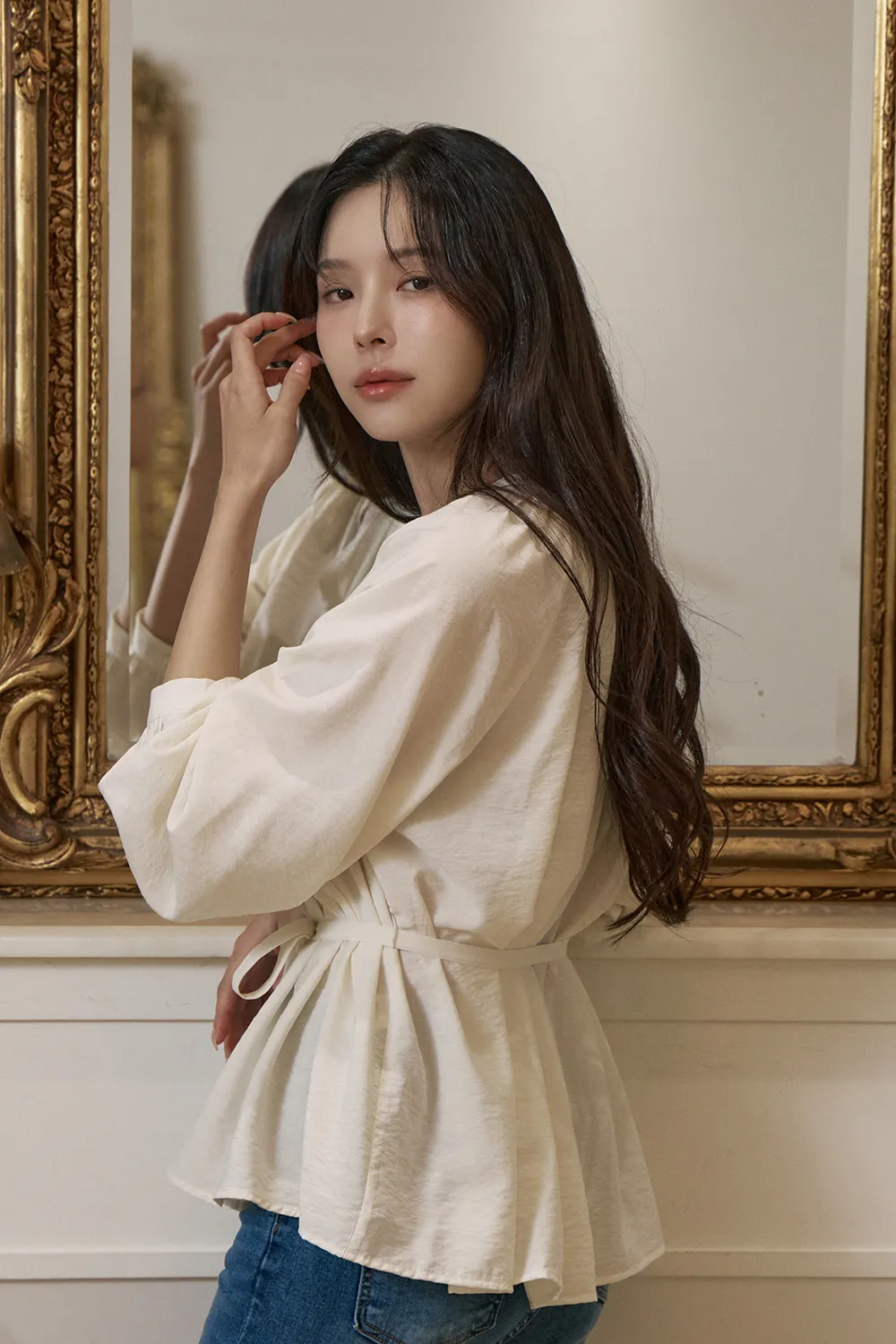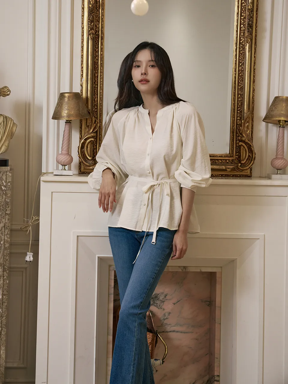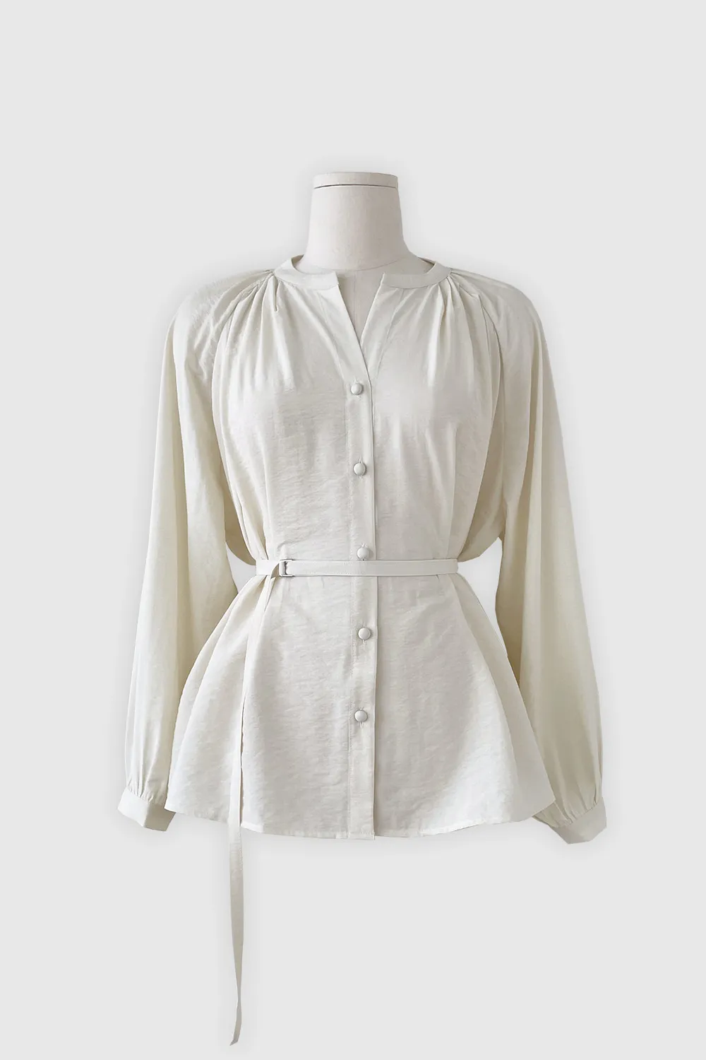 - すっきりとしたネックラインに落ち着いたシャーリングで優雅でフェミニンな上半身ラインを演出