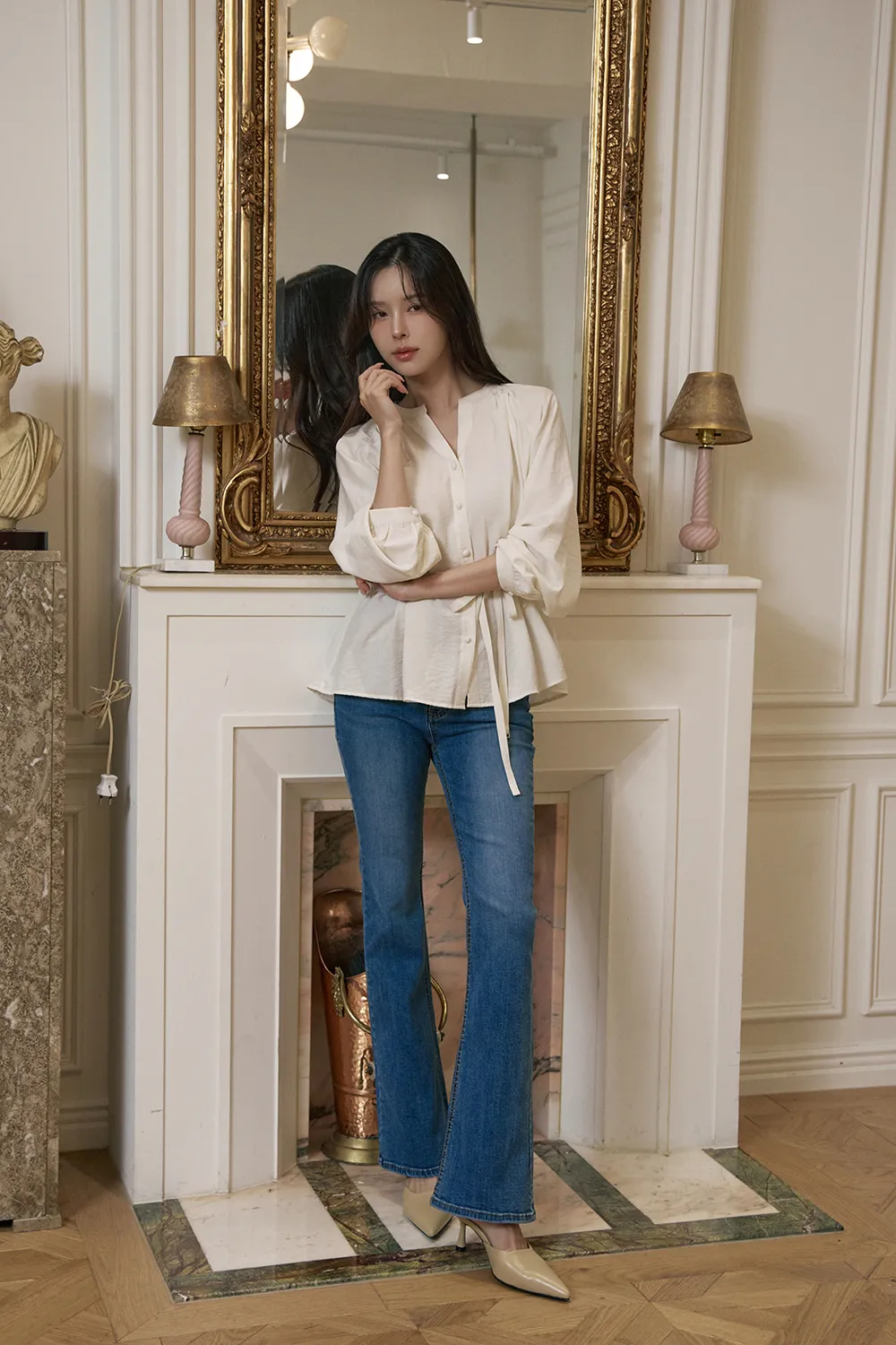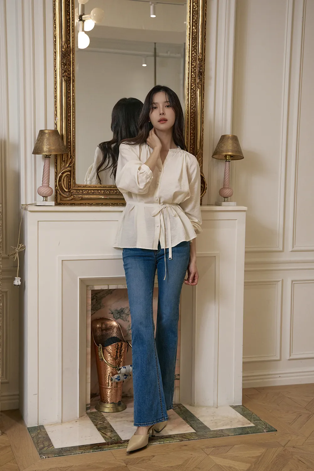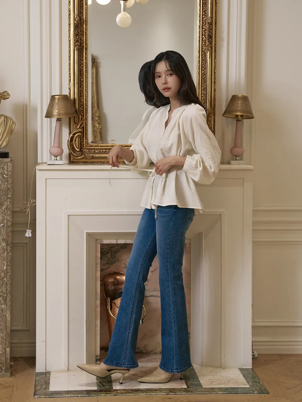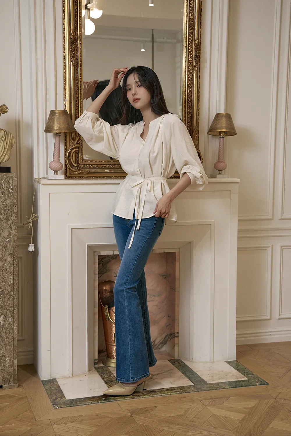 - すっきりとしたネックラインに落ち着いたシャーリングで優雅でフェミニンな上半身ラインを演出
