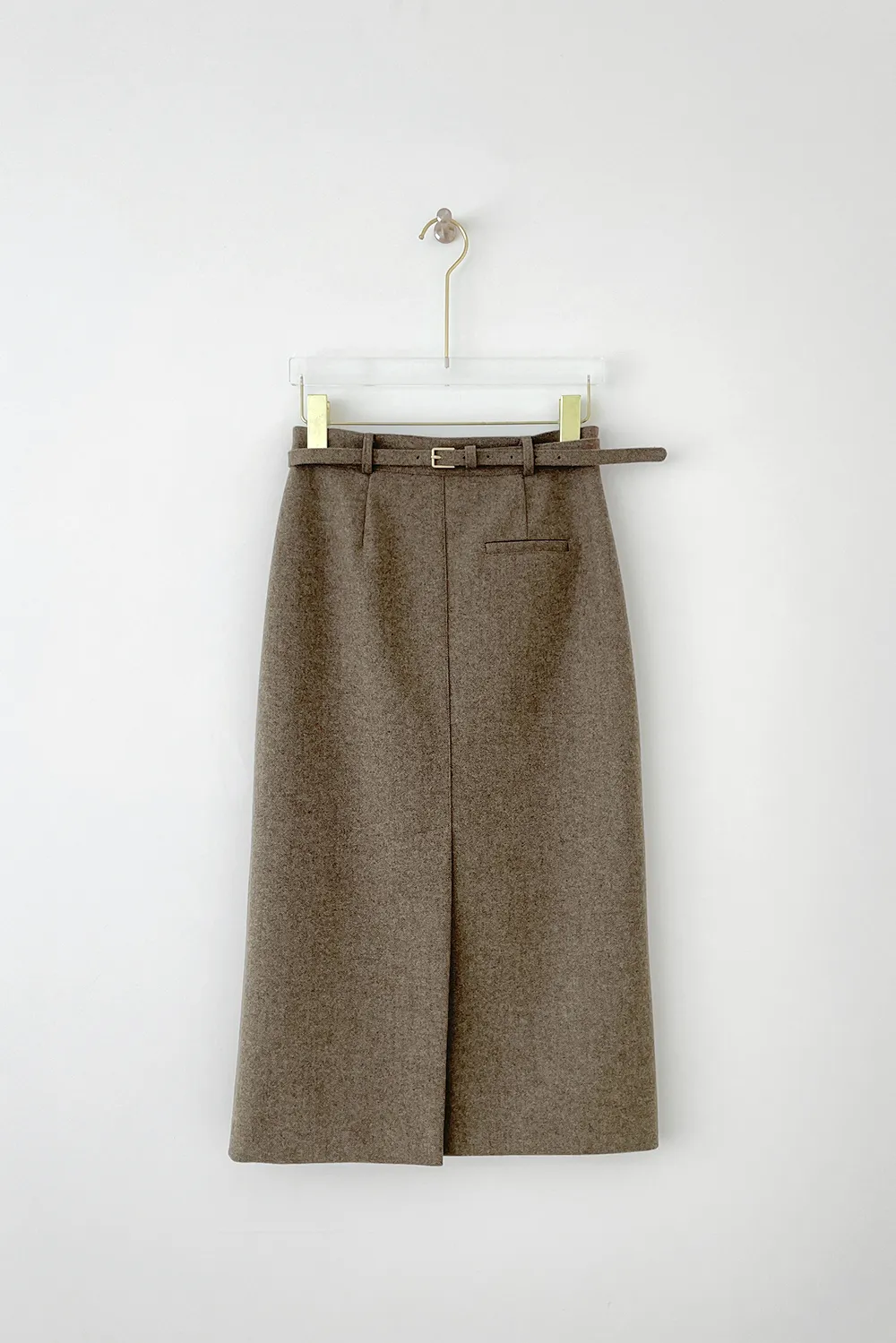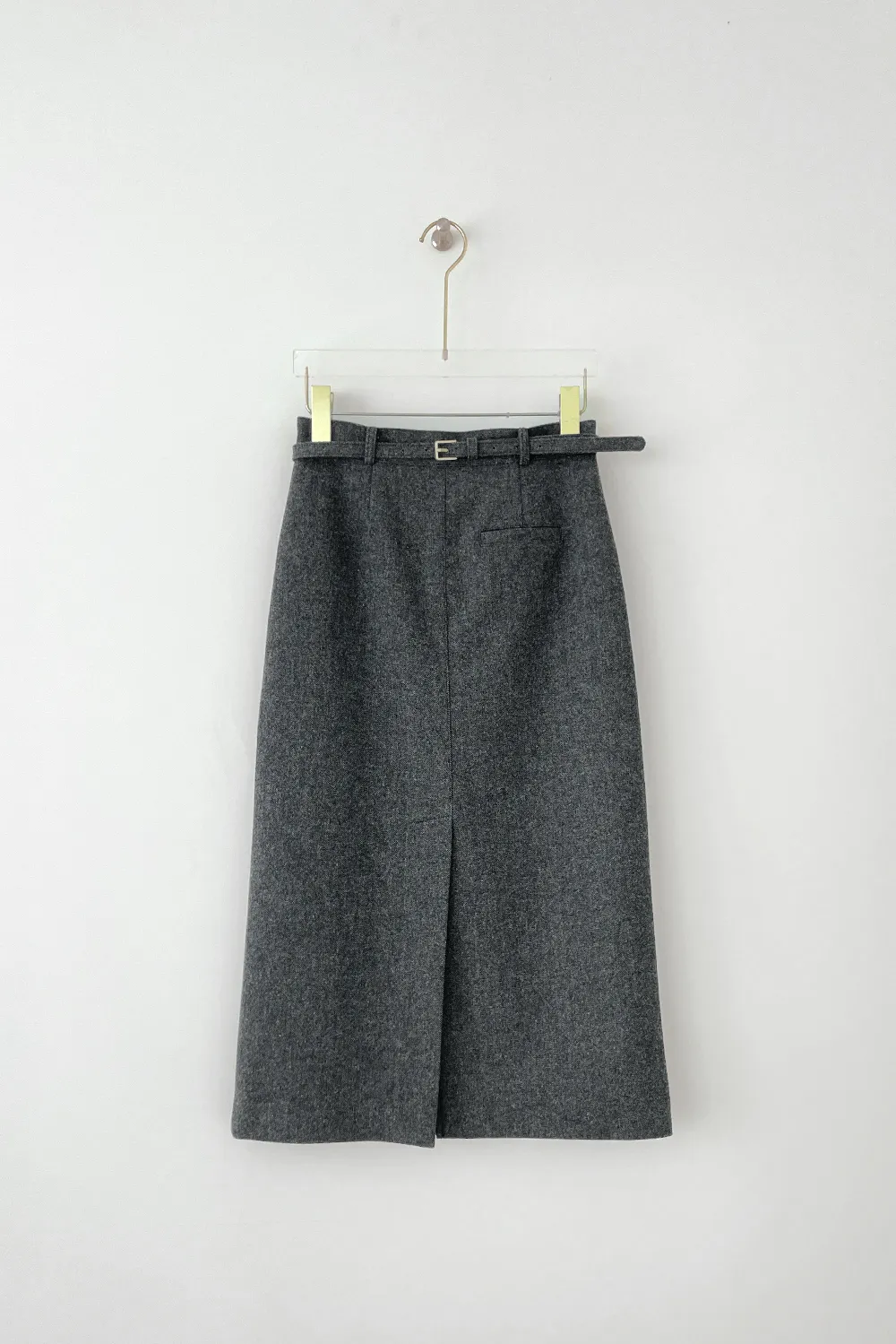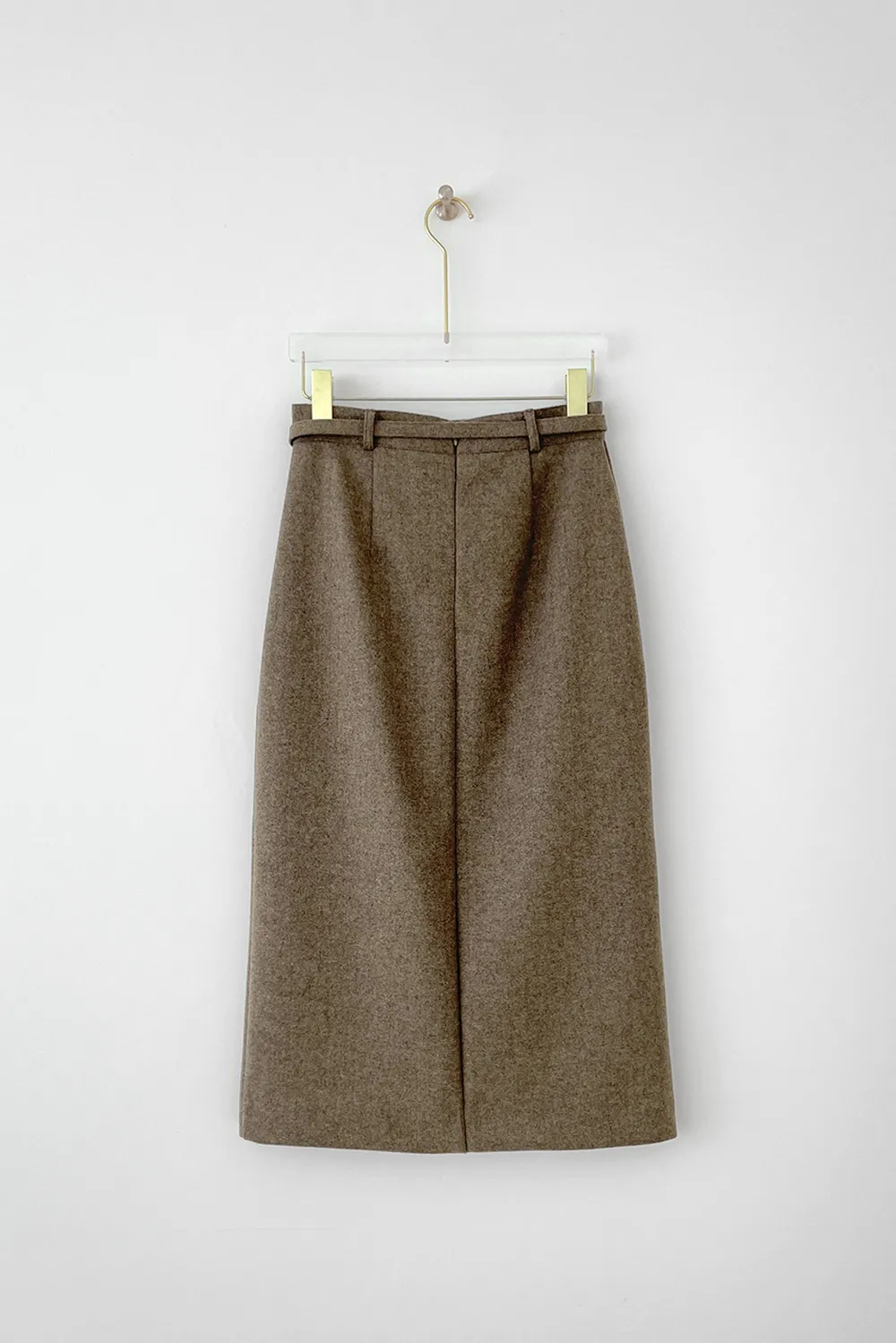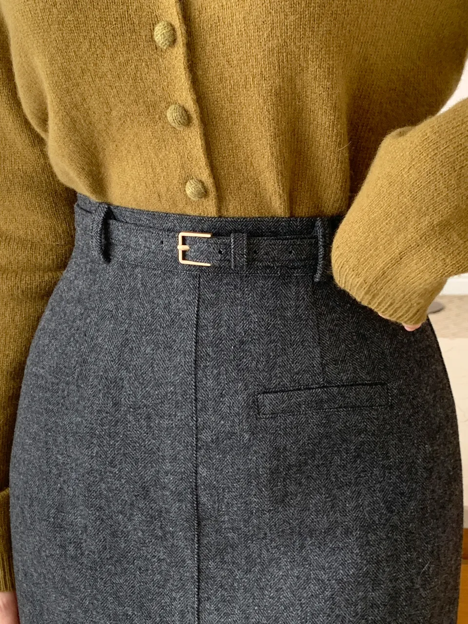 クラシックなヘリンボーンパターンとふんわりとしたウールのテクスチャーが引き立つHラインベルトスカートです。