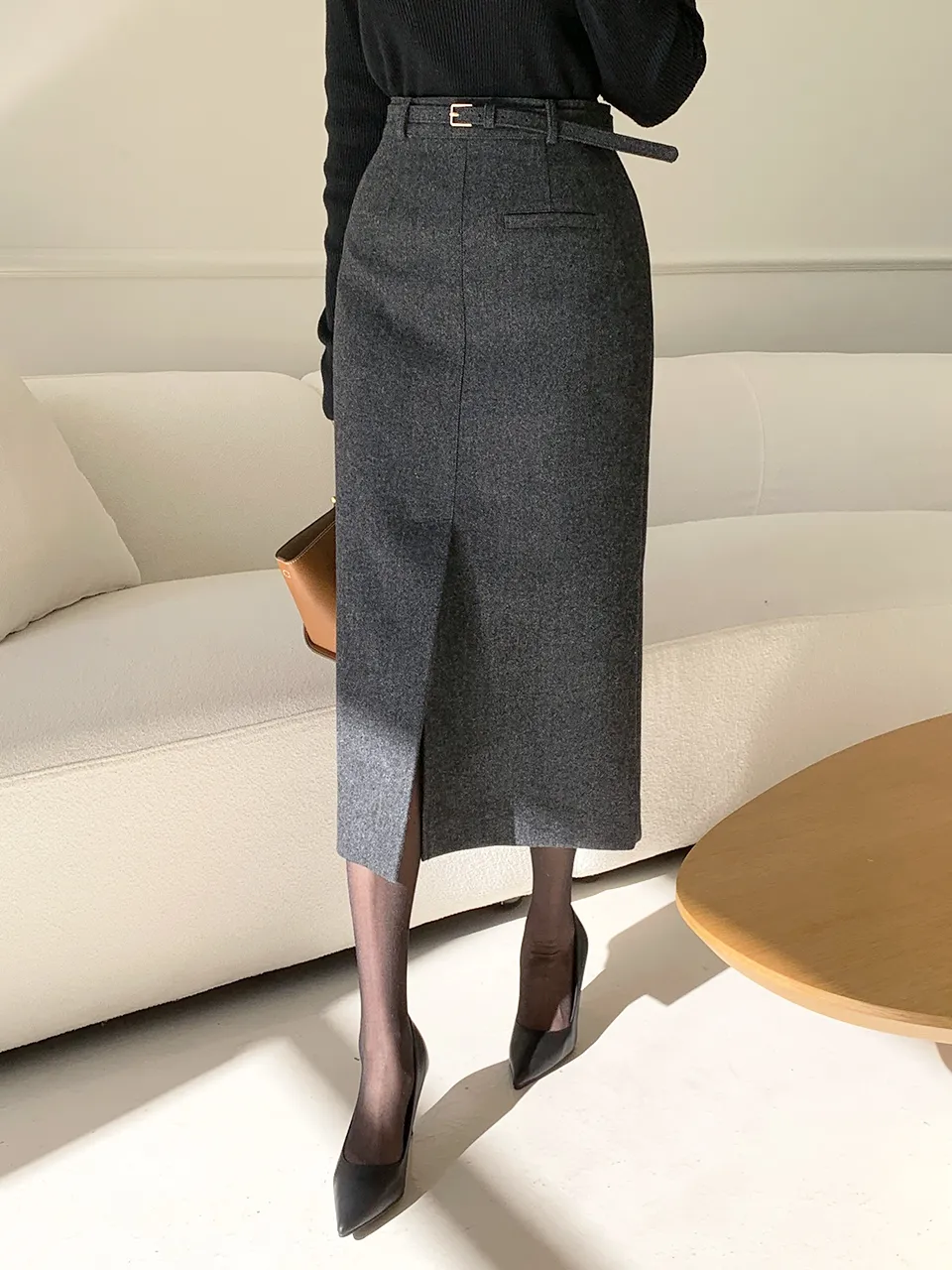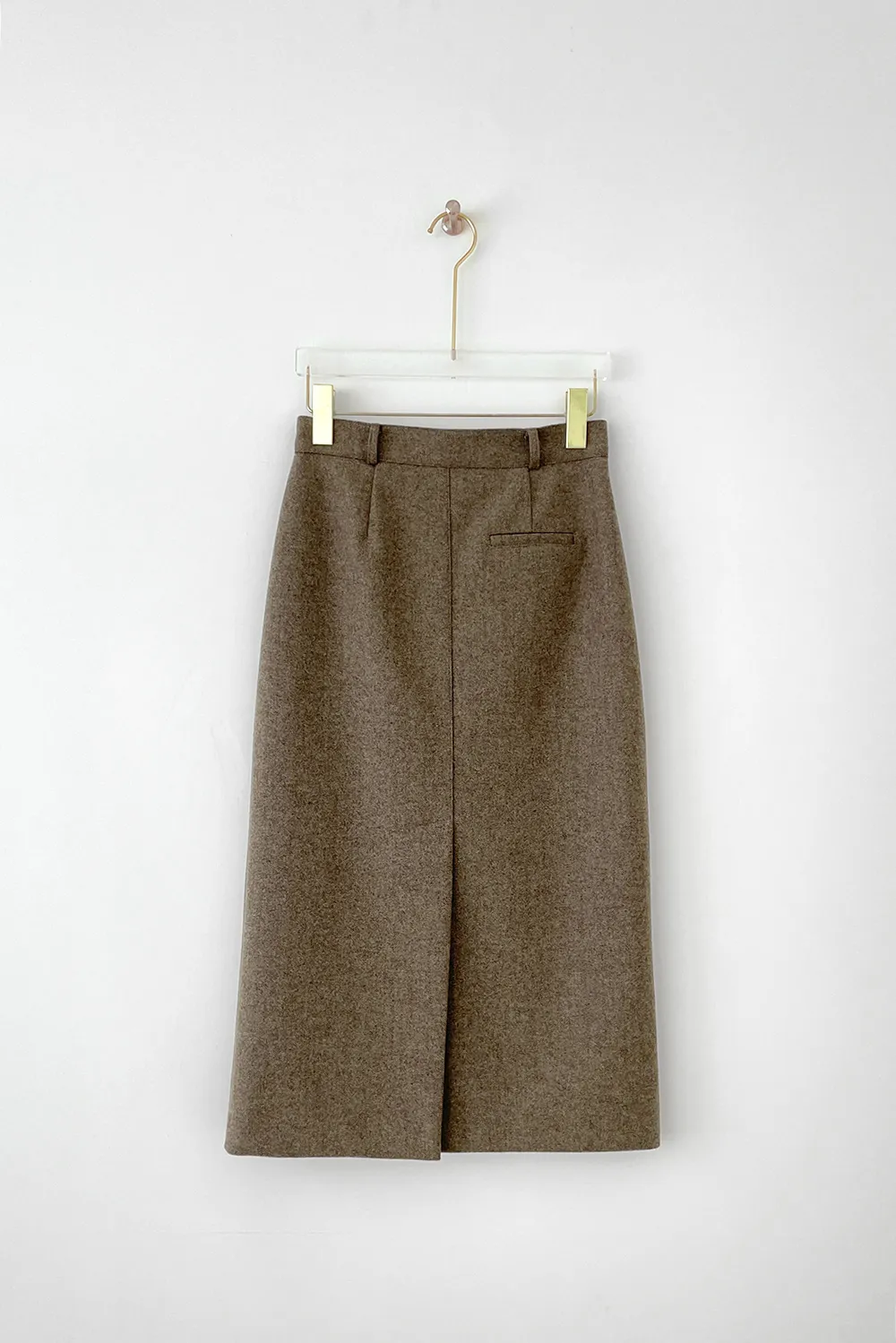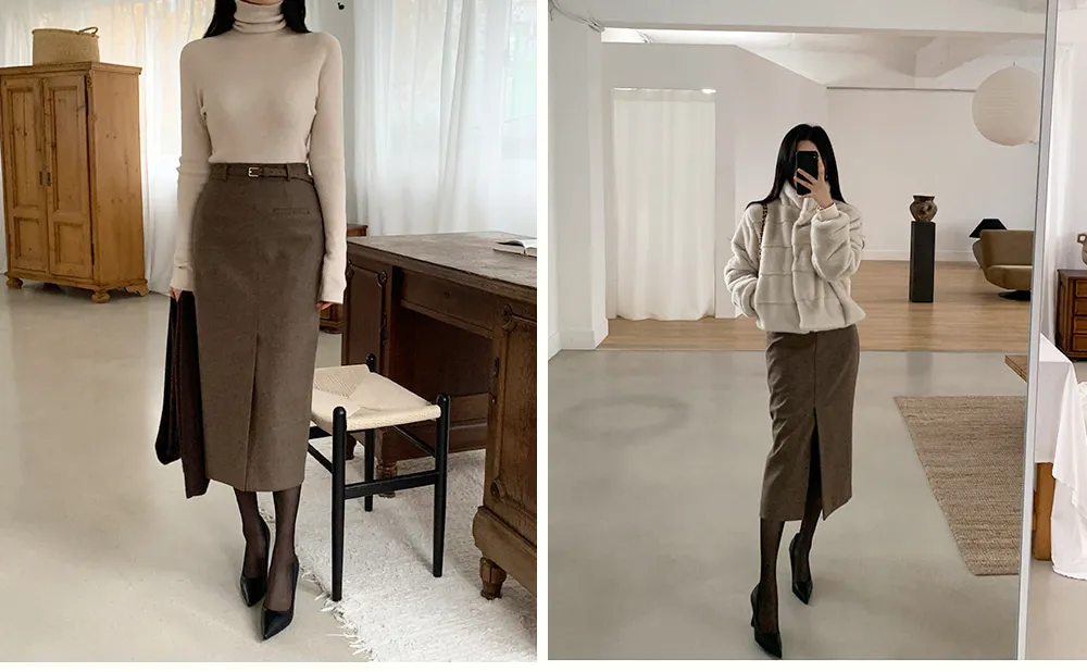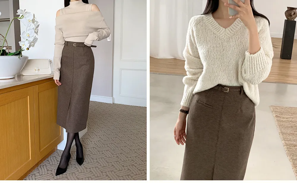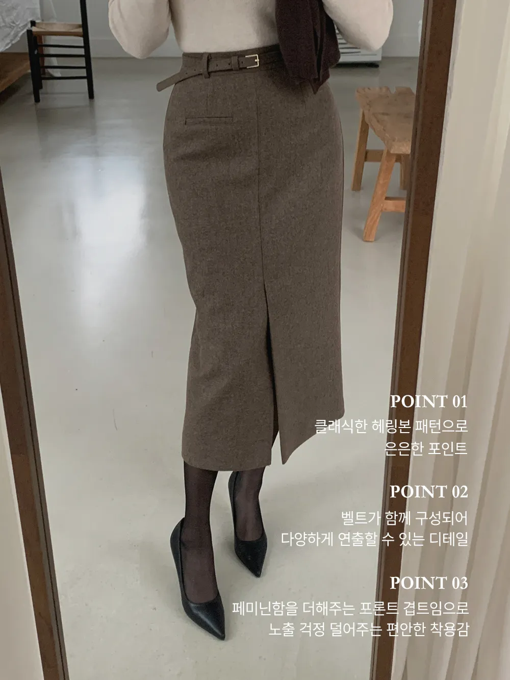 クラシックなヘリンボーンパターンとふんわりとしたウールのテクスチャーが引き立つHラインベルトスカートです。