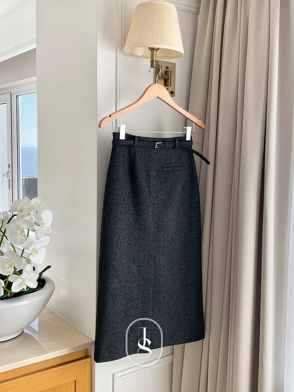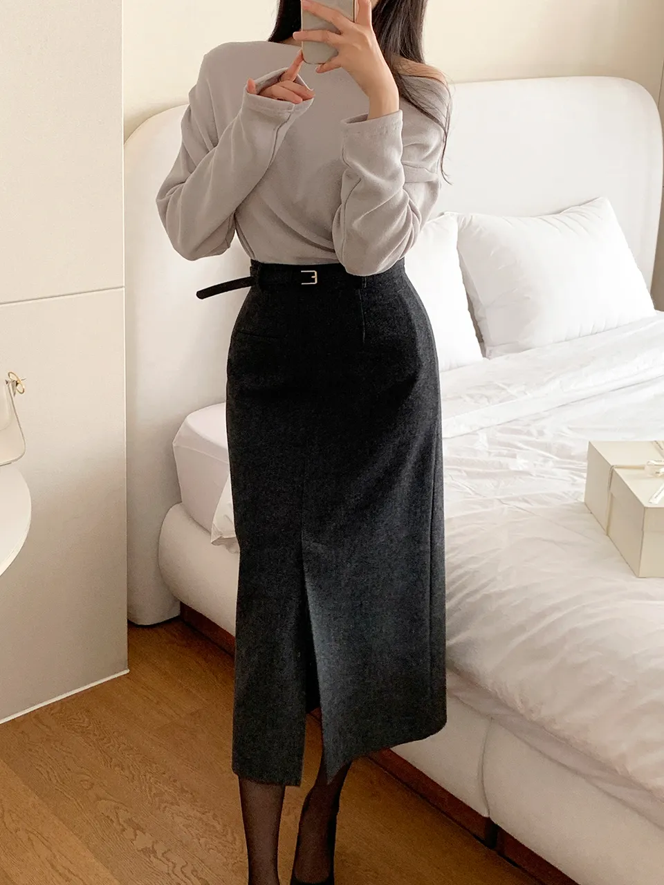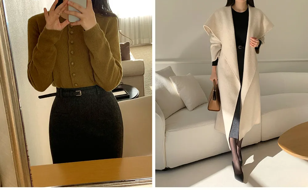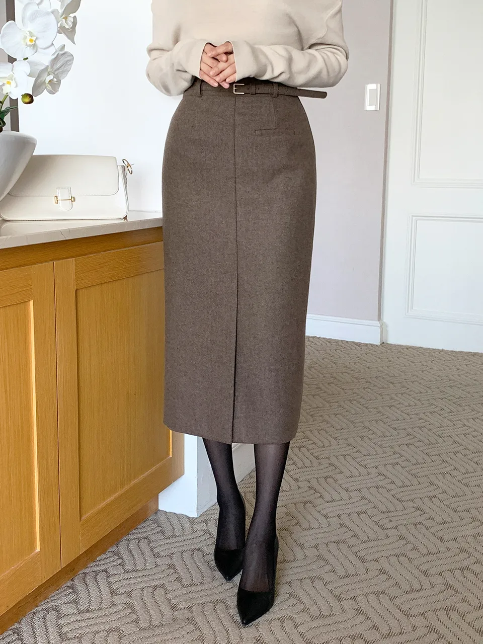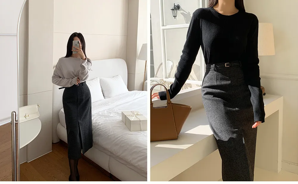クラシックなヘリンボーンパターンとふんわりとしたウールのテクスチャーが引き立つHラインベルトスカートです。
