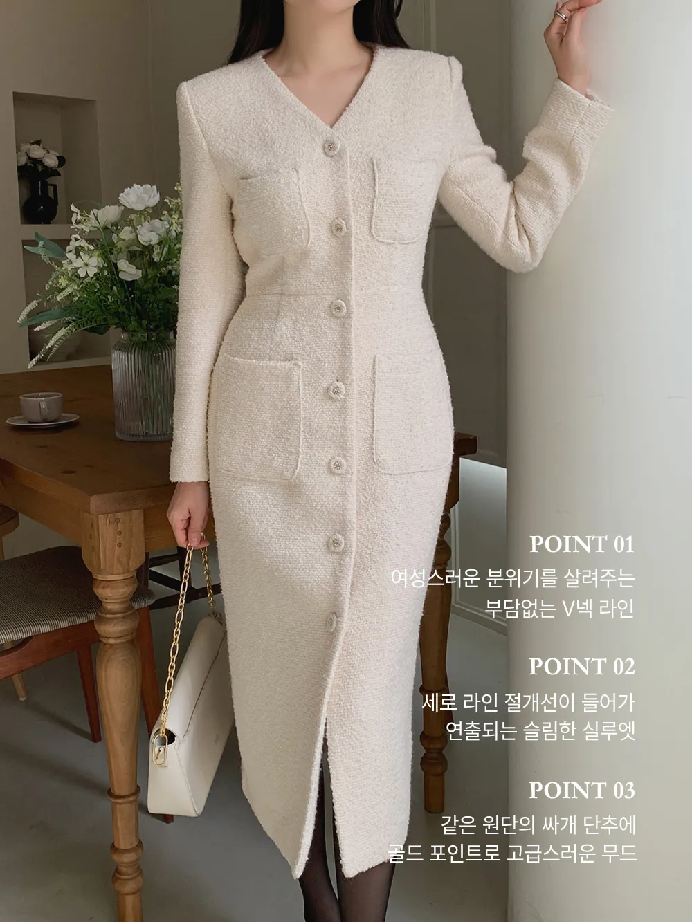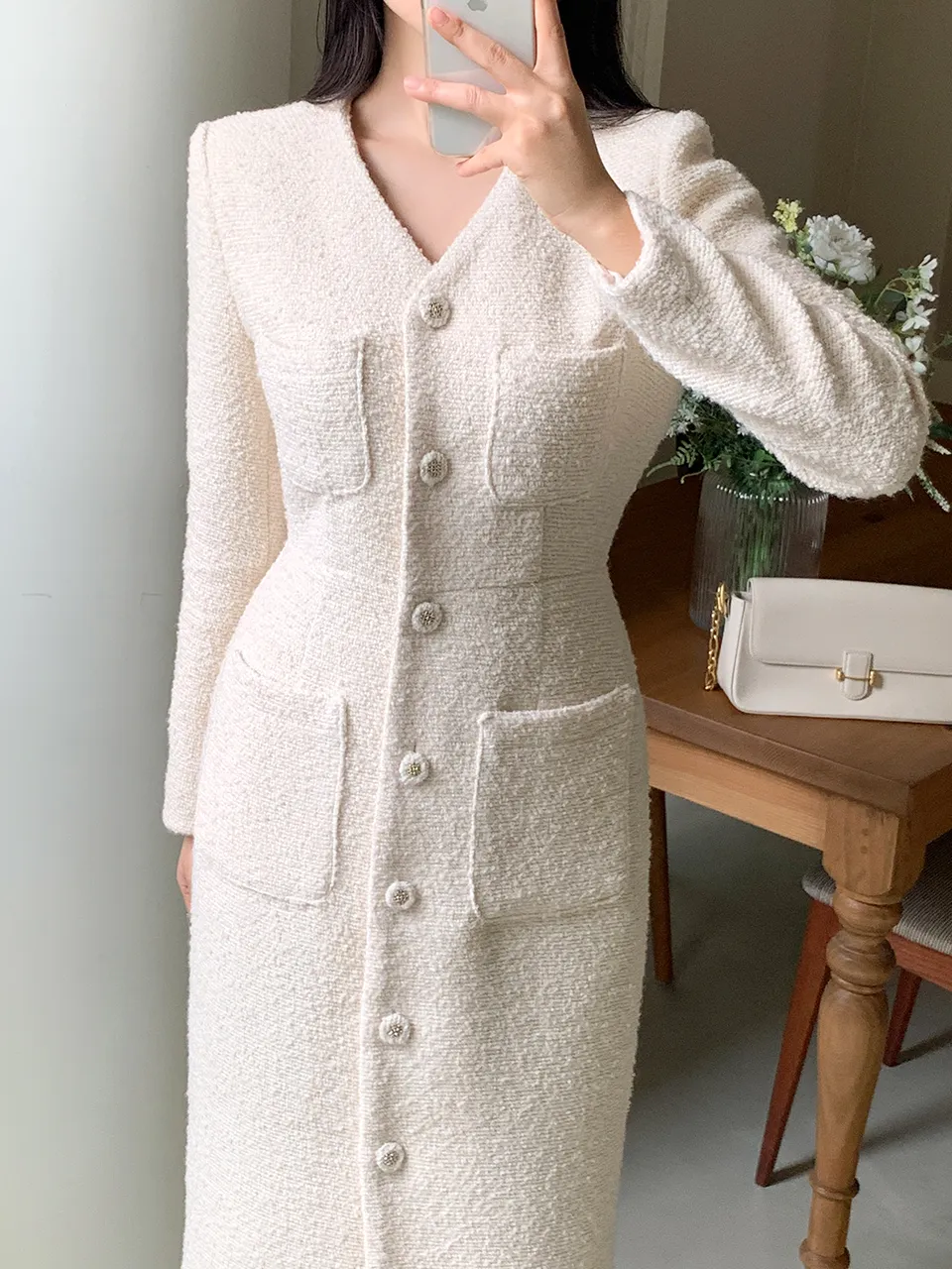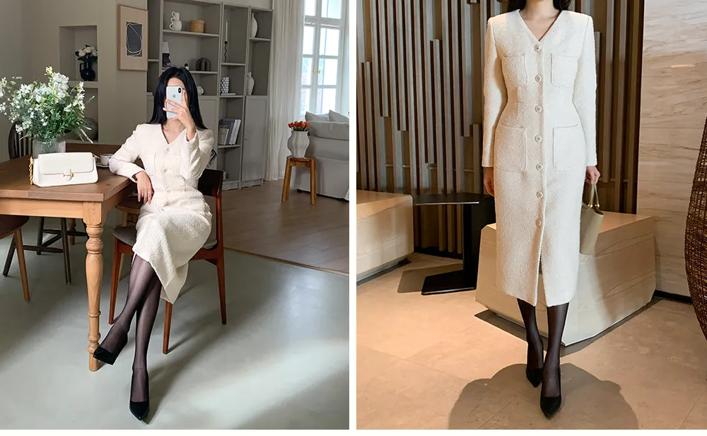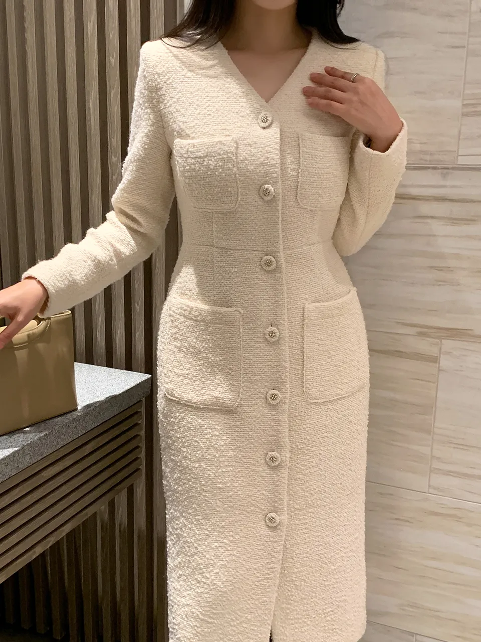 - ブクルテクスチャーとスリムなシルエットの調和で完成する高級なムード