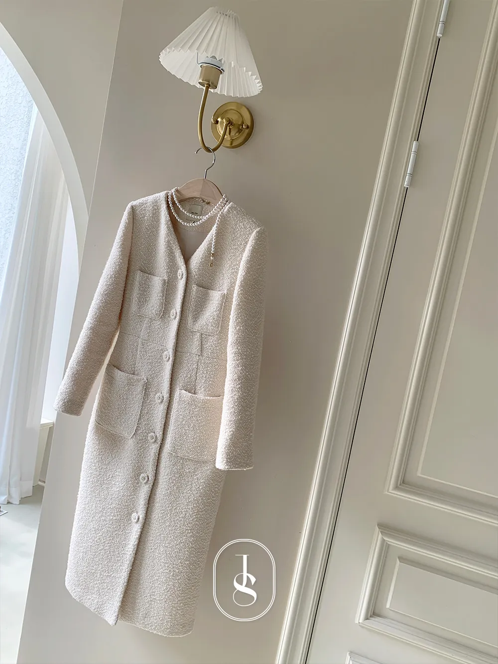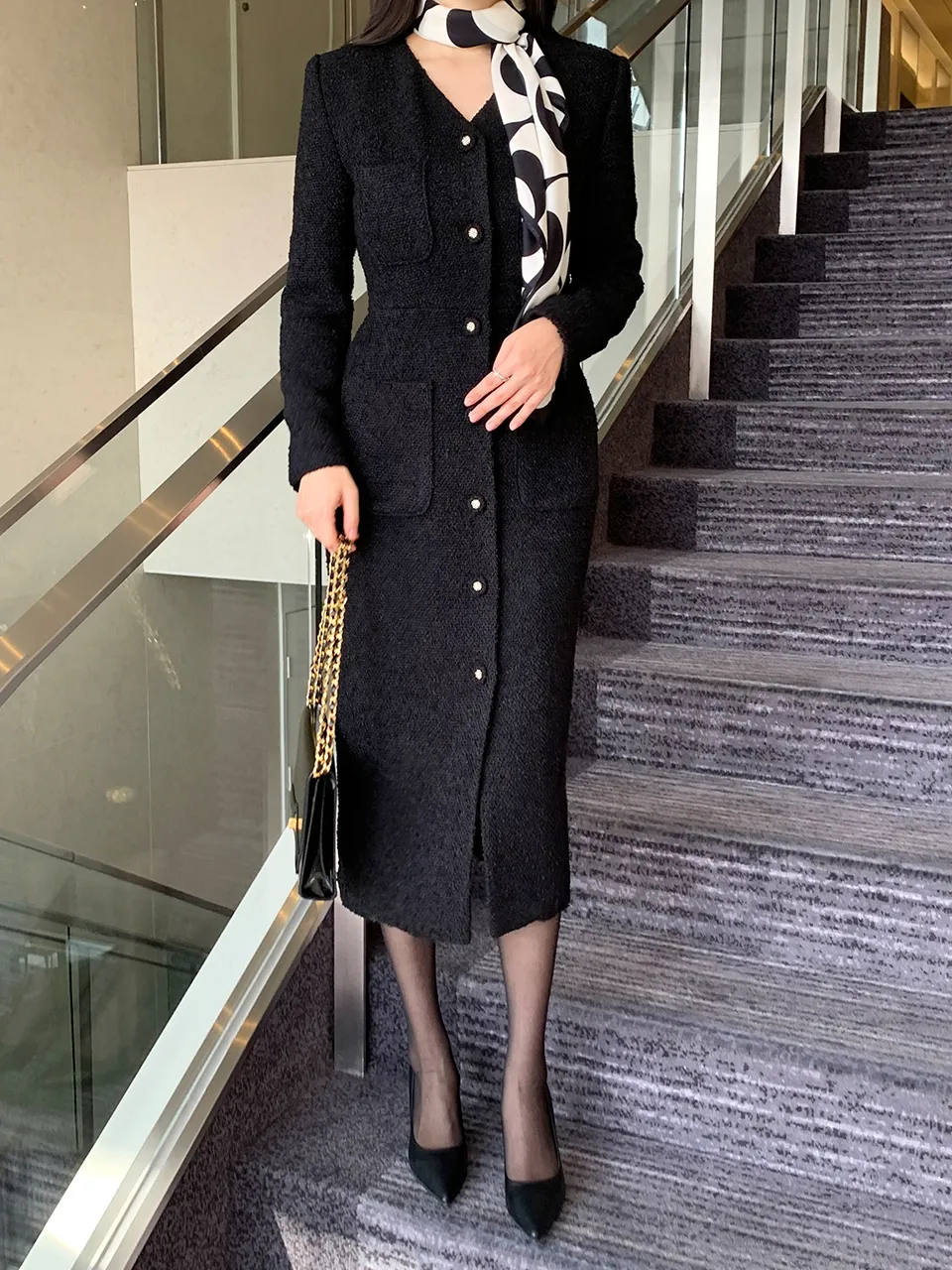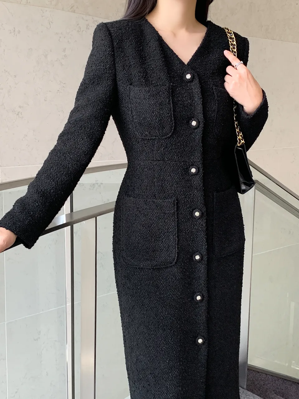 - ブクルテクスチャーとスリムなシルエットの調和で完成する高級なムード