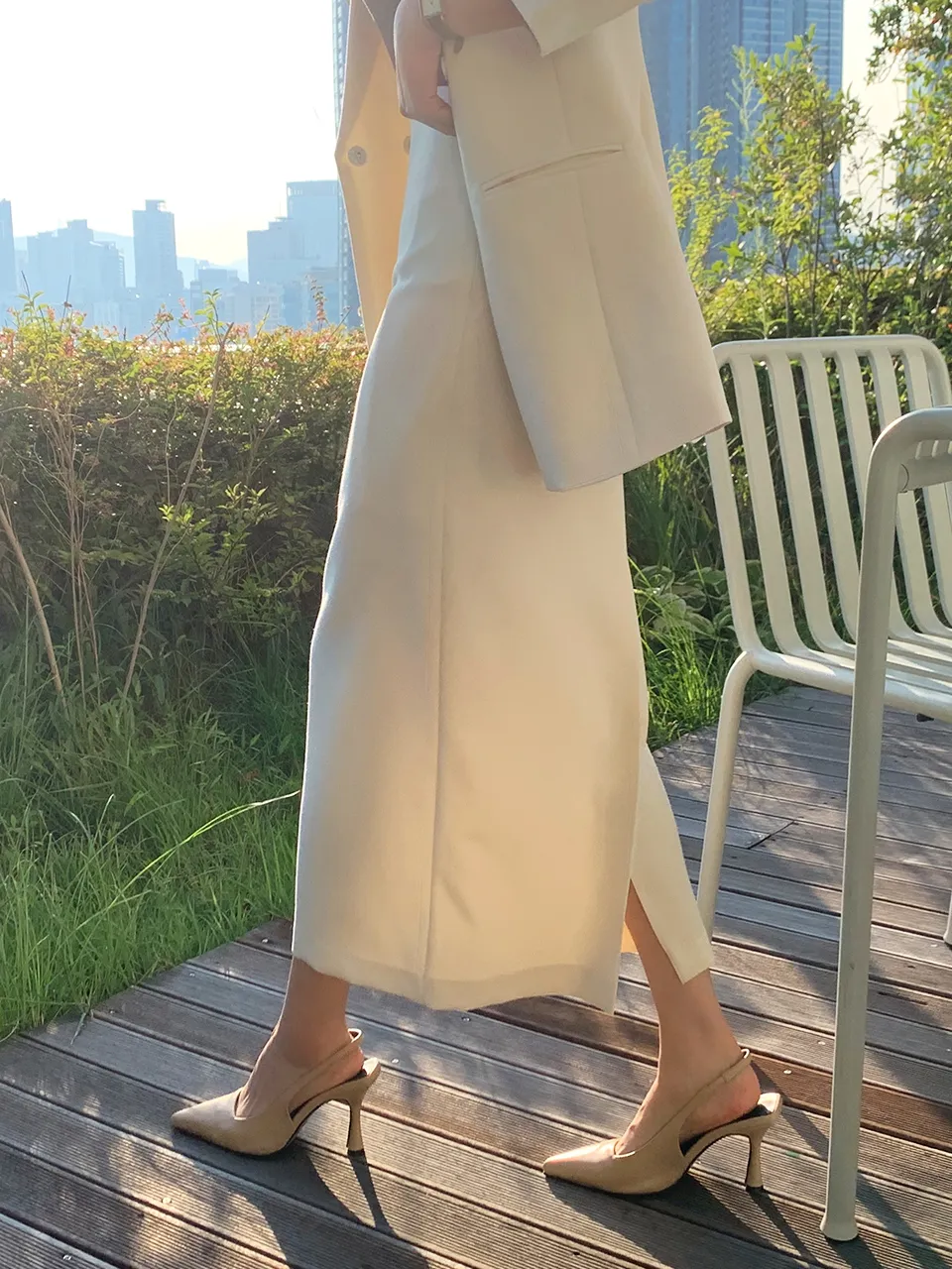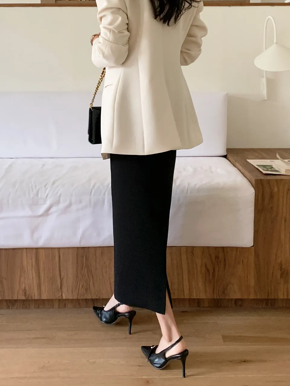 - 骨盤ラインを屈曲させ、フェミニンなHラインで女性らしいシルエットを完成