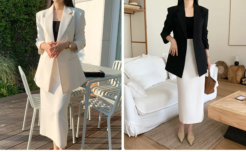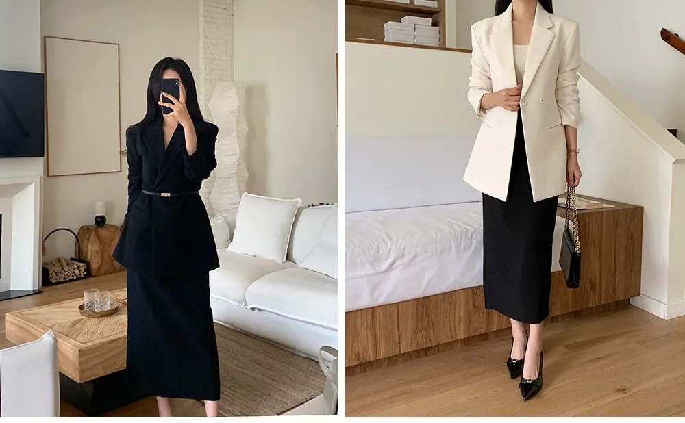 - Hラインとマキシ丈の調和で完成するエレガントで洗練されたボディライン