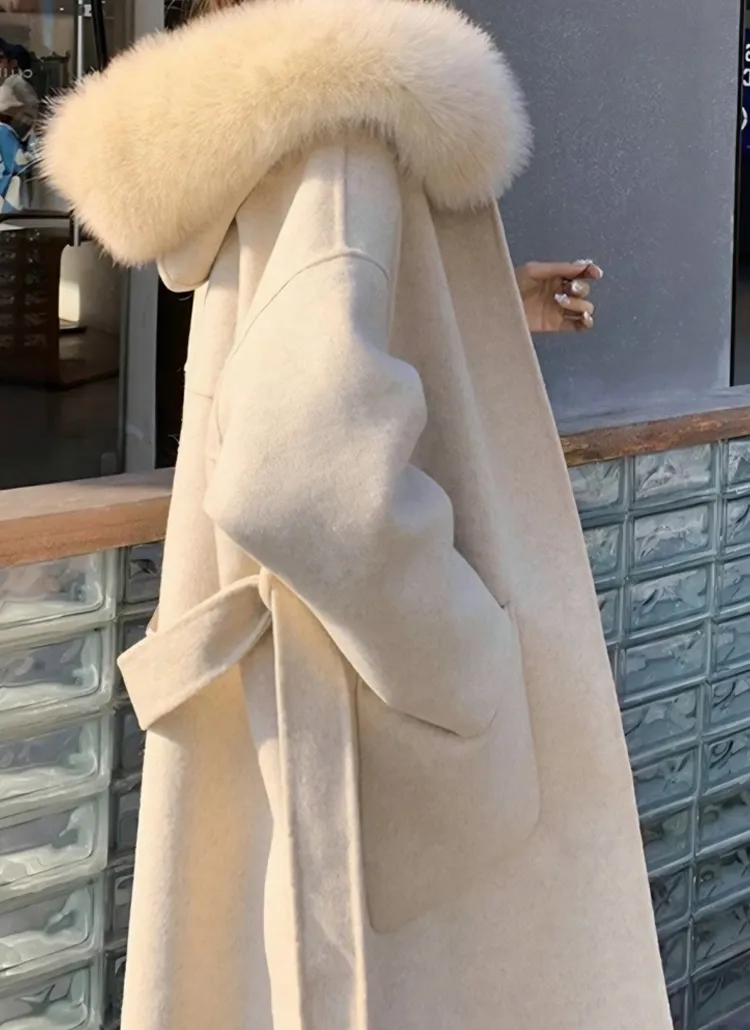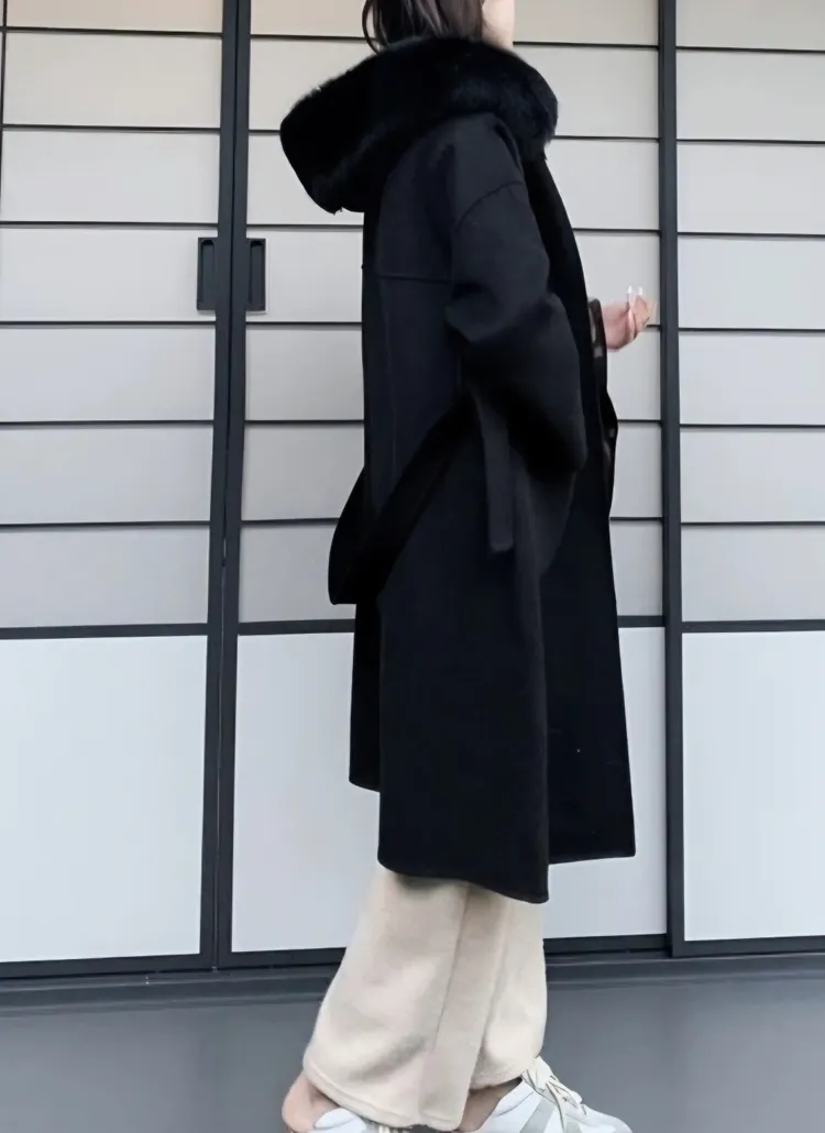 ウール混フォックスファーロングコートストラップ付・B1952369