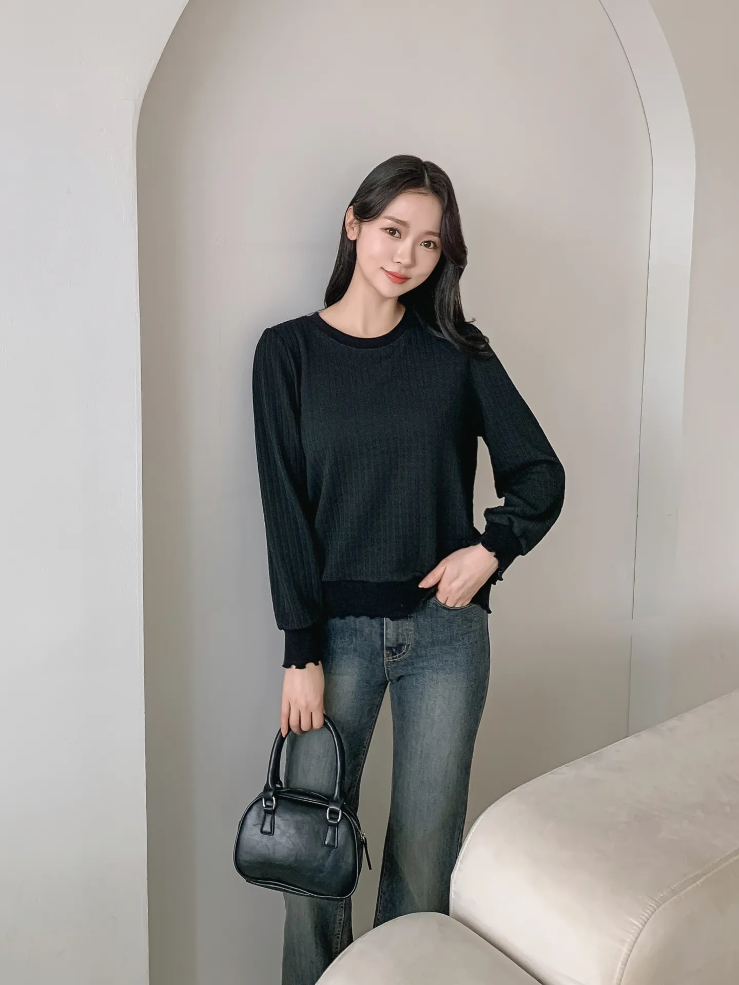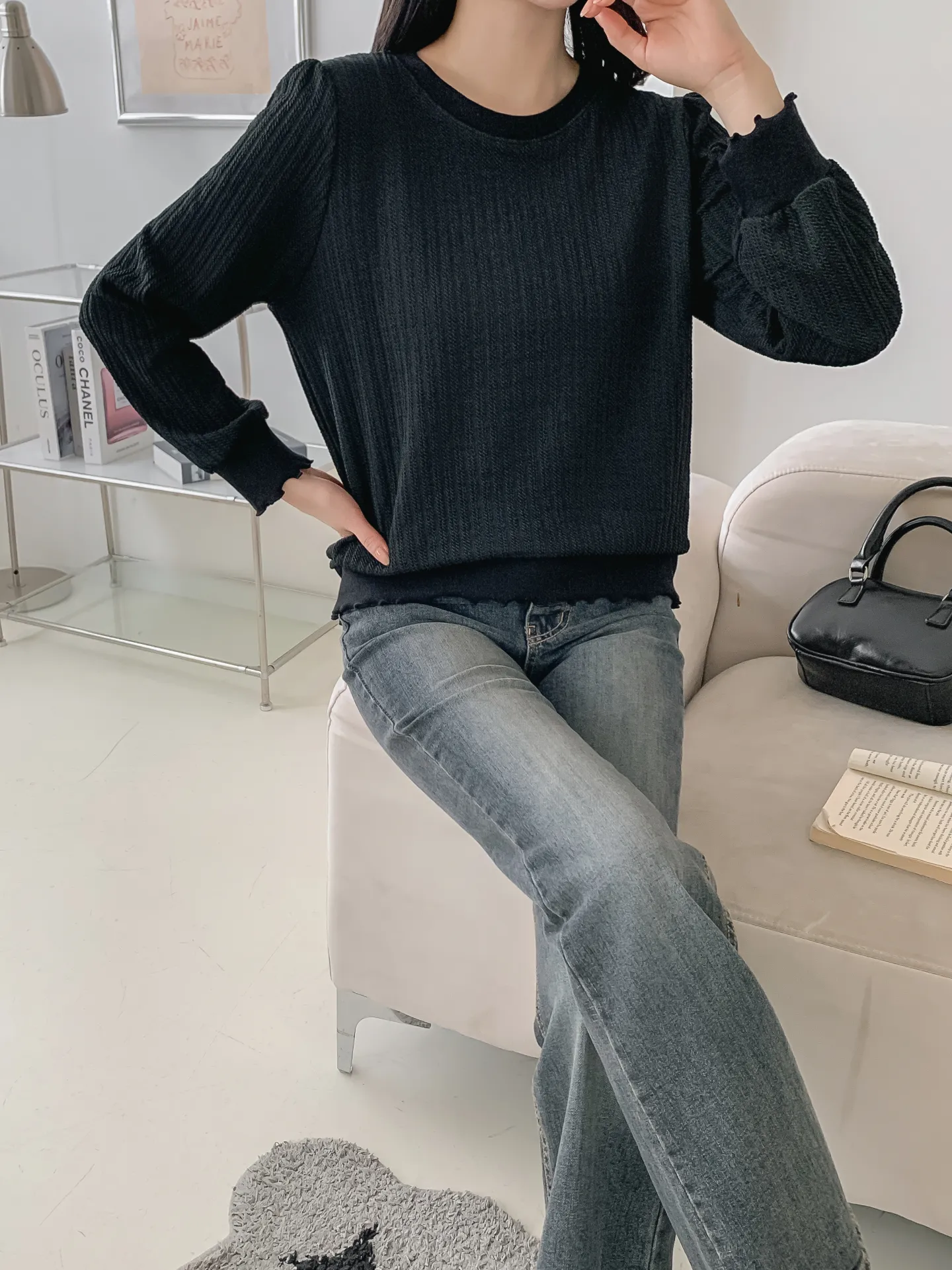 ラウンドネックメロウパフスリーブルーズ長袖Tシャツ・B1953289