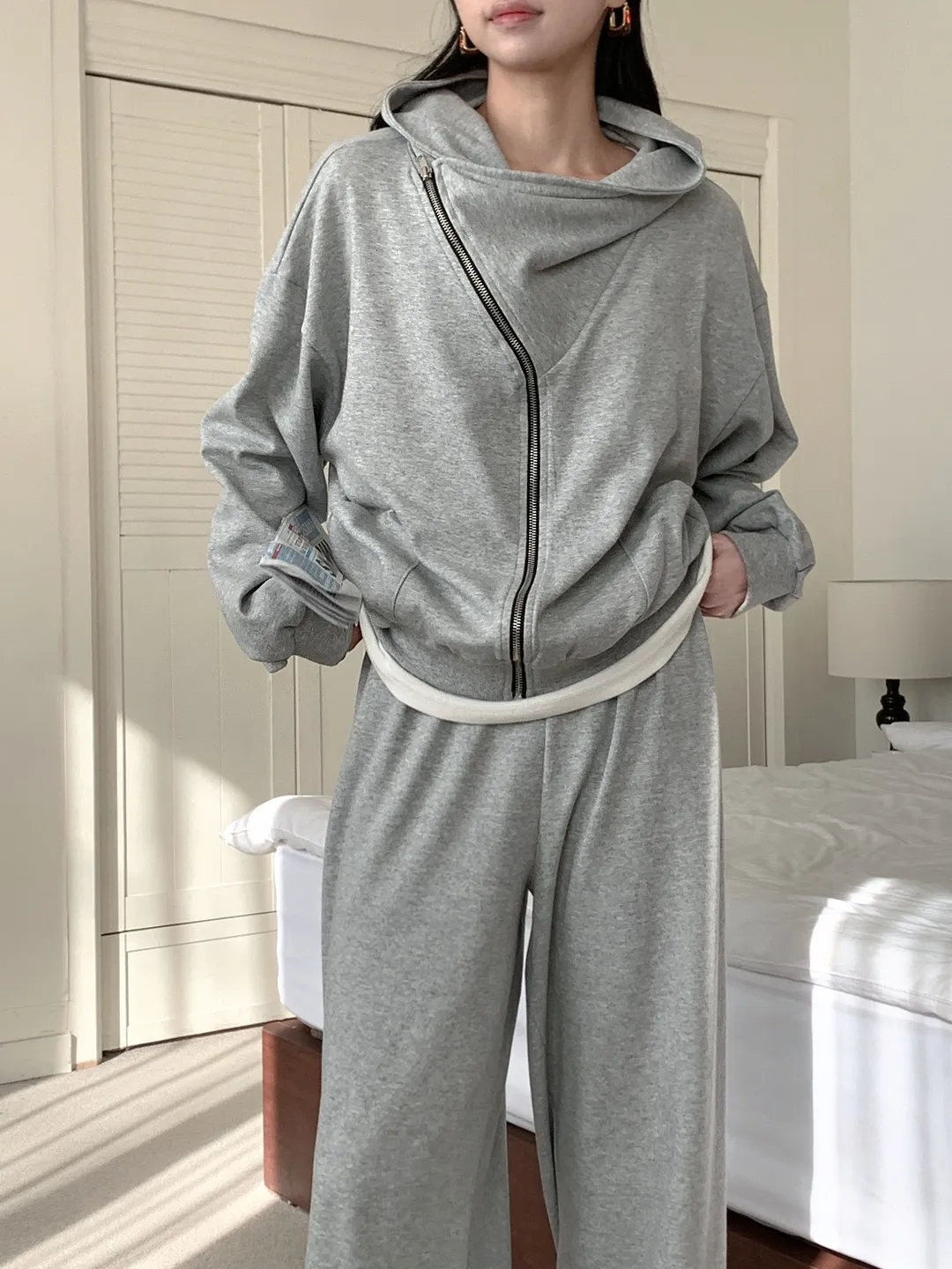 ニットフードダブルジップウエストゴムルーズ長袖ワイドツーピース(トップス、ボトムス)パンツジップパーカー